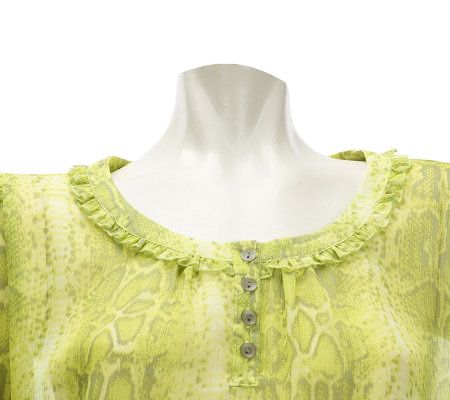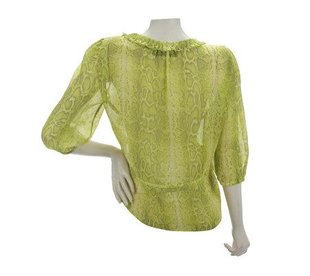 • Sheer python print; scoop neckline; 3/4-length sleeves with elastic cuffs; adjustable side tie