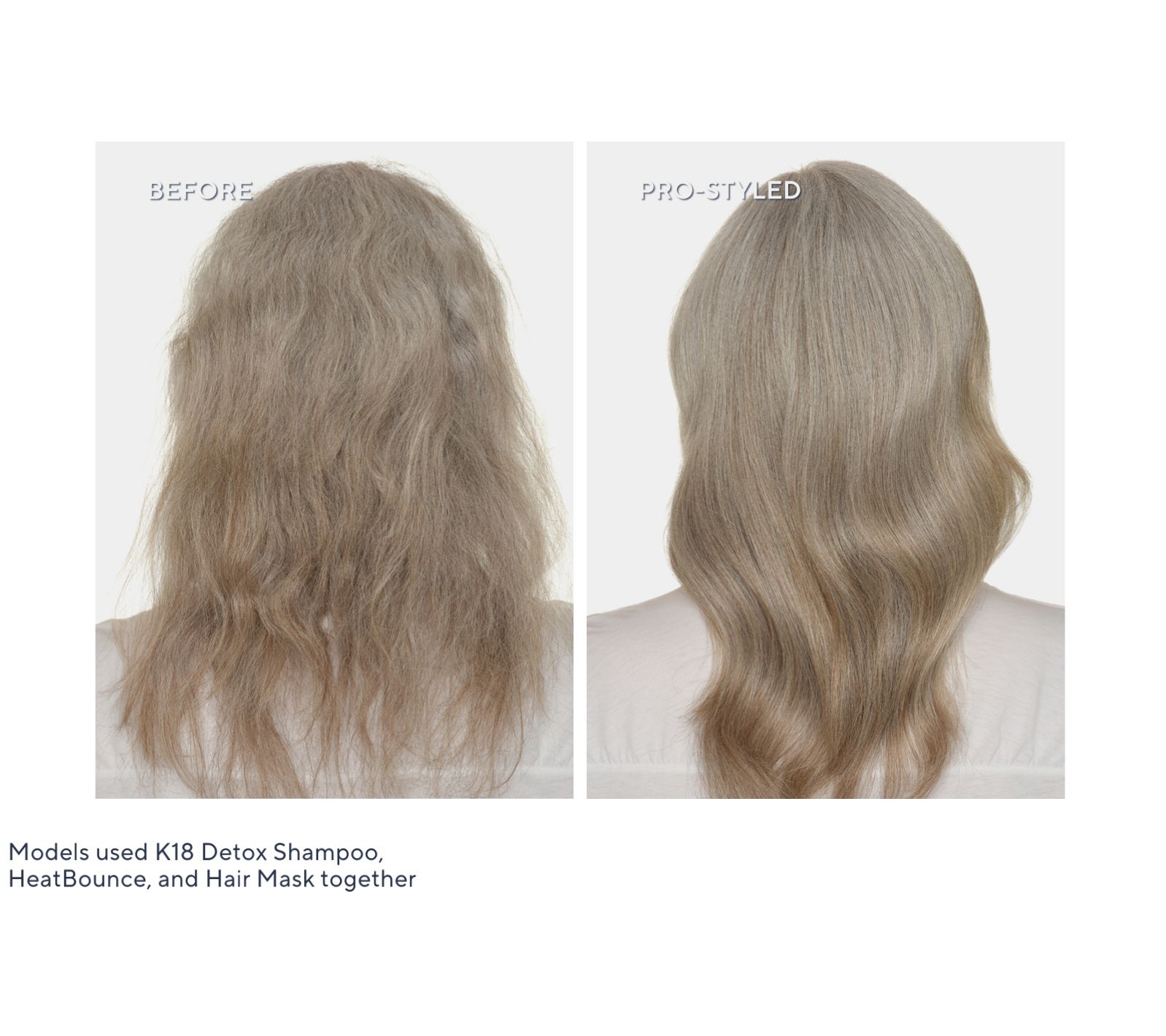 K18's leave-in HeatBounce Conditioning Heat Protectant detangles, softens, and delivers deep heat protection for 85% less breakage after blow-drying. The heat-shielding leave-in conditioner goes as deep as heat damage does to help protect from breakage. The conditioning blend conditions, softens, and detangles. Created for all hair types and textures. Can be used on extensions.