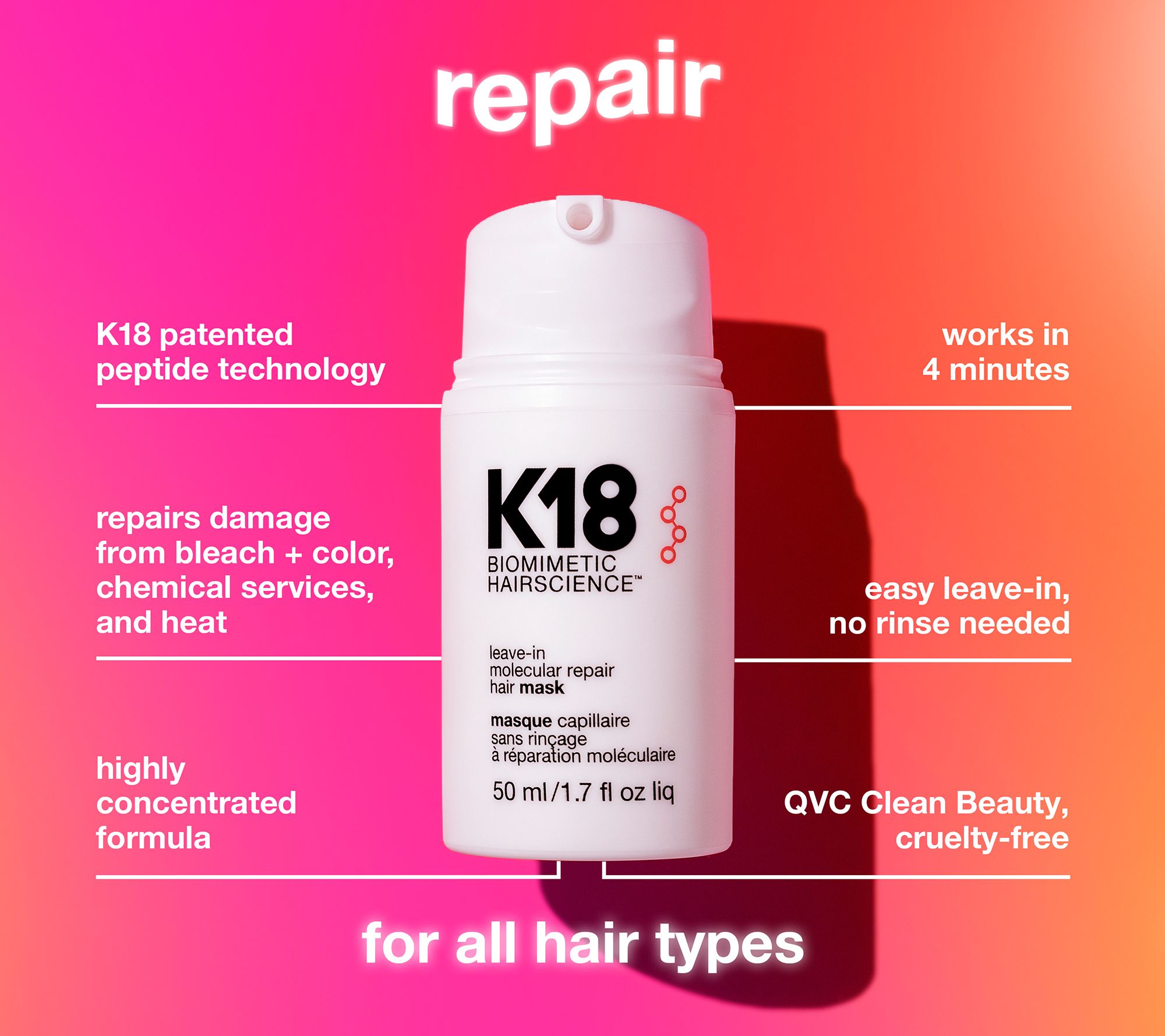 Follow with the Molecular Leave-in Hair Mask which works on all hair types. Formulated with K18's patented peptide technology, it's shown to help repair hair damage from bleach, color, and chemical services. It helps to restore strength and smoothness.