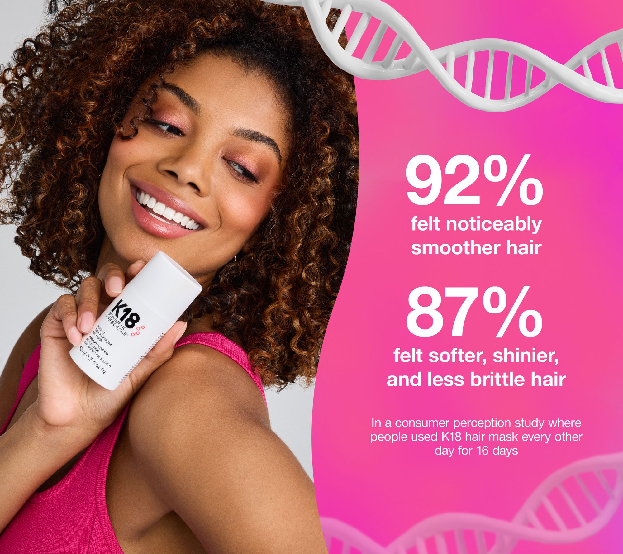 In a test, bleached and damaged tresses treated with K18 Molecular Hair Repair Mask was shown to restore hair's strength and elasticity to the pre-damaged state.