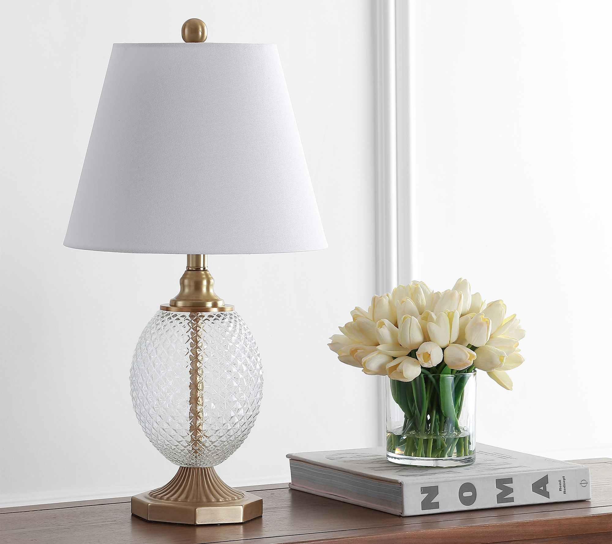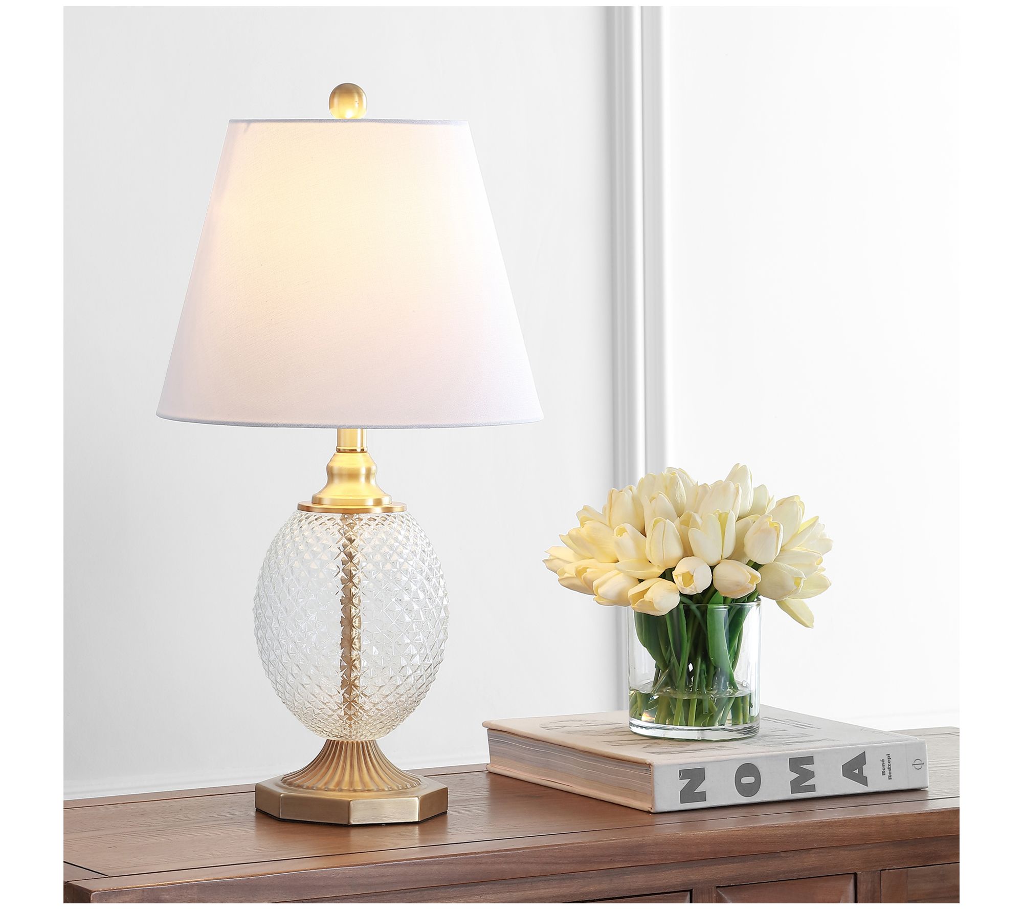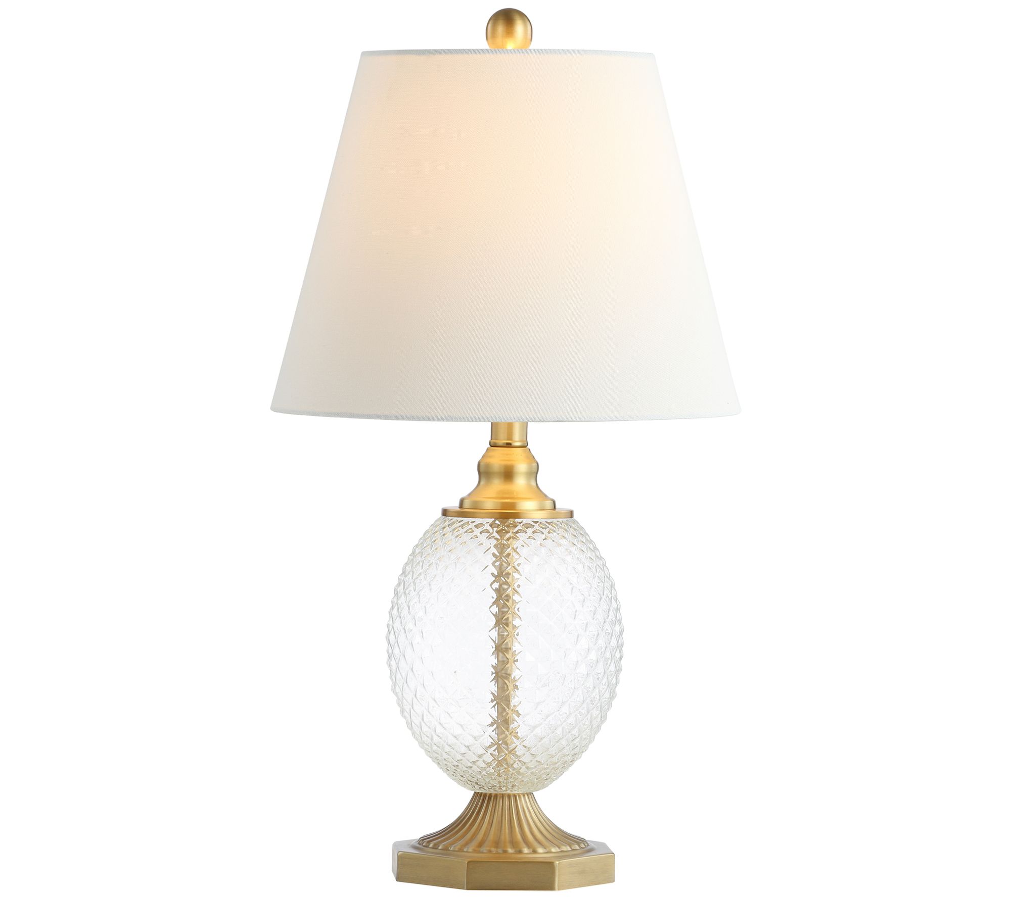 Let there be light! Bring soft illumination and sleek sophistication to your space with this modern table lamp featuring an artistic glass base and fabric shade. From Safavieh.
