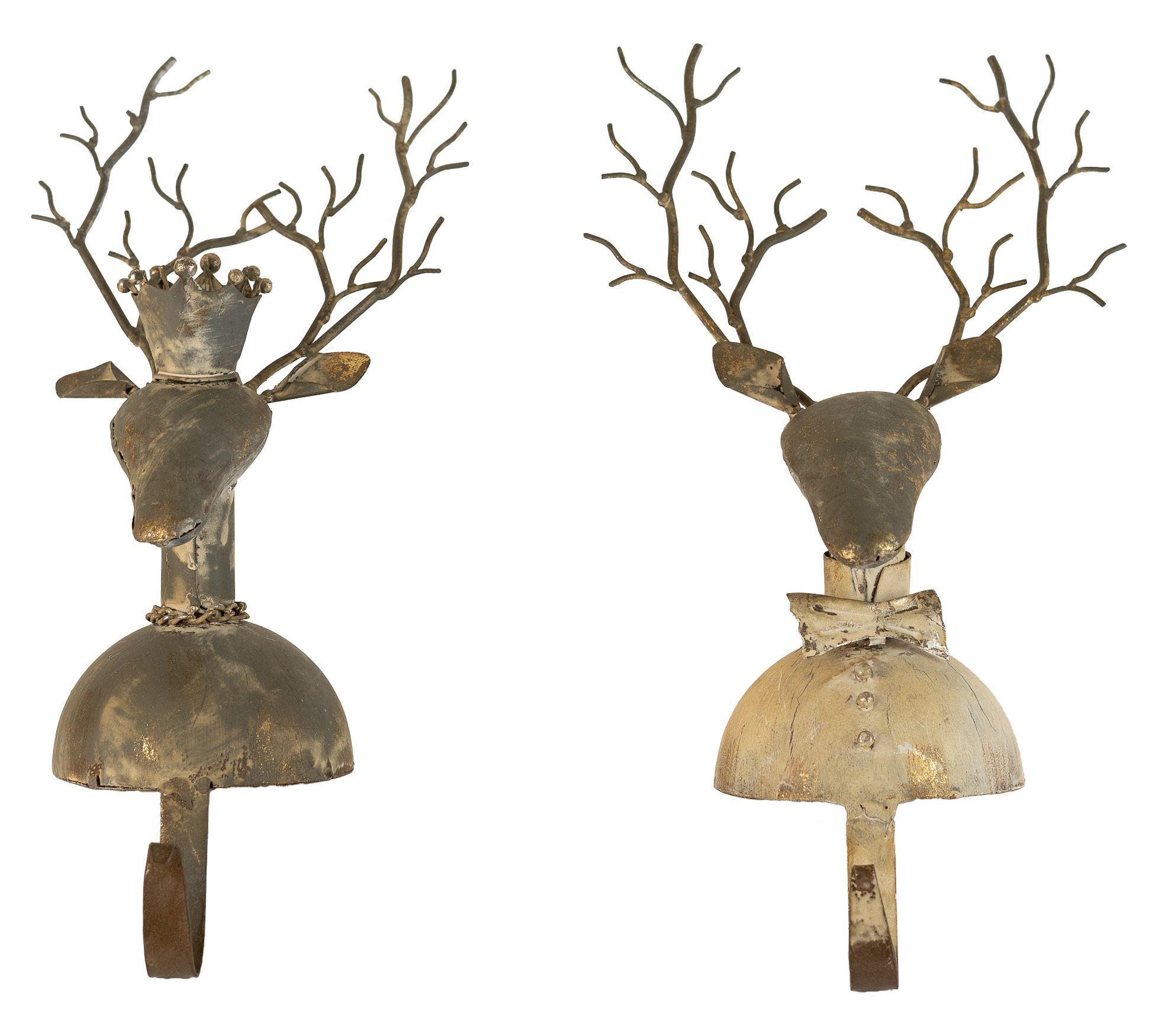 Let the charm of the season shine on your mantel with this set of two metal deer stocking holders, featuring whimsical male and female designs -- one donned with a bow tie, the other with a crown. Their whitewashed finish creates a cozy touch, adding both function and holiday flair to your decor. From Kalalou.