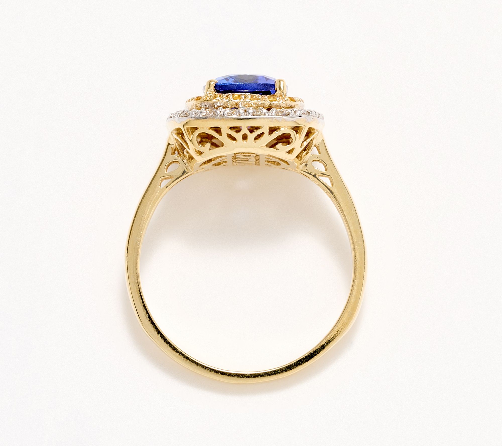 Cushion-cut tanzanite in center; yellow sapphire and prong-set white diamond accents; polished finish