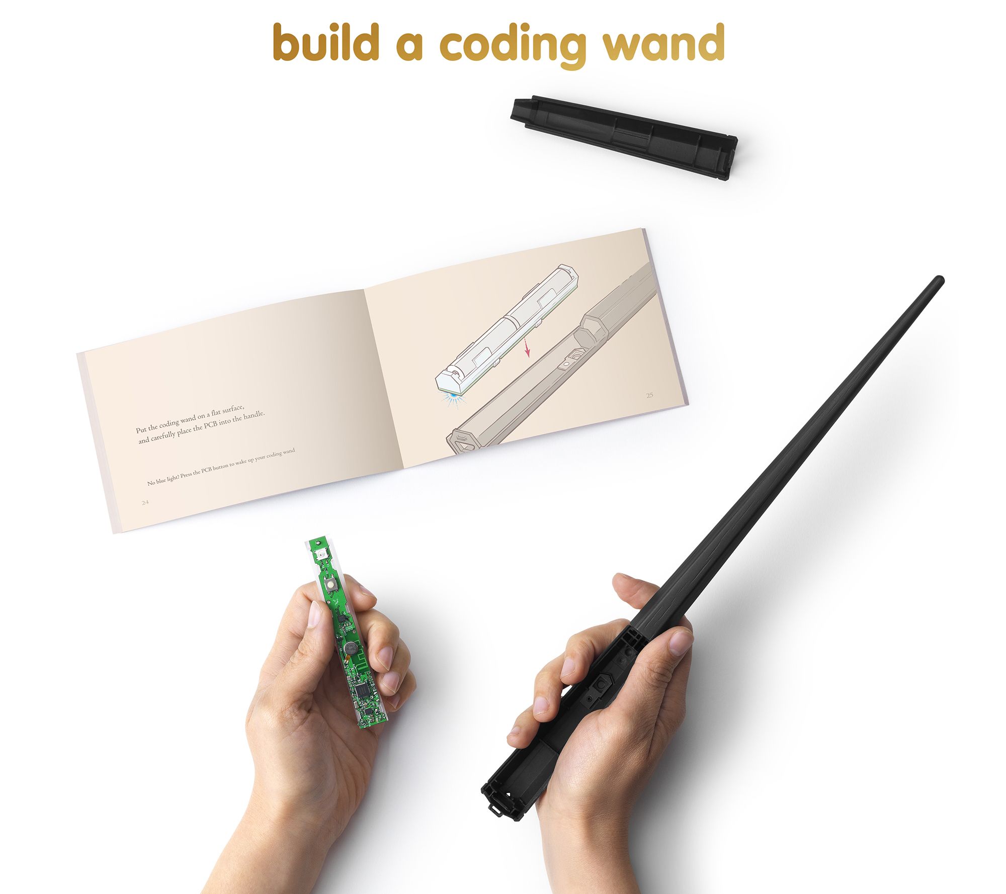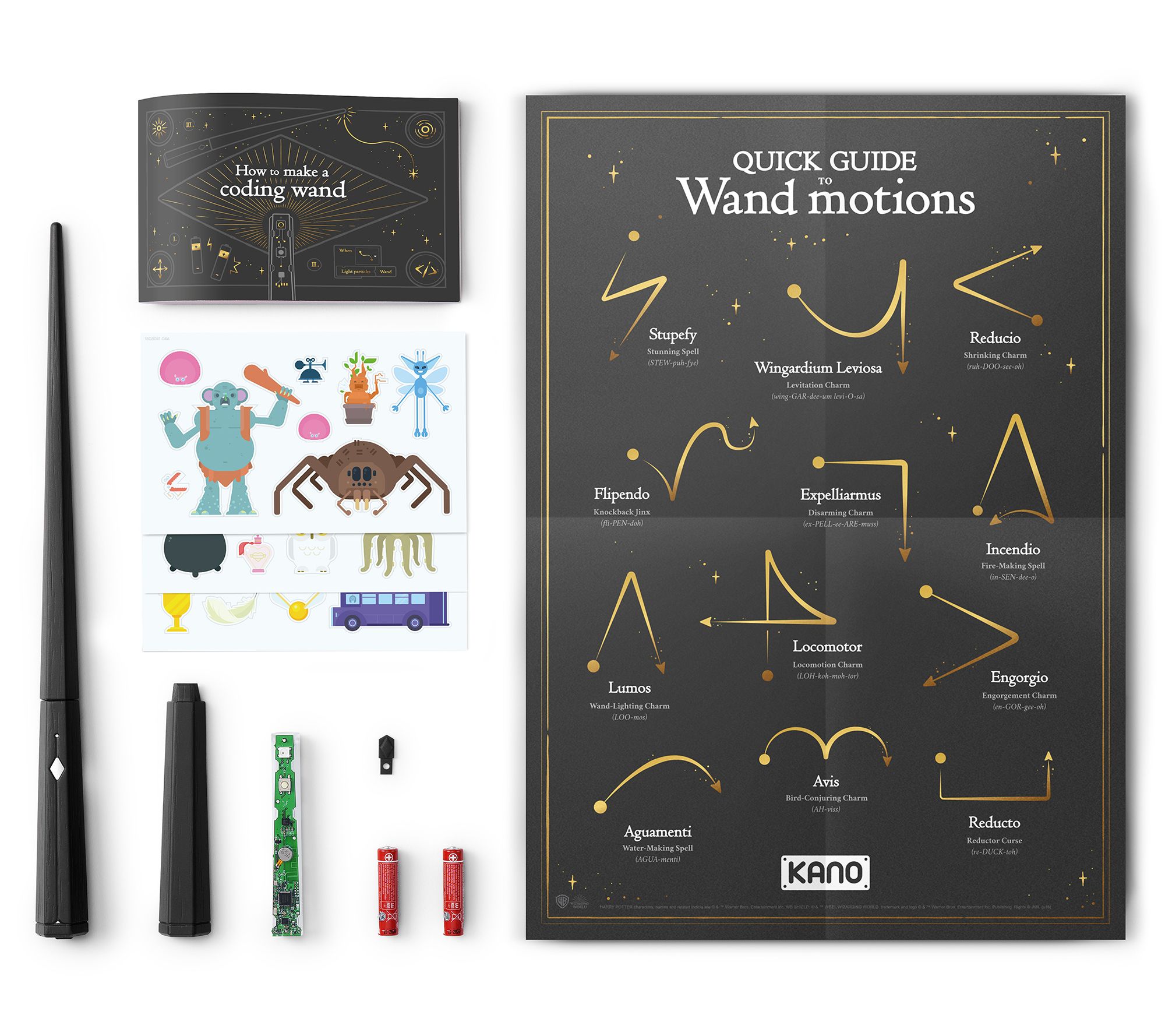 Includes coding wand tip, coding wand handle, coding wand brain, four AAA batteries, lanyard, button, book, stickers, and poster