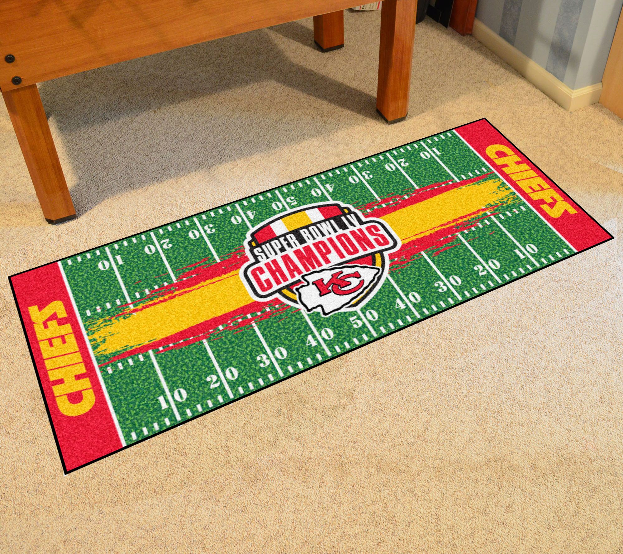 Chiefs for the win!! With this field runner mat sporting your team's logo, put your pride on display and plaster your fandom for the Super Bowl champs on any floor space.
