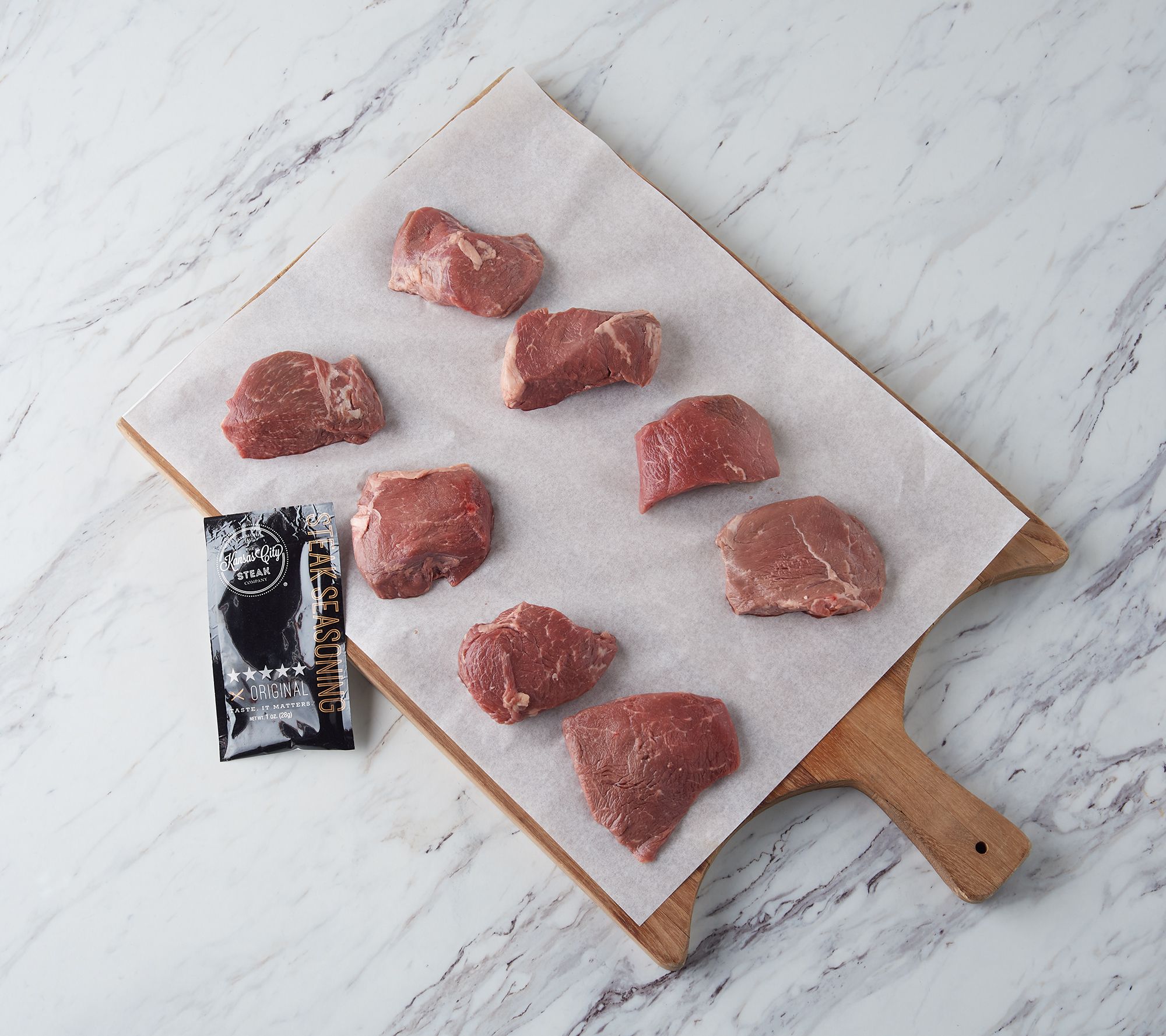 • Includes eight 5-oz top sirloin steaks, 1-oz seasoning packet, and Kansas City Steak cooking instructions