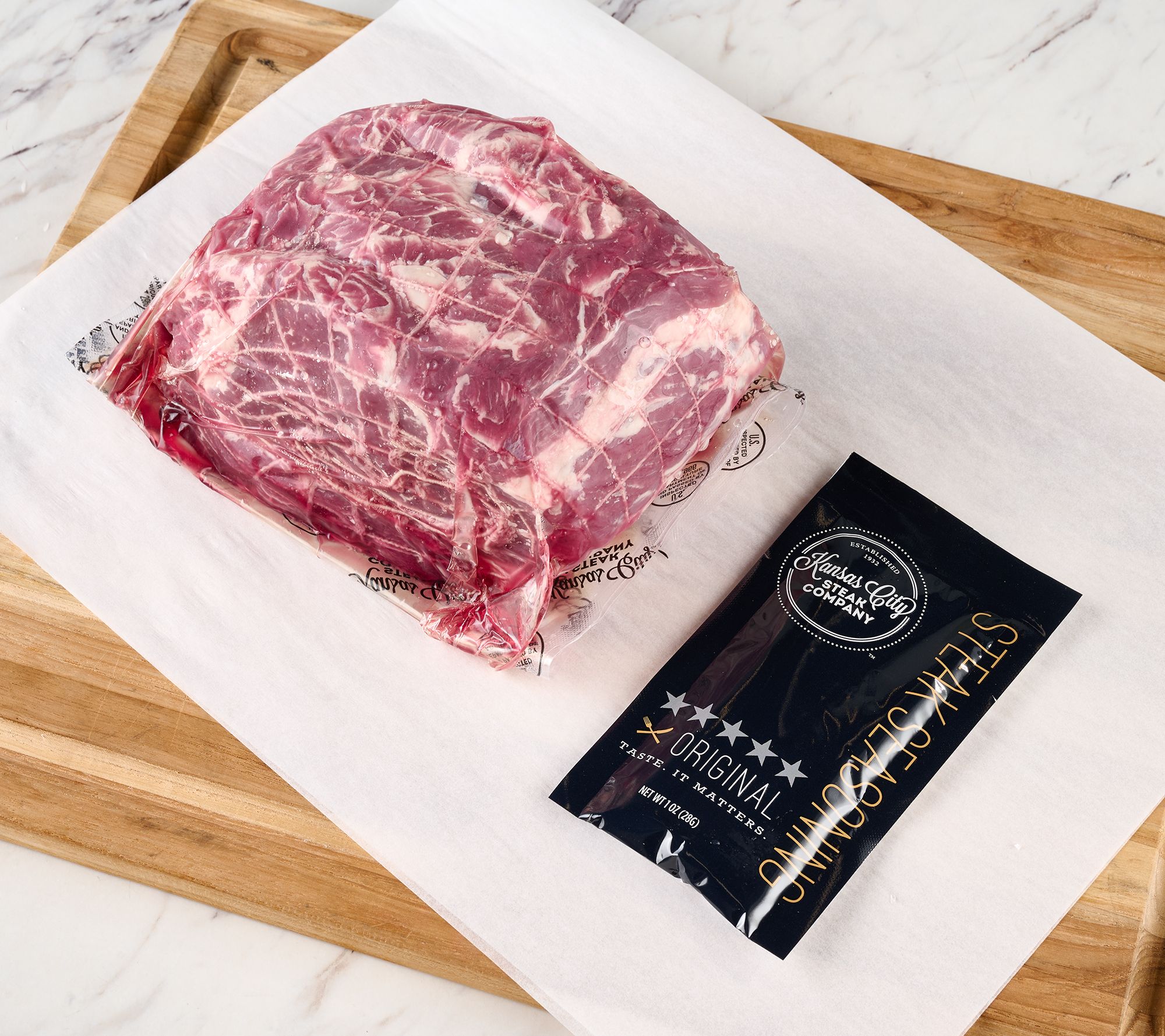 Includes 3.5-lb to 4-lb prime rib roast, Kansas City Steak seasoning packet, and Kansas City Steak prep guide