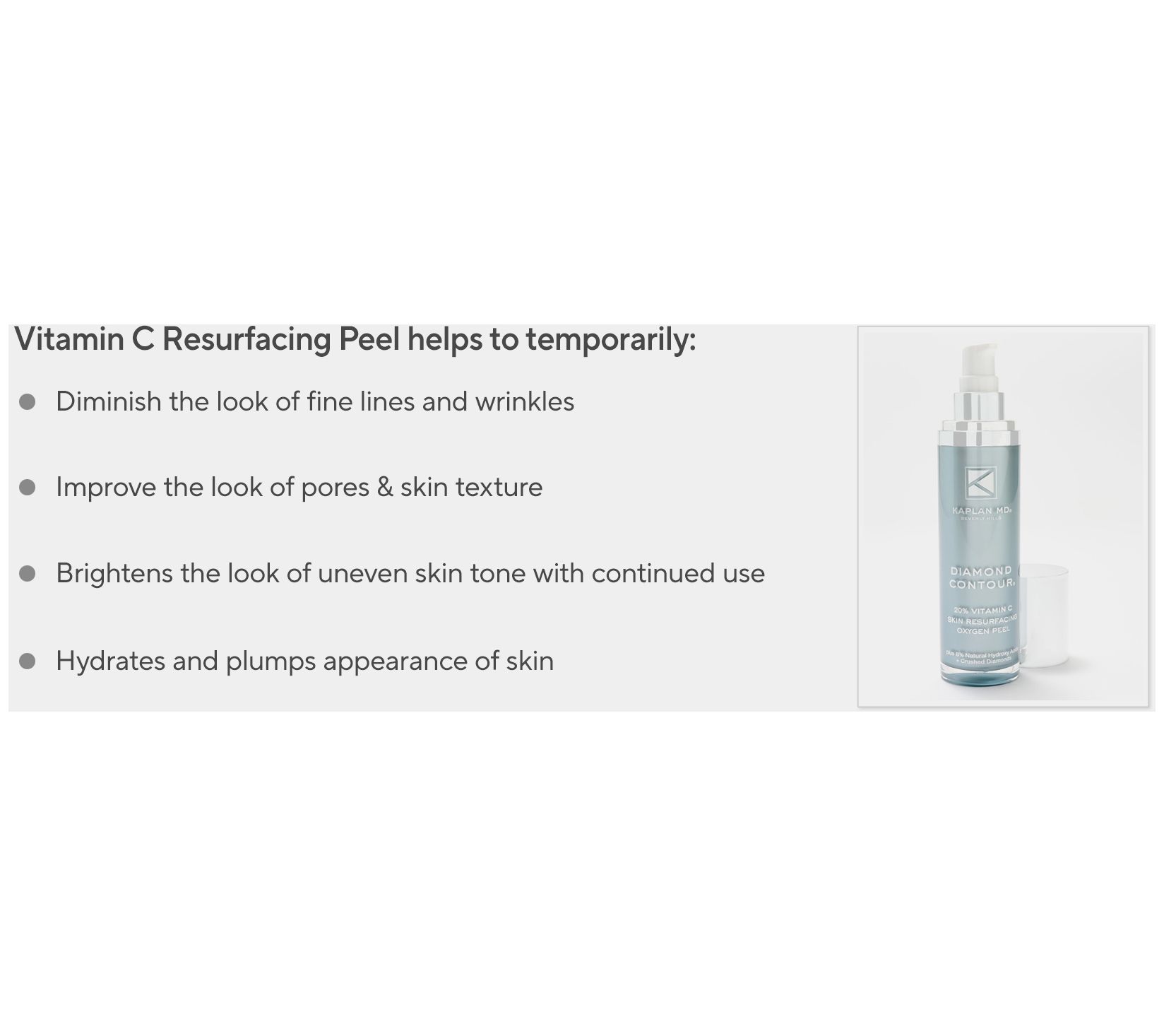 KAPLAN MD Diamond Contour 20% Vitamin C Resurfacing Oxygen Peel is a 4-in-1 anti-aging skin treatment that helps to temporarily diminish the look of fine lines and winkles, temporarily improves the look of pores, temporarily improves the look of skin texture, and temporarily brightens the look of uneven skin tone with continued use.