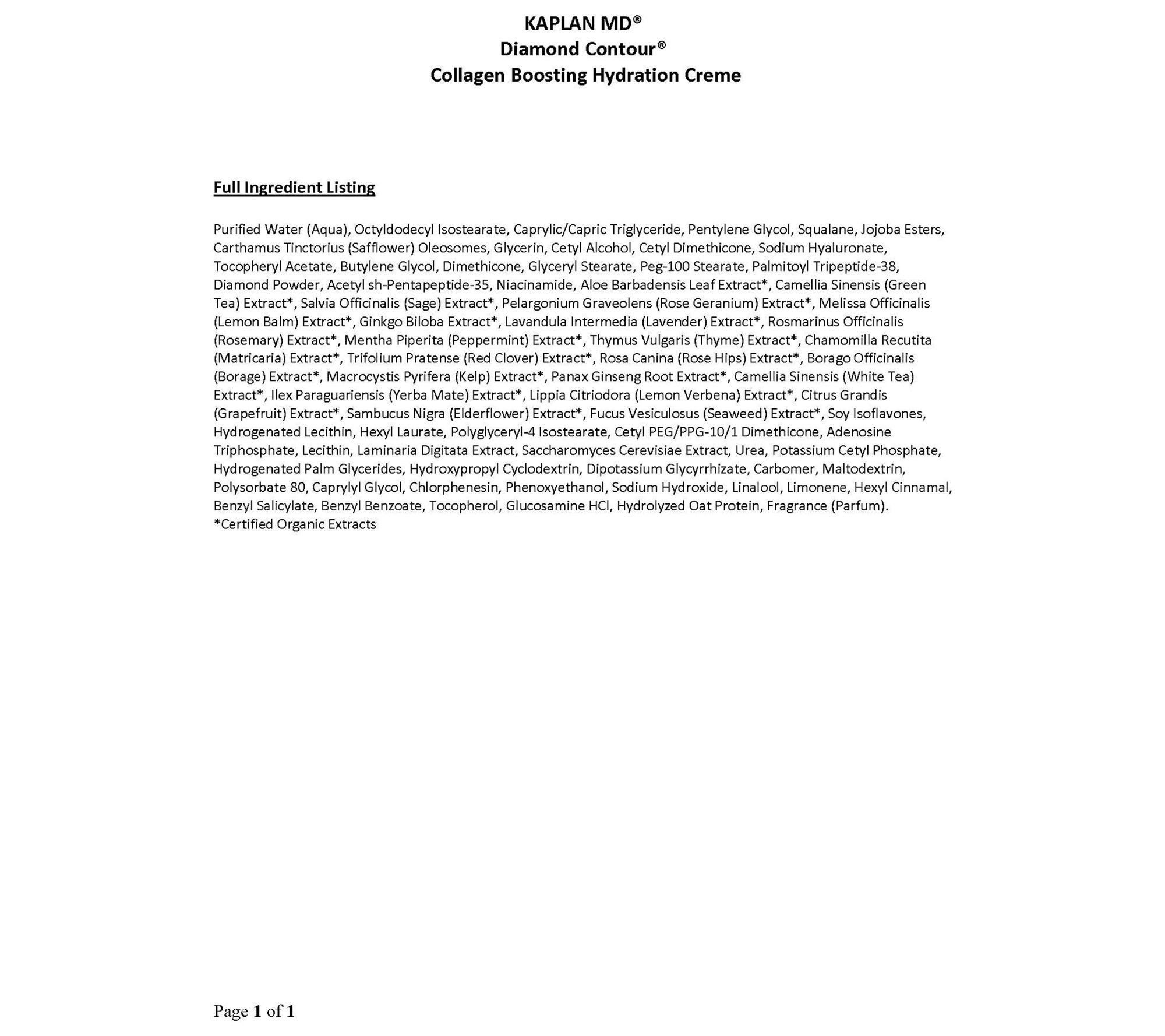 Diamond Contour Collagen Boosting Hydration Creme is a luxurious anti-aging beauty treatment that replenishes critical moisturize. This beauty facial moisturizer has been shown to instantly hydrate the skin, while reducing the appearance of fine lines and wrinkles for a more youthful look. Formulated with Dr. Kaplan's Diamond Contour Technology to transform the look of skin with powerful combinations of key ingredients, it contains crushed diamonds to smooth and brighten the skin, five moisturizing factors to quench skin with hydration, and an extract complex to nourish and rejuvenate the skin. The result is a smoother, more radiant, youthful-looking complexion.