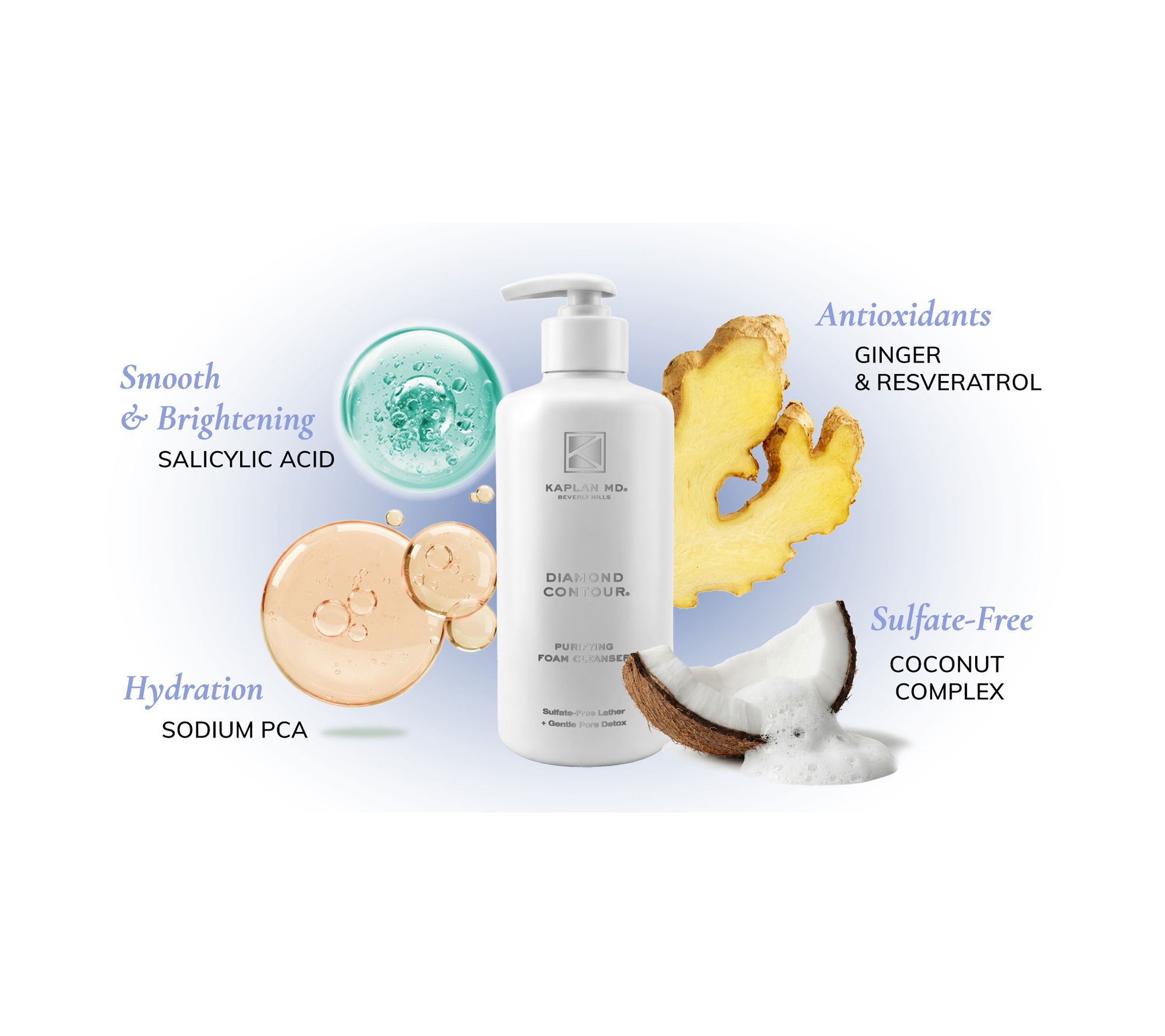 Diamond Contour Purifying Foam Cleanser by KAPLAN MD is a foaming gel cleanser that effectively clears away skin-clogging debris such as makeup residue and dead surface cells. Dr. Kaplan’s innovative Coconut Complex provides a luxe, sulfate-free foaming technology that allows for cleaning. It's formulated with ginger root and salicylic acid to improve the look of pores while leaving skin soft and smooth.