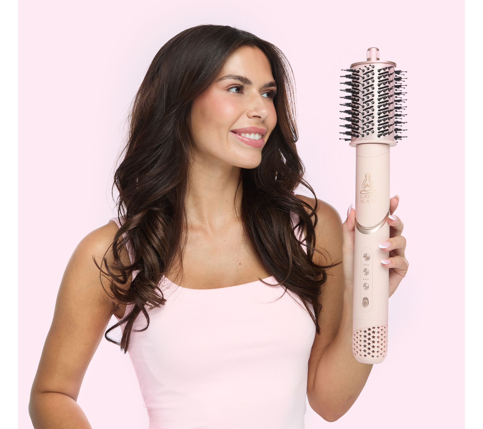 The Karma Kraze 5-in-1 Air Styler set includes five interchangeable styling heads for any look and all hair types. Say goodbye to juggling a dryer and brush -- style effortlessly in one step. Achieve smooth, healthy-looking results with quick drying speed, complete with an ergonomic rotating handle for professional-quality results at home. Use the concentrator nozzle for quick drying and sleek straightening, curling barrel for effortless spiral curls, straightening comb to smooth and detangle for a polished finish, or the round brush to smooth, reduce frizz, and add volume and bounce while providing powerful airflow.