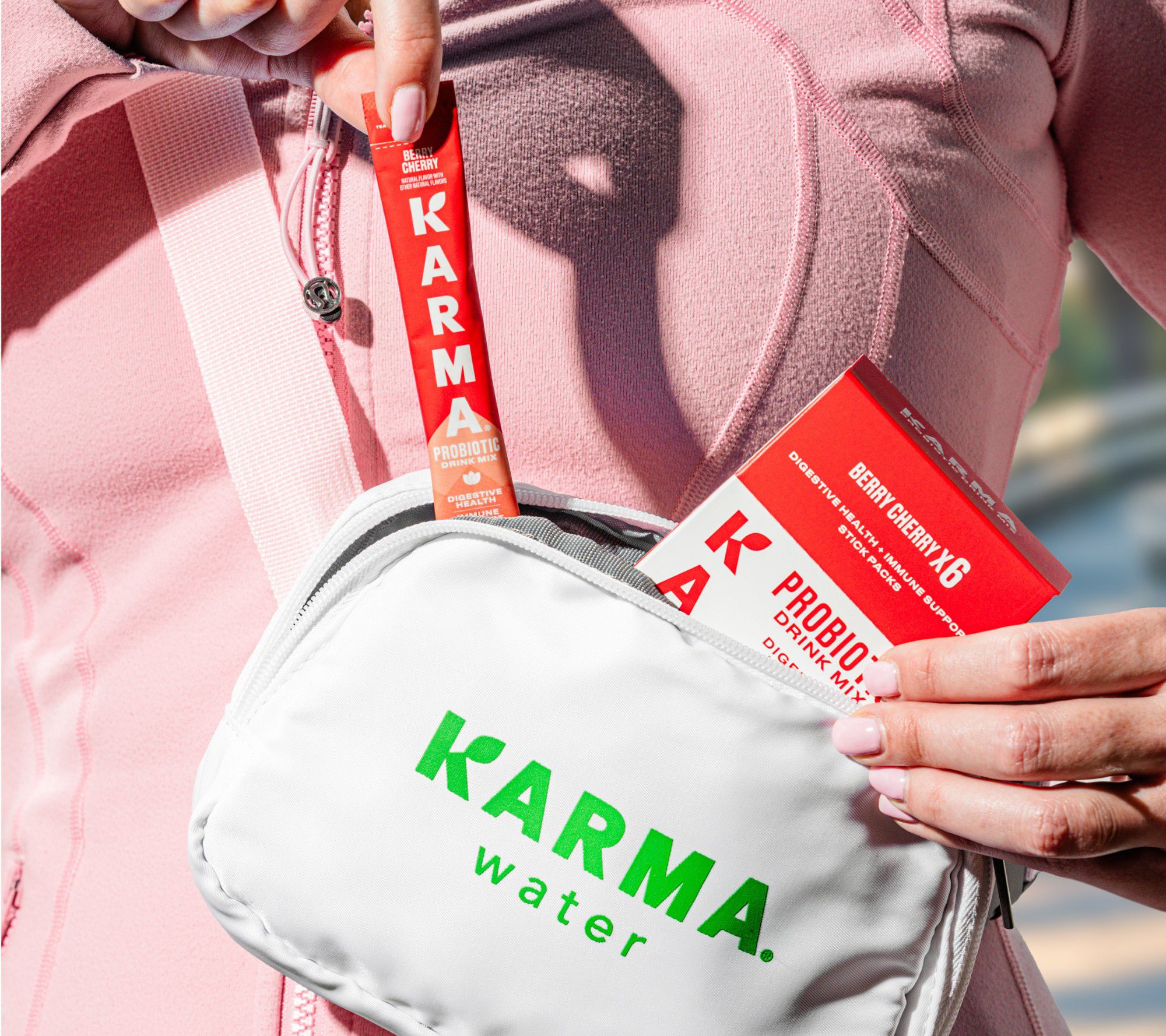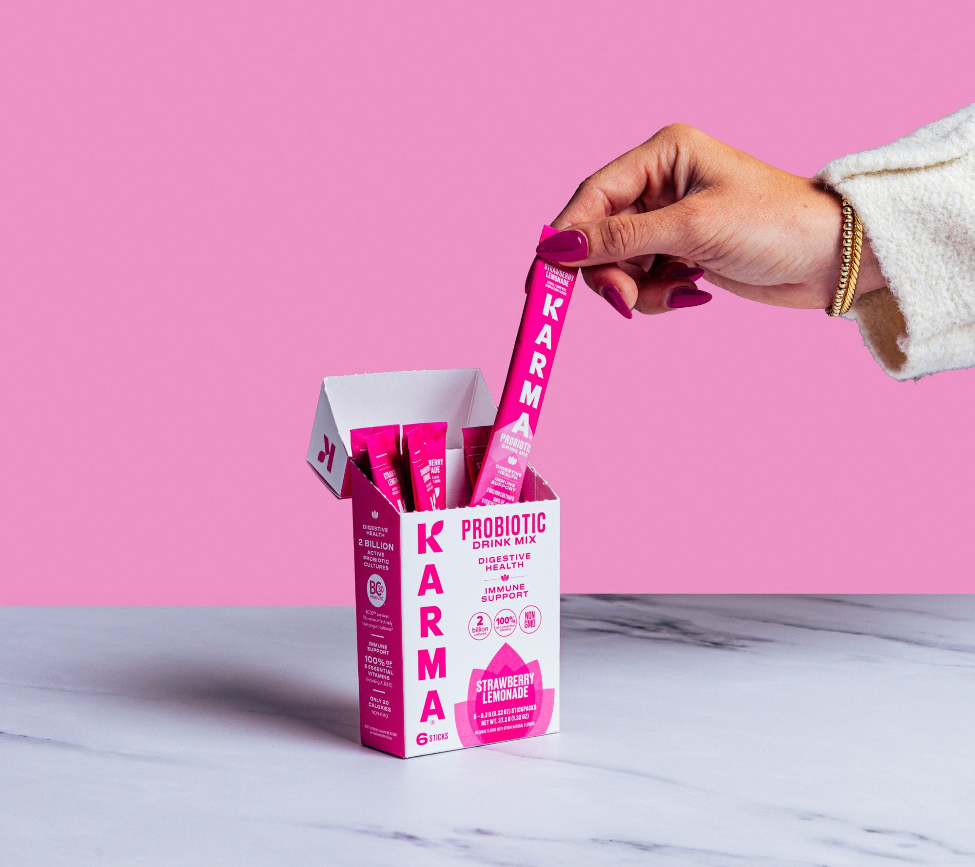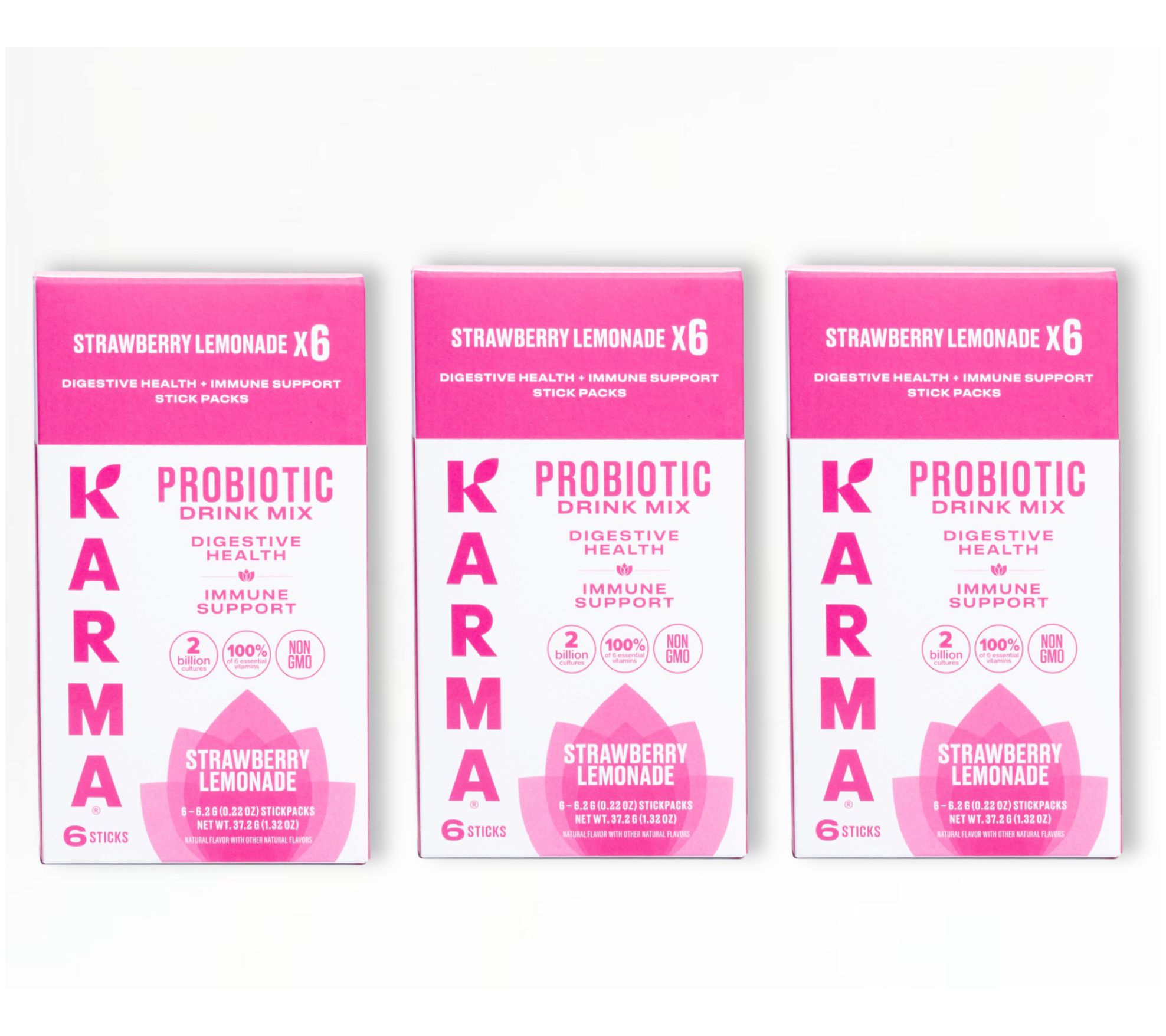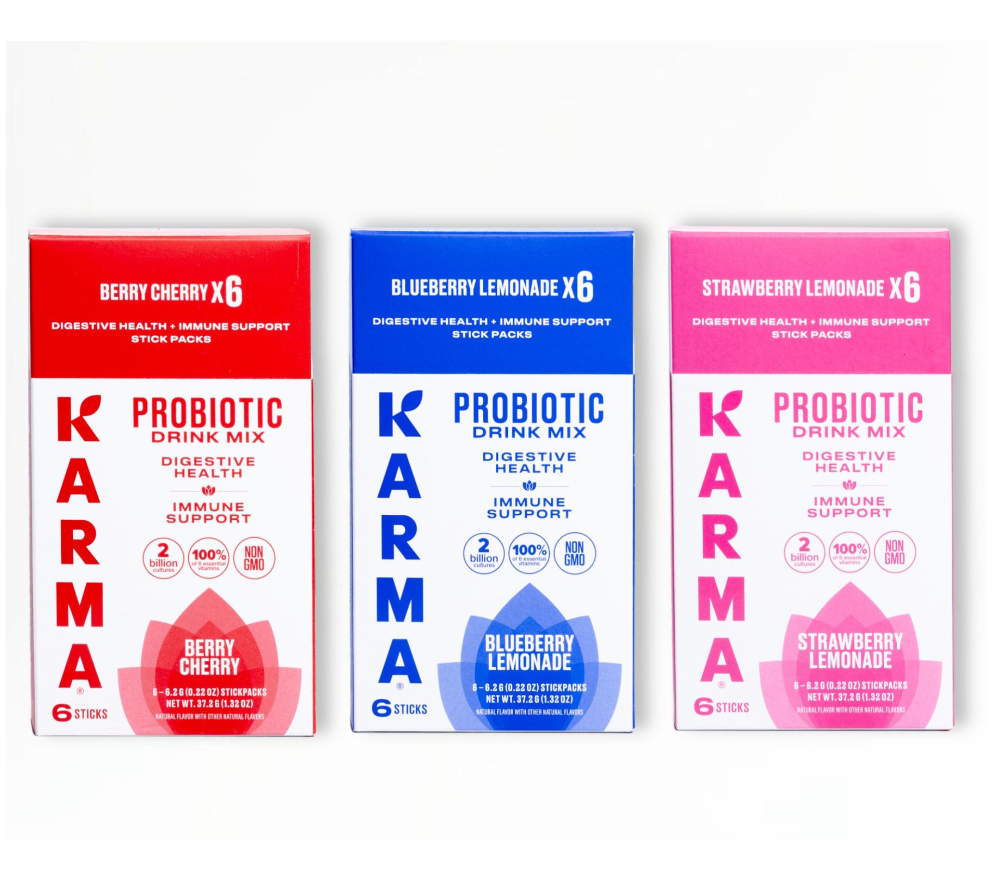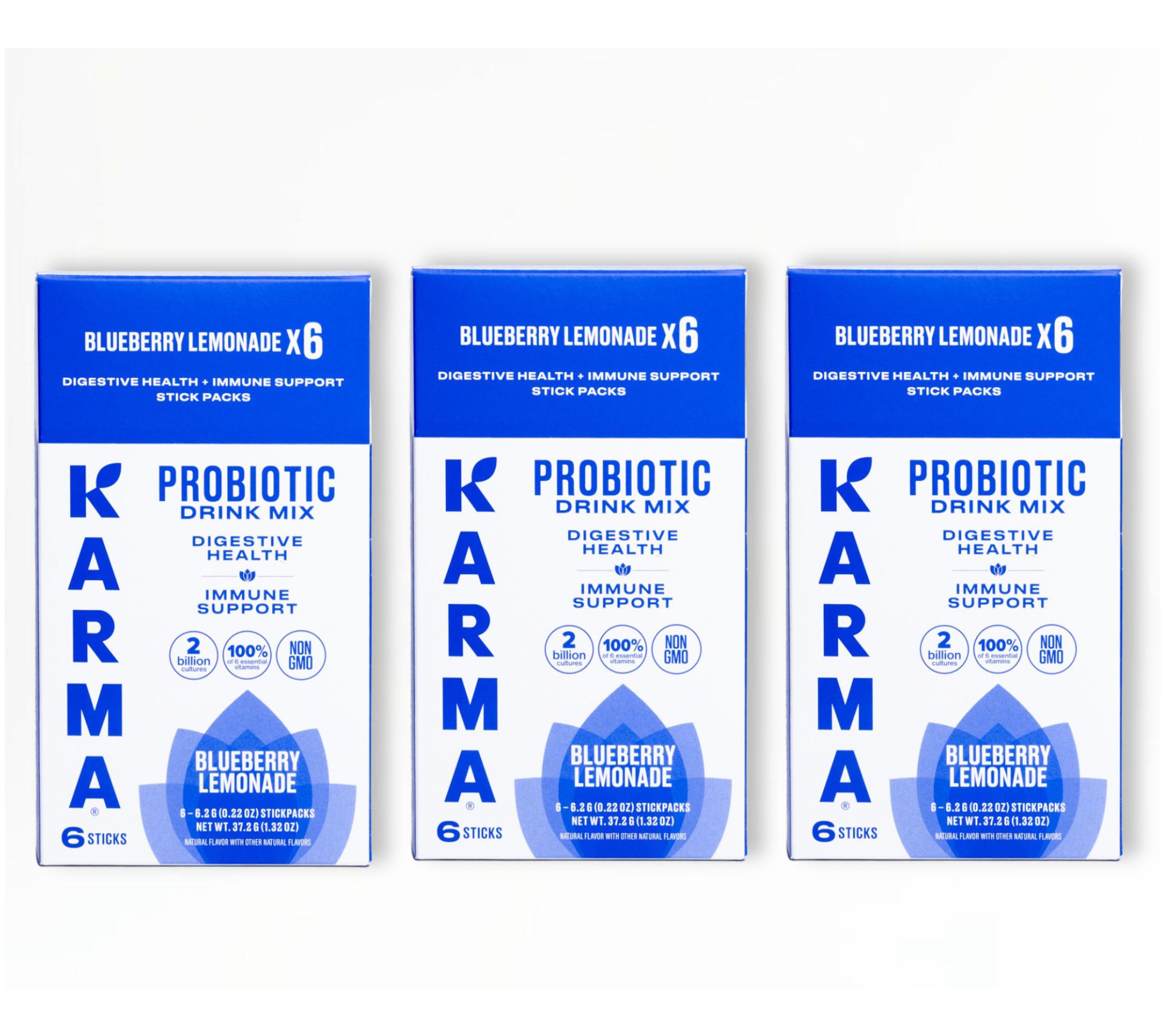 There's a tastier way to take your vitamins. Karma Probiotic powder sticks deliciously deliver 100% daily value of A, E, B3, B5, B6, and B12. That's six essential vitamins! Containing probiotics that may support digestive health, this drink mix comes in convenient powder sticks ready to enjoy anytime you need a quick pick-me-up. Just add a stick pack to a glass of water, stir, and enjoy! From Karma.