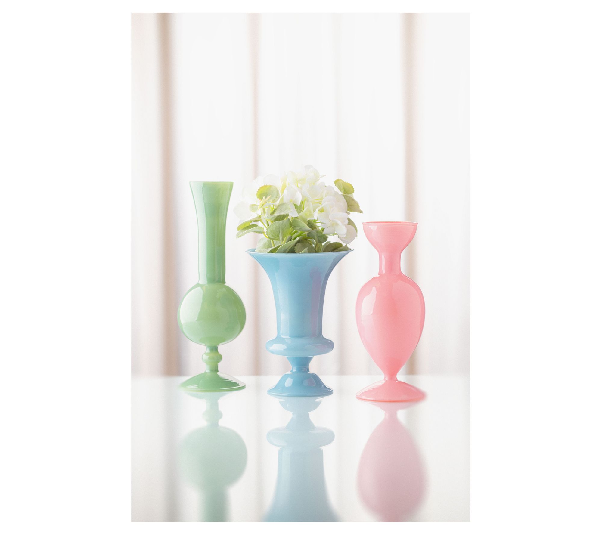 Let this tulip glass vase grace your coffee table or mantel, its chic design a conversation starter at every gathering. Whether filled with vibrant blooms or standing solo, it effortlessly transforms any room into a gallery of sophistication. Its playful colors and adaptable size ensure it finds a cozy spot on any flat surface, bringing charm to your home. From Karma.