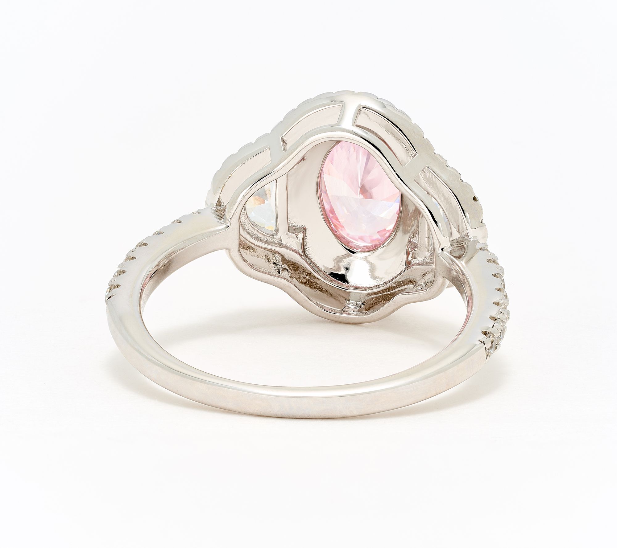 • 1-carat oval simulated center diamond; available in clear or pink; polished finish