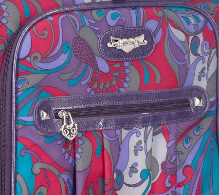 • Pull-up handle with push button lock, polished silvertone hardware, exterior zip pockets, Spinner wheels, 1" zip expansion