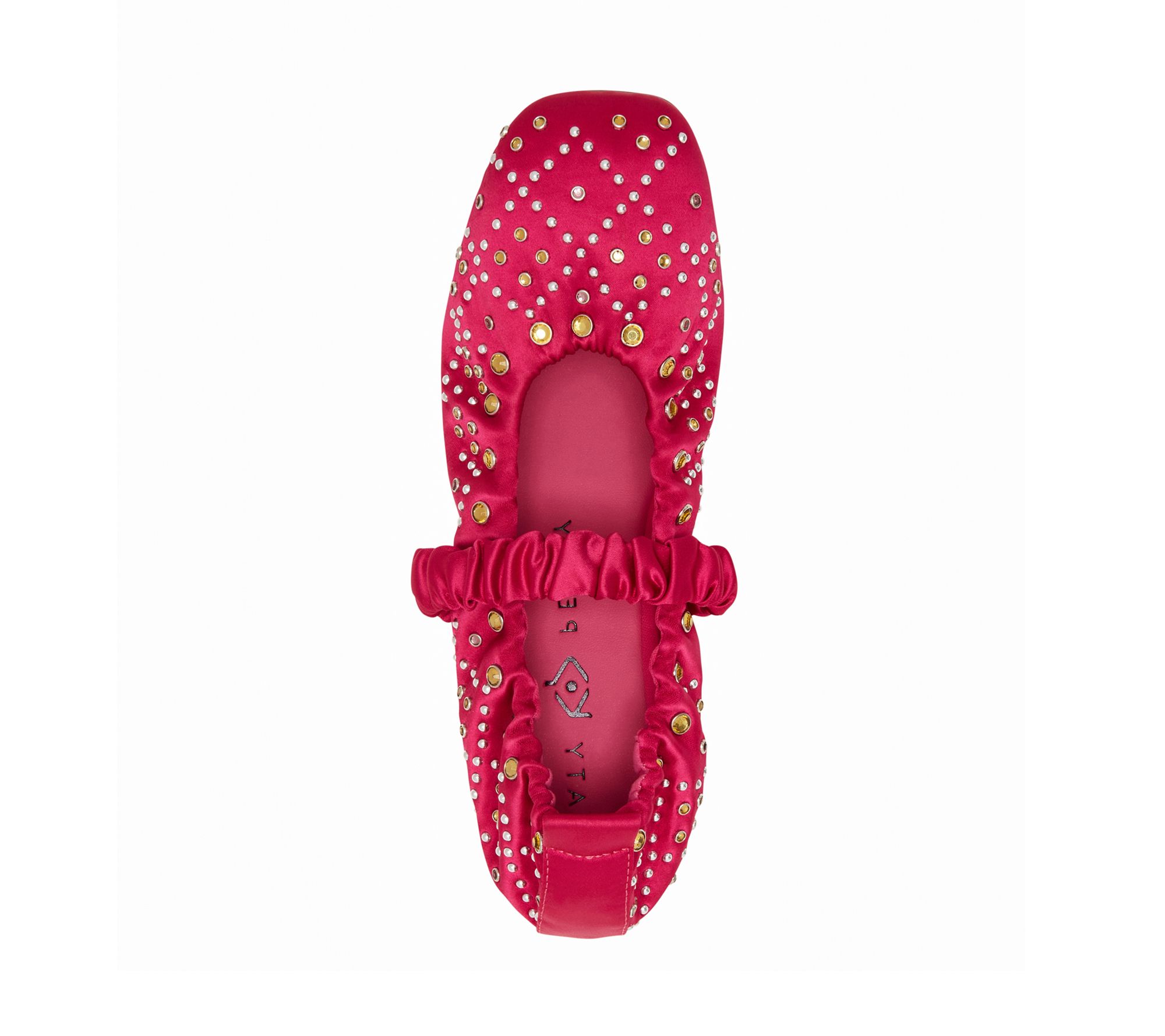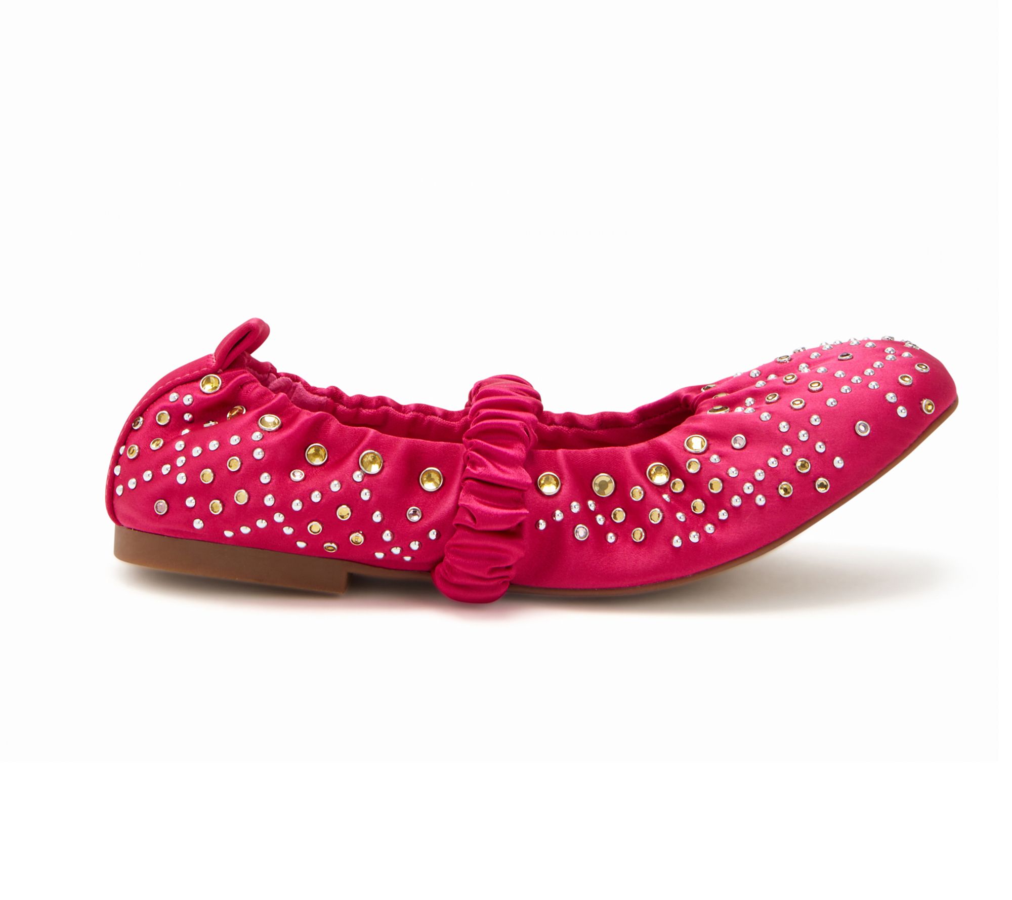 Slip into playful elegance with the Jammy Scrunch ballet flat, where a scrunchie-inspired strap, squared toe, and round metallic embellishments add a touch of glam to these packable flats, turning every step into a fashionable adventure. From Katy Perry.