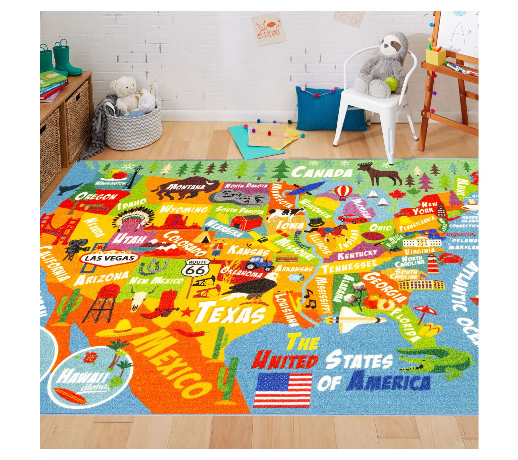 Transform any playroom, bedroom, or classroom into a world of interactive learning with this USA map rug, filled with vibrant state illustrations and famous landmarks to inspire curiosity and creative exploration. Kids will love tracing pretend road trips across all 50 states while building early geography skills and engaging in hours of imaginative adventures. From KC Cubs.