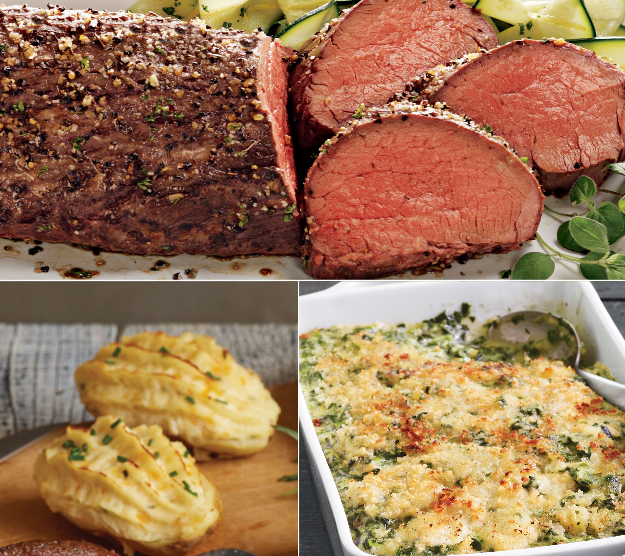 Make a lasting impression at your next intimate gathering when you serve this savory traditional rub beef tenderloin Chateaubriand, creamed spinach and twice-baked potatoes. Serves 4 to 6. From Kansas City Steaks.
