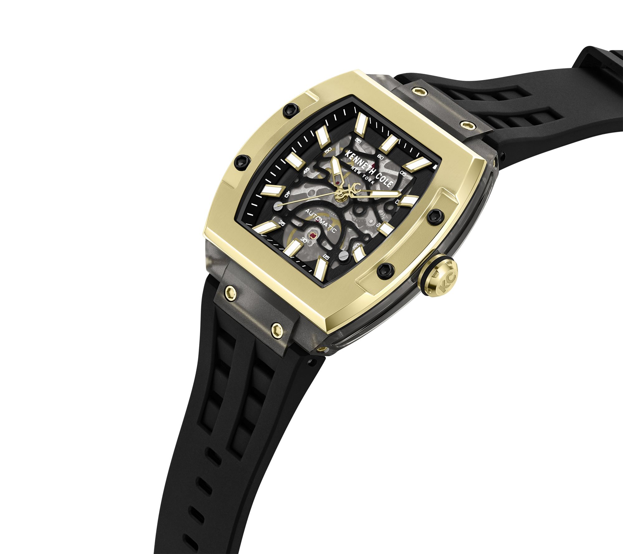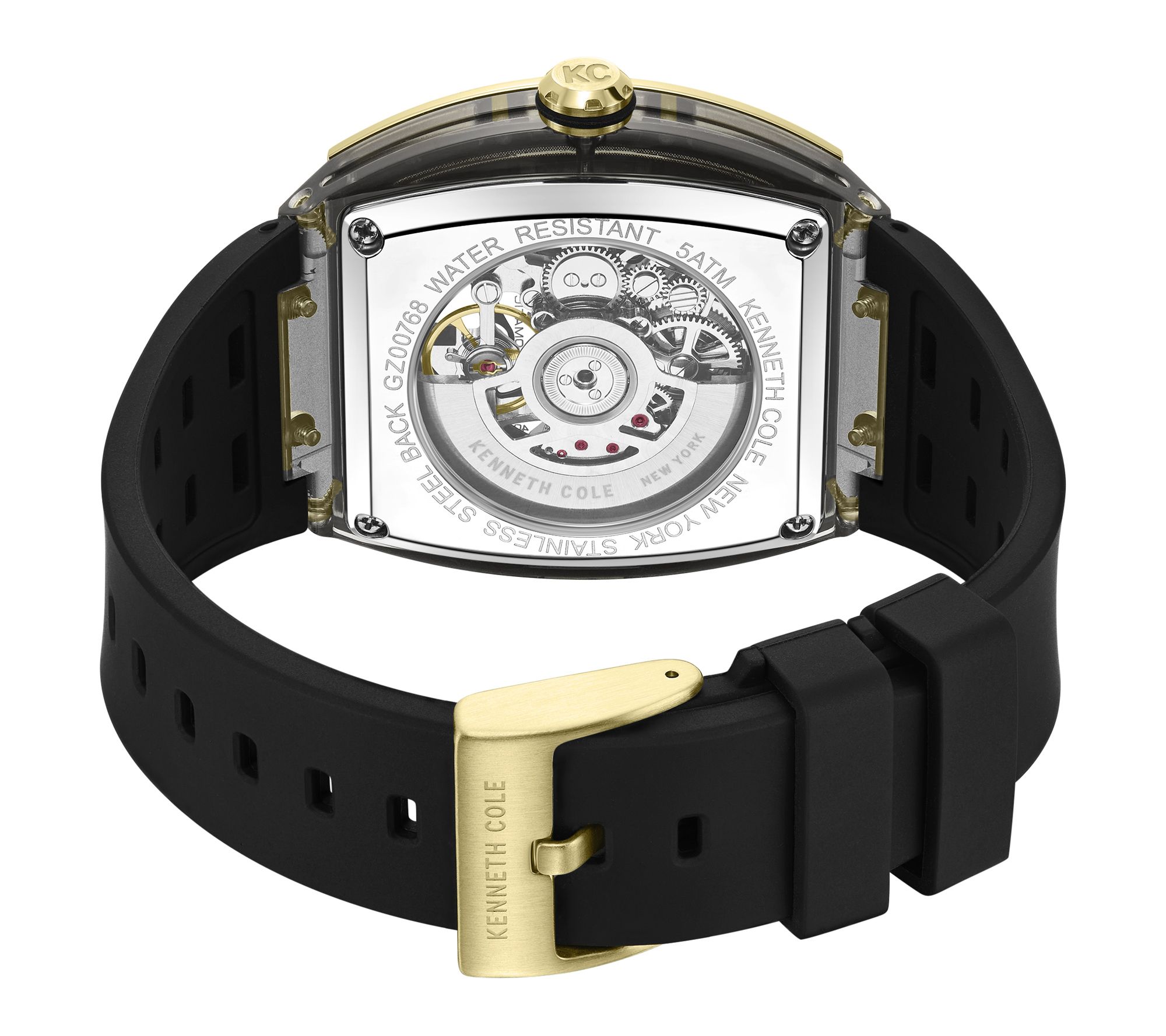 Set your pace with a watch that turns every glance into a celebration of refined movement and bold style. The striking skeleton dial and transparent barrel-shaped case reveal the complexity within, while a smooth black silicone strap offers reliable comfort whether you're making moves at the office or heading into your next adventure. From Kenneth Cole New York.