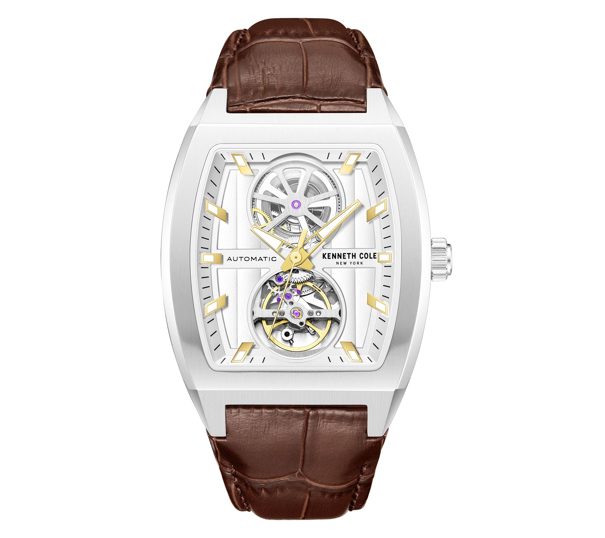 Express your unique style with this automatic watch. Featuring a sleek curved glass and silvertone dial, this timepiece highlights the art of mechanical precision with its two circular windows, offering an intriguing view of its inner workings. From Kenneth Cole New York.