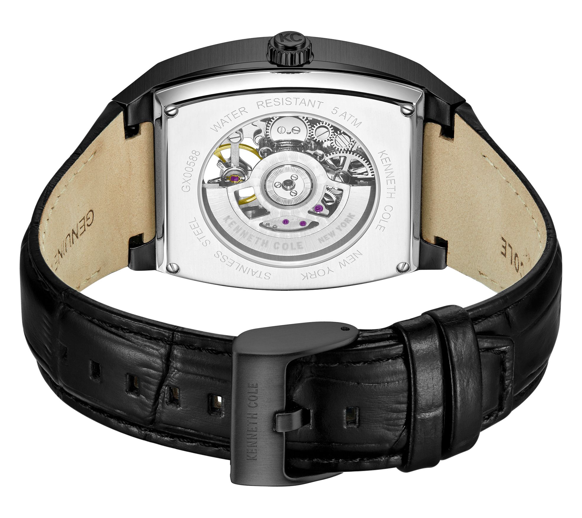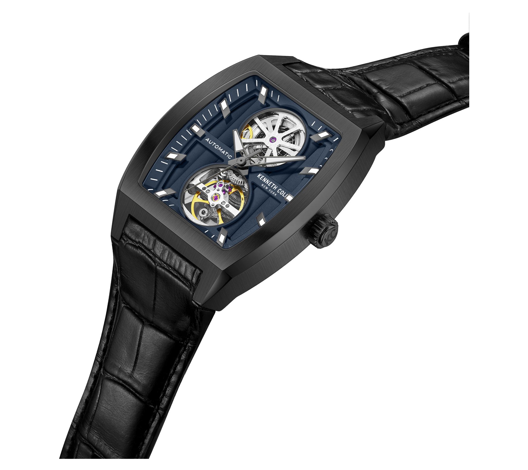 Kenneth Cole New York continues to excel in sophisticated automatic watches with this latest timepiece. Featuring a sleek curved glass and a striking blue dial, it resonates with your unique style. The unconventional dial design with two circular windows offers a captivating glimpse into the mechanical precision within. Paired with a genuine black leather strap, this watch effortlessly blends style and comfort. From Kenneth Cole New York.