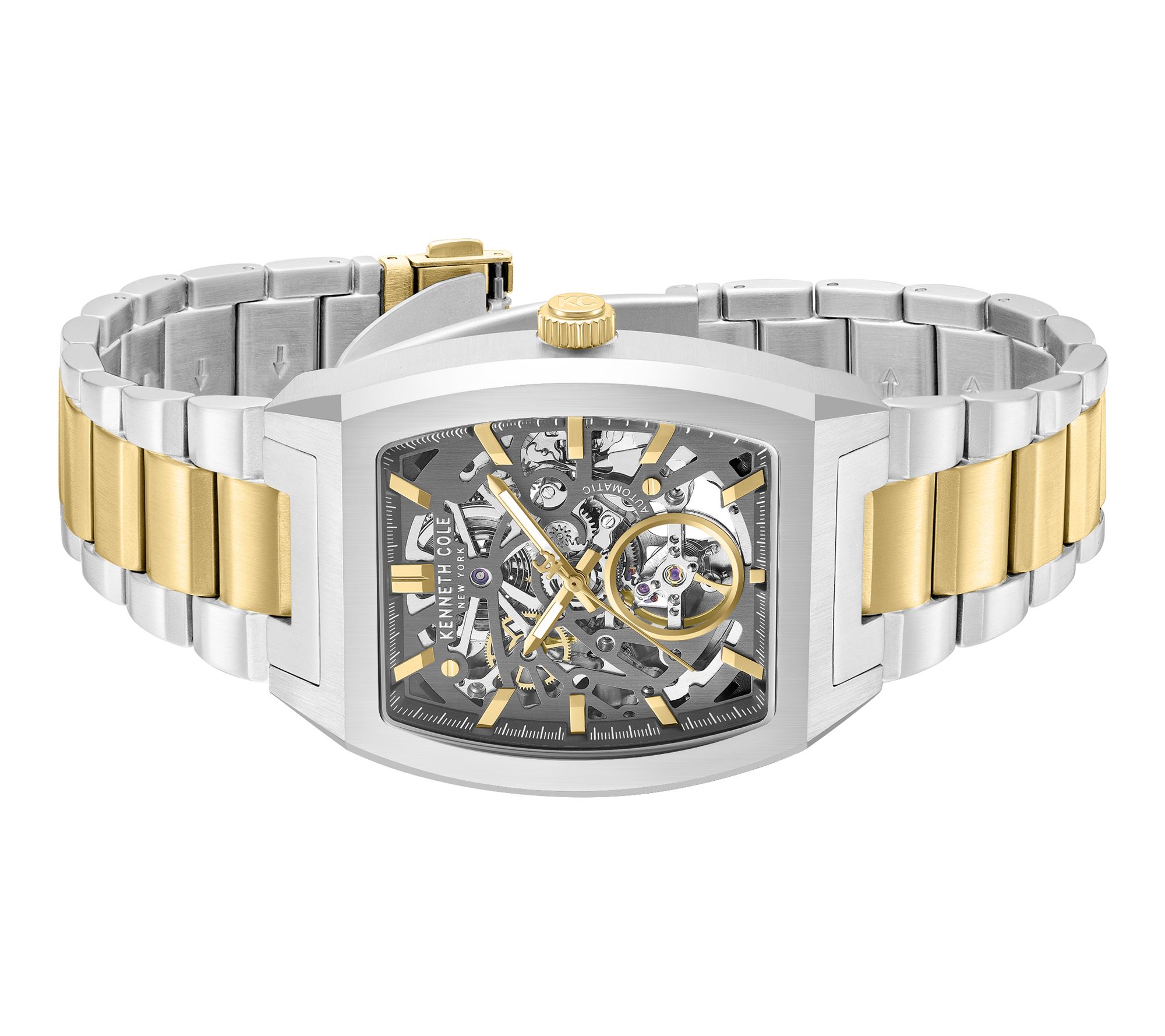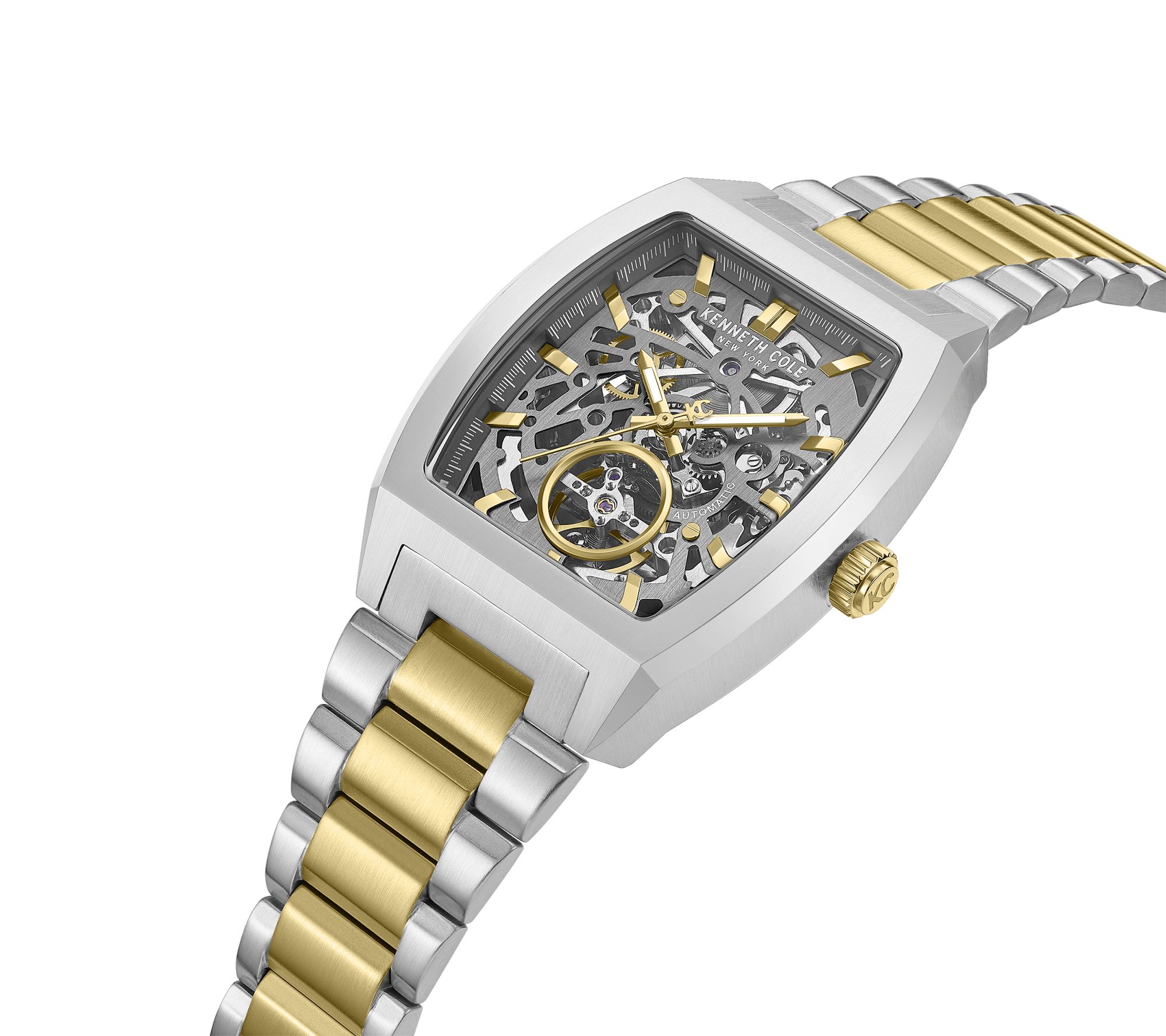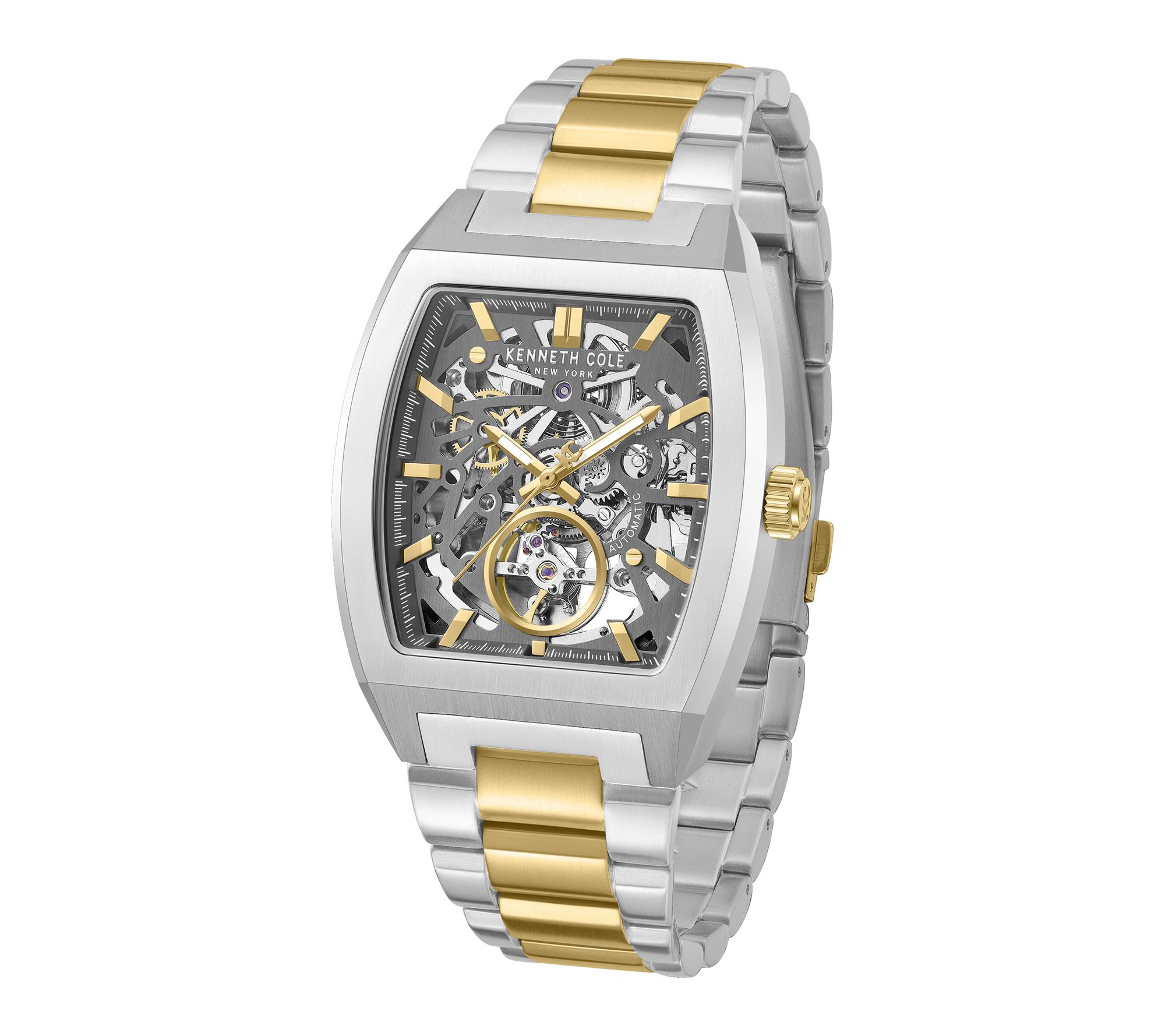 Make every moment count with this men's watch -- a true blend of innovation and bold design. A dramatic skeleton dial reveals sophisticated automatic movement, beautifully framed by a distinctive barrel-shaped stainless steel case and secured with a stylish two-tone bracelet. Modern elegance meets everyday confidence every time you fasten it. From Kenneth Cole New York.