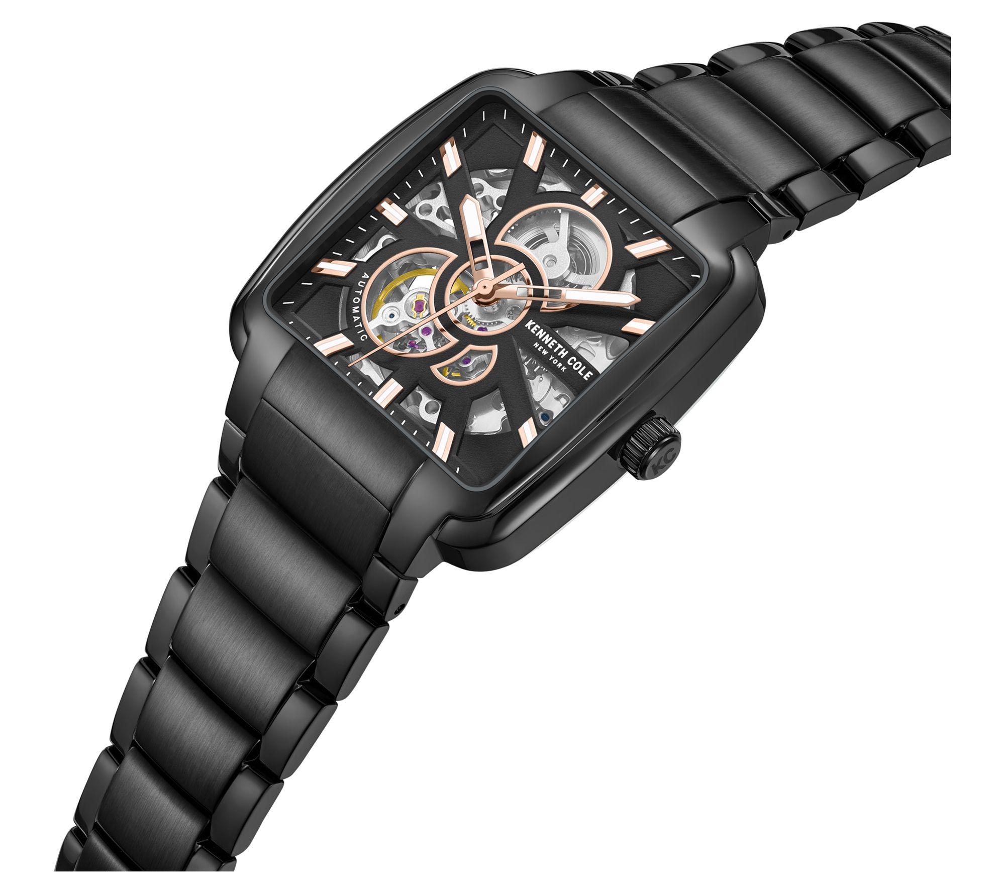 Redefine the essence of elegance with Kenneth Cole New York's automatic watch, fusing a square dial within a 40mm almost-square case. The intricate mechanisms revealed through the skeleton black dial, accompanied by delicate line details, elevate the classic design into a modern masterpiece. From Kenneth Cole New York.