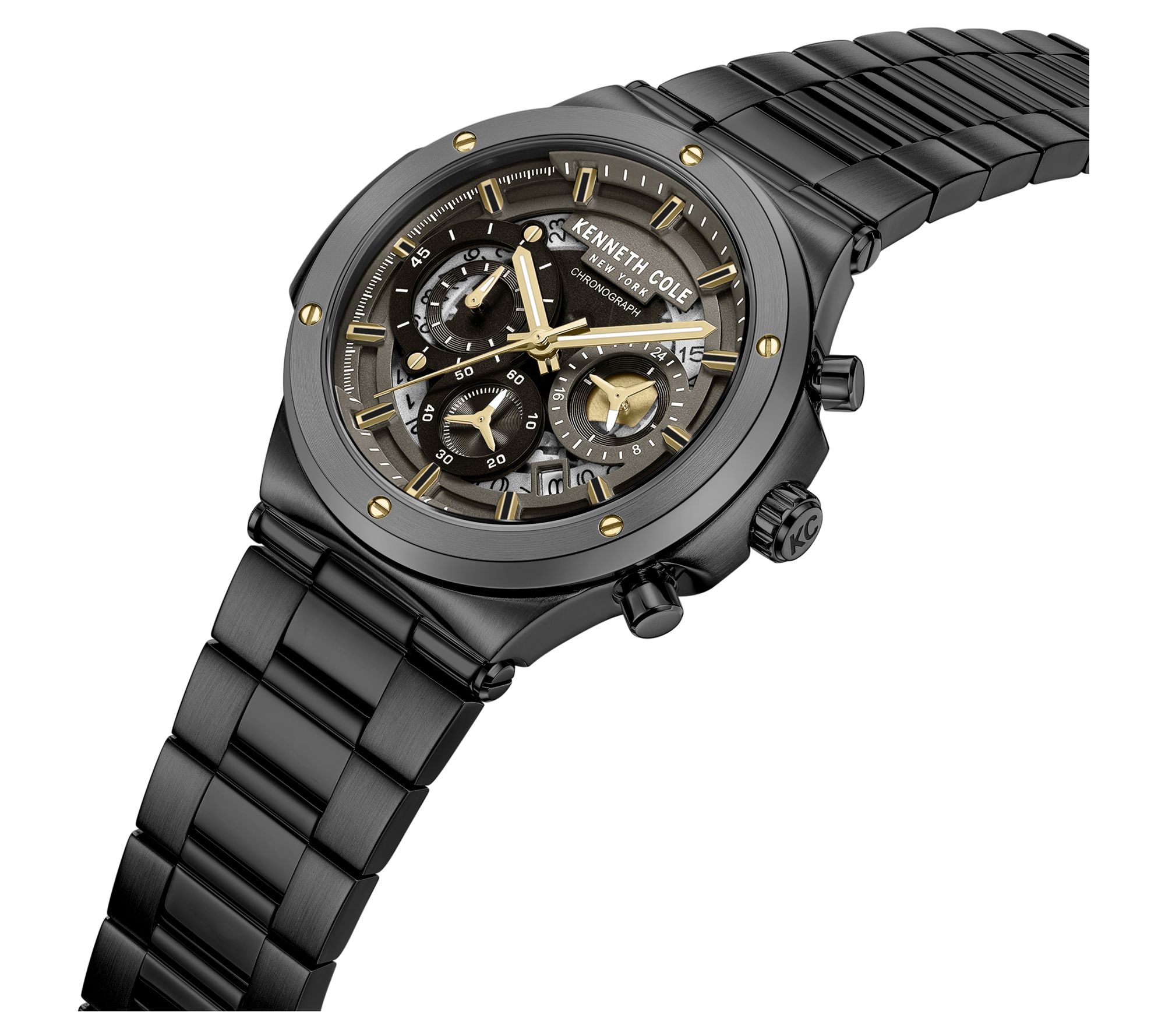 Exuding sophistication with its sleek dial and refined aesthetics, this Kenneth Cole New York men's chronograph watch embodies quiet confidence. Designed for a modern era of style, it's versatile enough to pair with a suit and casual enough for everyday wear. The contrasting details on the black dial, coupled with its opaque finish, offer subtle glimpses of the date disc, adding an air of intrigue. From Kenneth Cole New York.