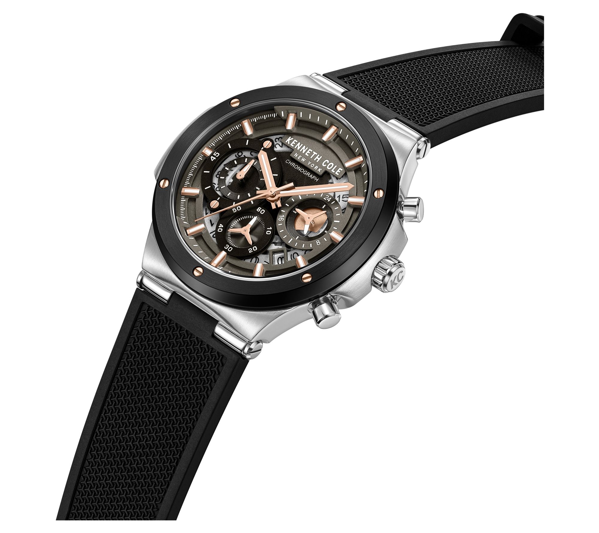 For a style that speaks volumes without saying a word, turn to this Kenneth Cole New York men's dress sport watch. The sleek black dial, stainless steel accents, and flexible black silicone strap lend an air of sophistication, perfect for both professional and casual settings. The chronograph feature and bold pushers bring a modern twist, ensuring you stay ahead of the times. From Kenneth Cole New York.