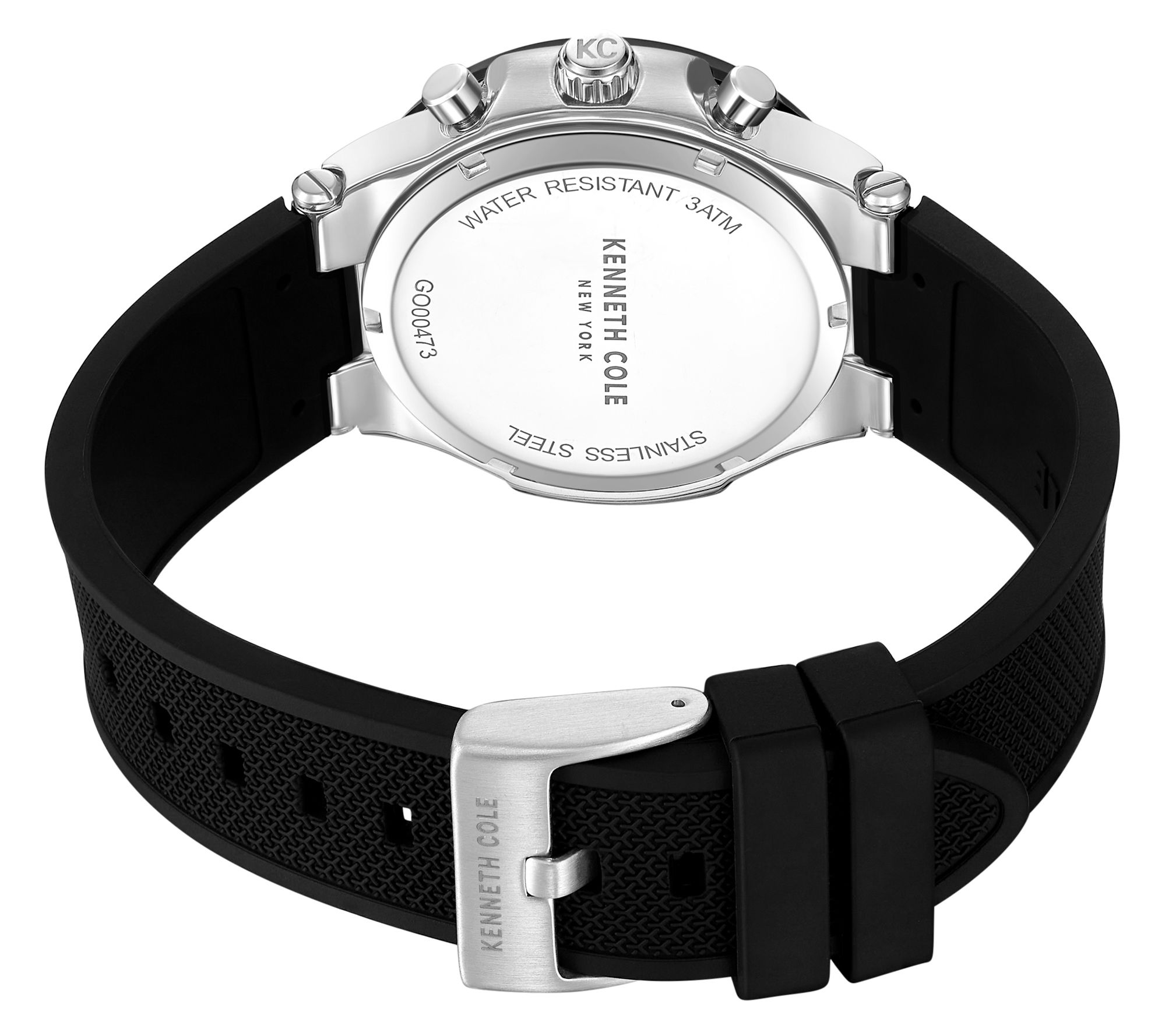 • Black silicone strap with buckle closure