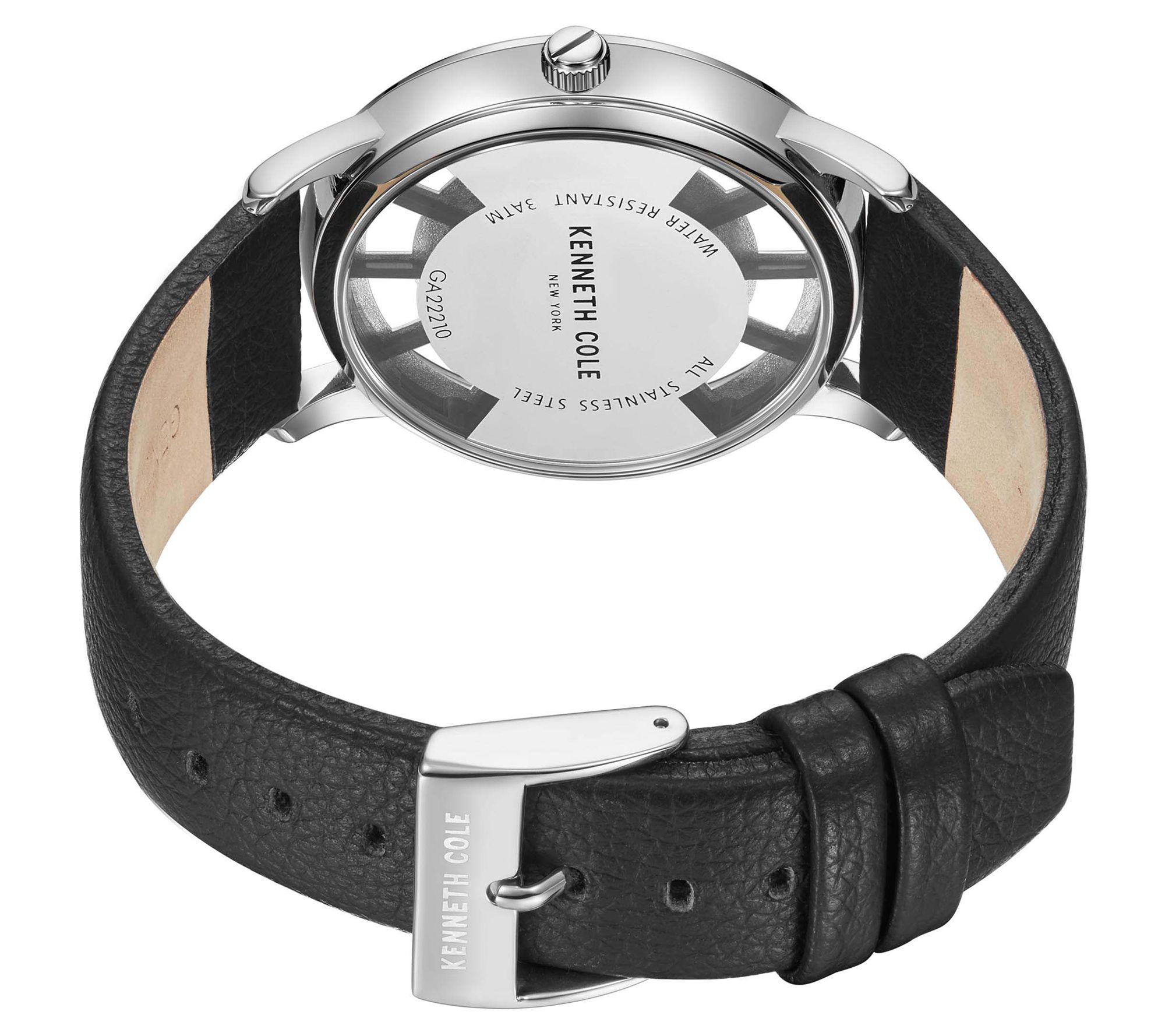 • Black leather strap with buckle closure