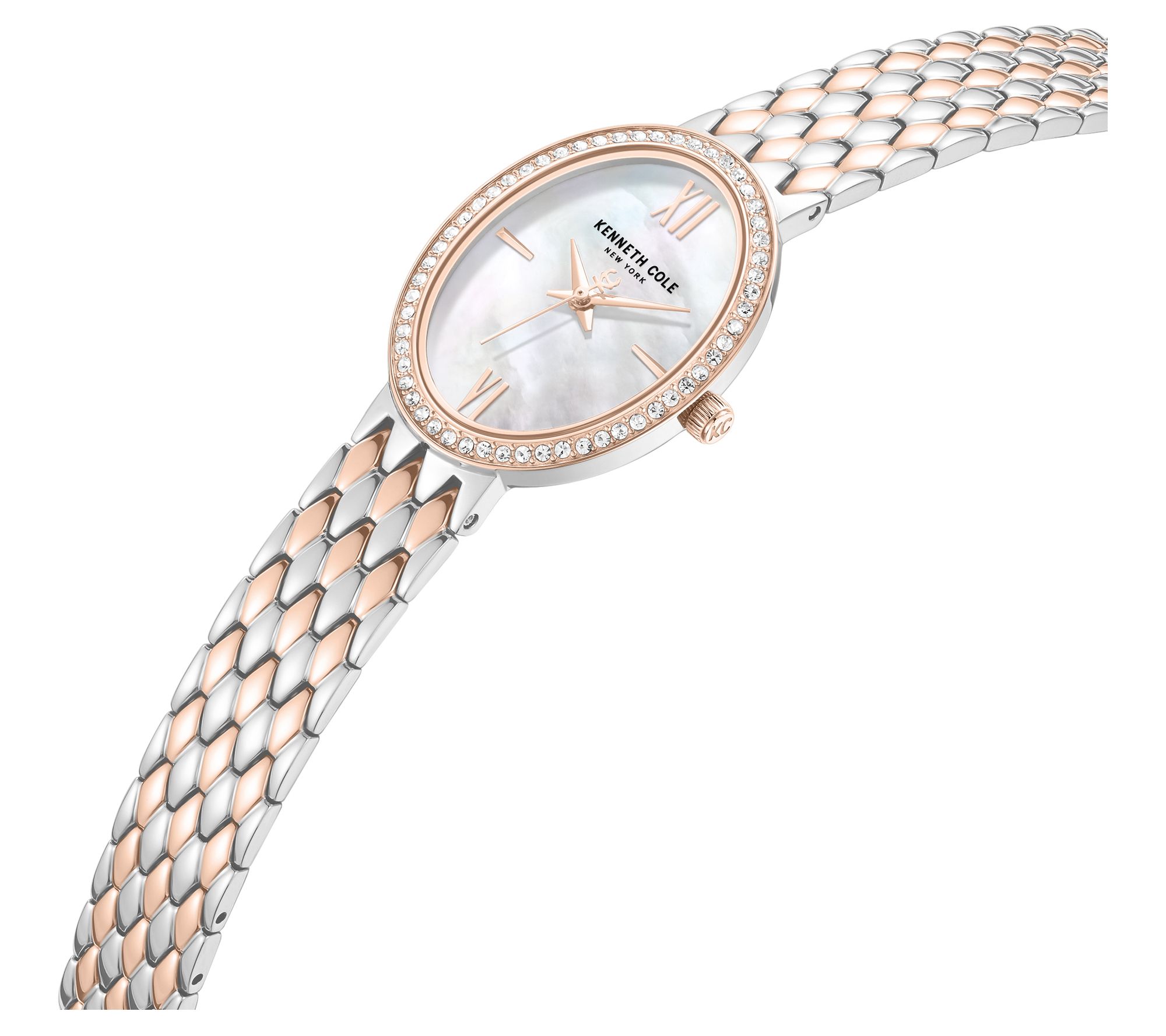 Bring everyday elegance to your wrist with this ladies' watch, crafted to shine with a crystal-encrusted rosetone bezel and a refined white mother-of-pearl dial. Whether you're heading to a luncheon or enjoying a weekend getaway, the two-tone bracelet and striking Roman numeral markers add a sophisticated finishing touch to your look. From Kenneth Cole New York.