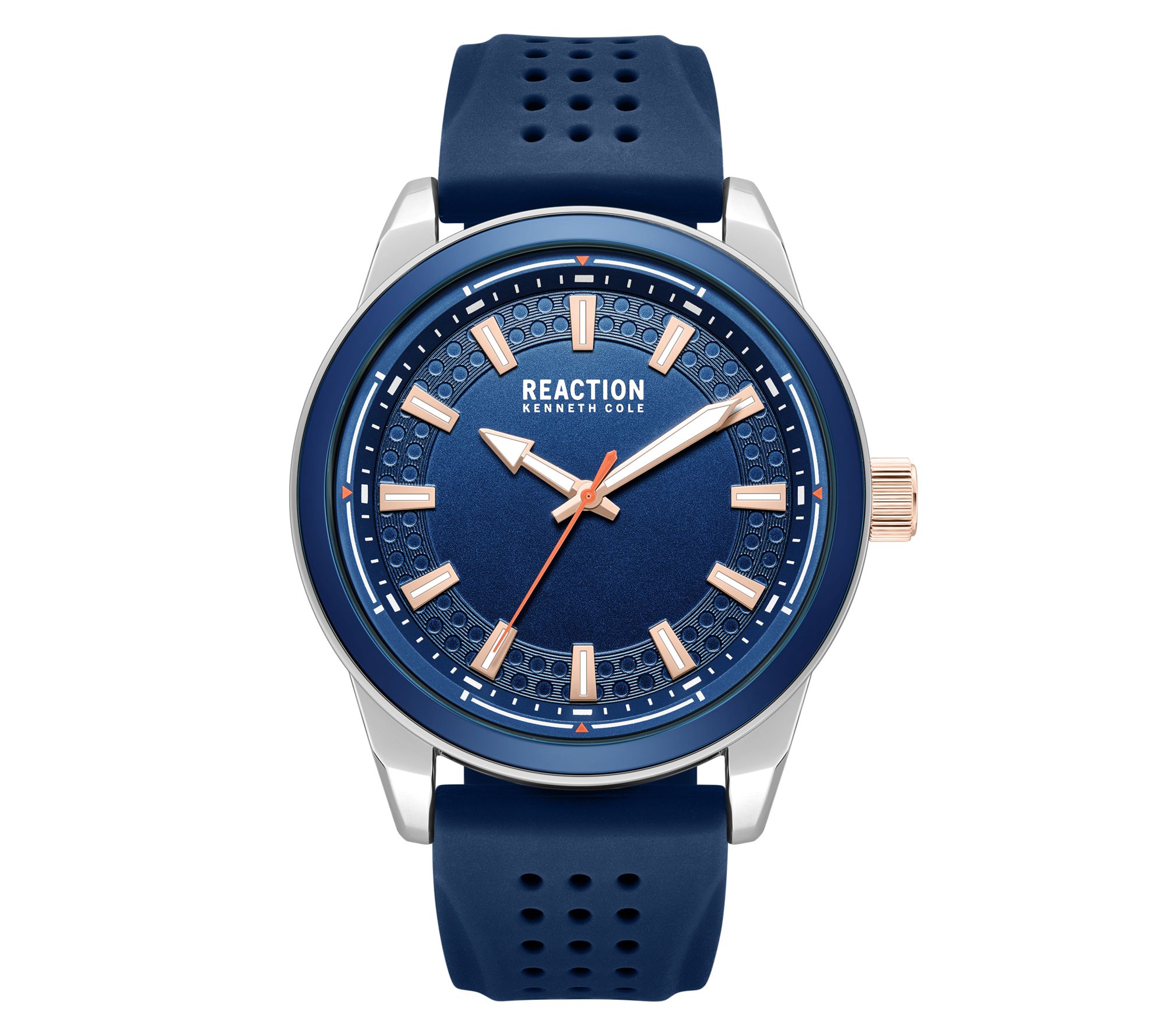 Sometimes a sporty style is just what you need to energize everyday essentials. This men's blue silicone strap watch adds a pop of vibrant color and sleek, modern flair to your wrist, with a smooth blue dial accented by rosetone hour markers for effortless time-telling. The bold silvertone case keeps your look classic, whether you're headed to work or off the clock. From Kenneth Cole Reaction.