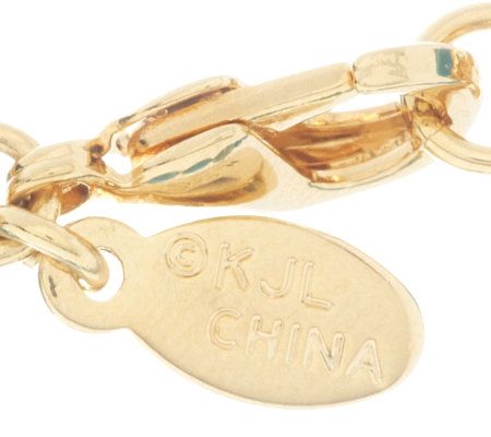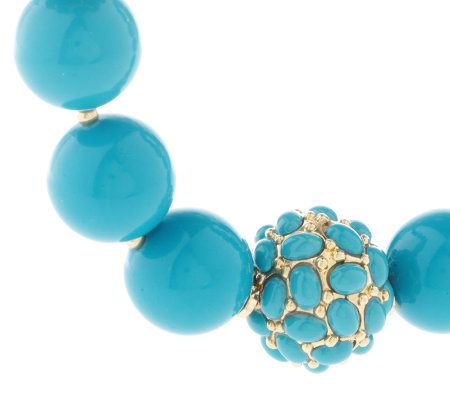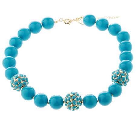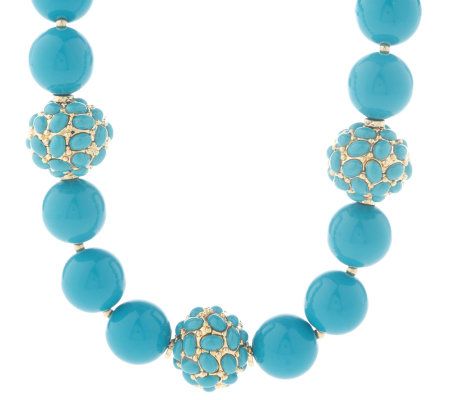 Don't be shy--especially if you're wearing this bold bead necklace. The attention-getter showcases three goldtone bead stations, each bezel set with oval cabochons and set off by faceted goldtone spacer beads on either side. Smooth, round beads--separated by smooth, polished goldtone spacers--comprise the rest of this head-turning triumph. From Kenneth Jay Lane.