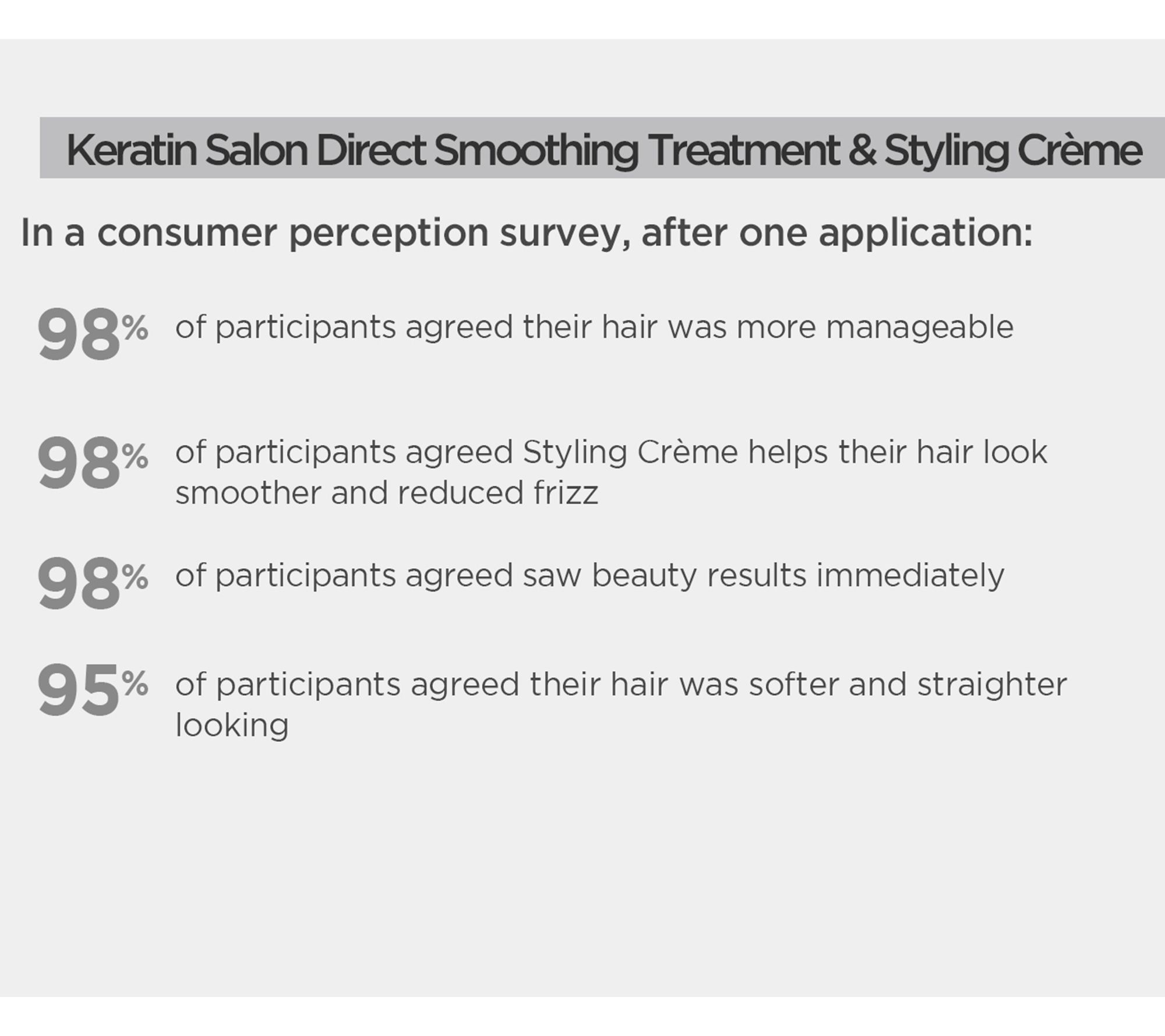 -- 98% of participants agreed their hair was more manageable -- 98% of participants agreed Styling Creme helps their hair was look smoother 95% of participants agreed their hair was softer and straighter looking -- 98% of participants agreed the Styling Creme helps reduced frizz -- 98% of participants saw beauty results immediately