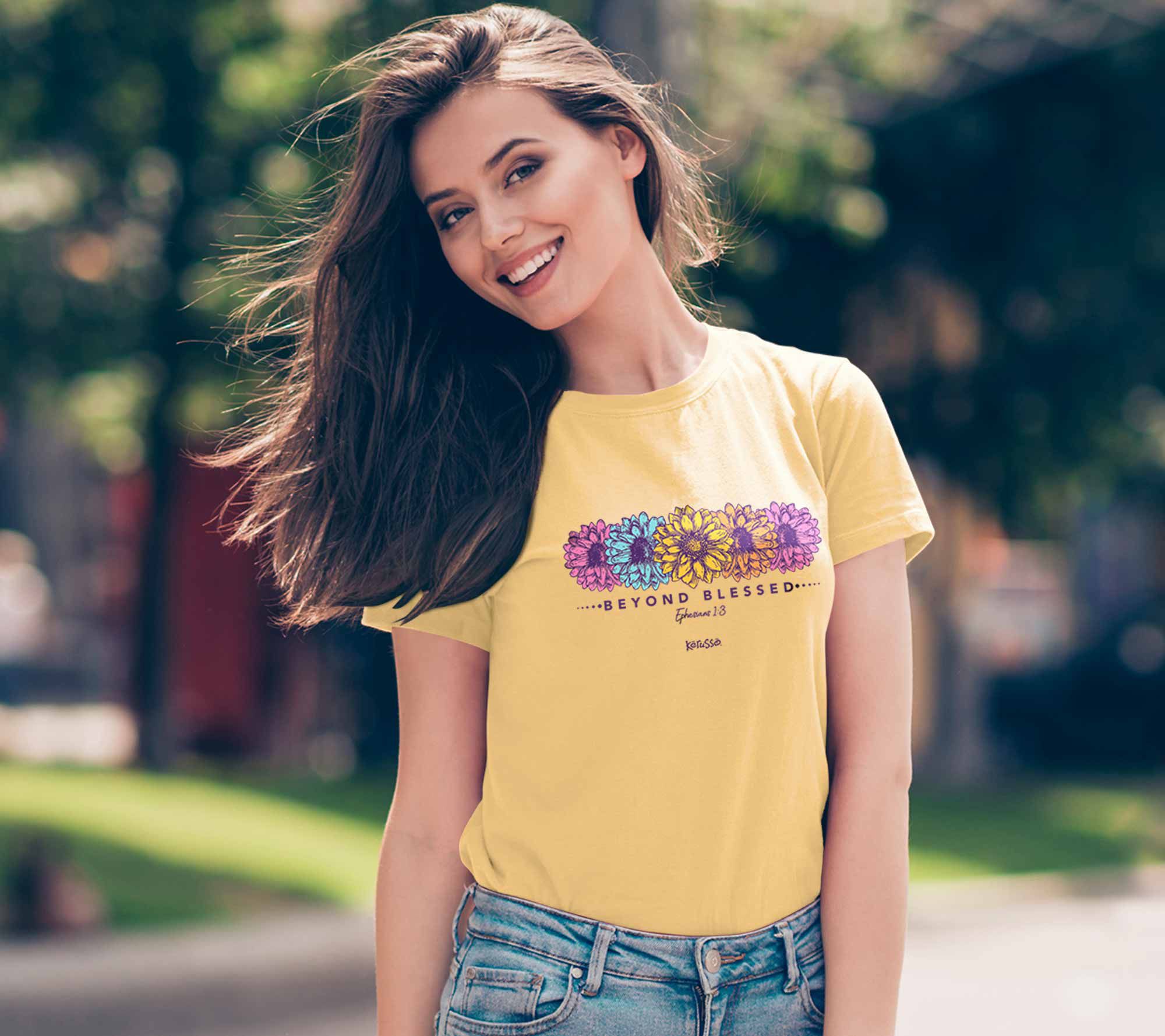 Flower power. Proudly parade your gratefulness in this "Beyond Blessed" daisies cotton tee, ideal for casual outings, church events, or just relaxing at home. From Kerusso.