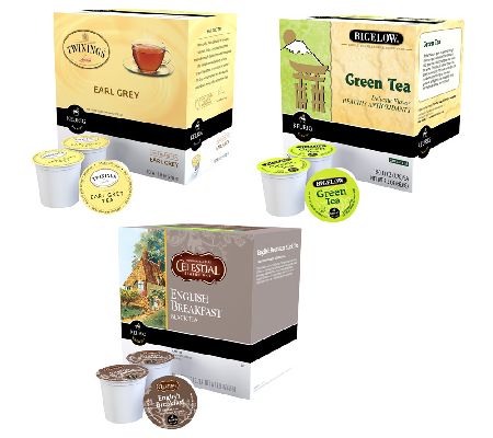 • Includes 18 Celestial Seasonings English Breakfast Tea K-Cups, 18 Twinings Earl Grey Tea K-Cups, and 18 Bigelow's Organic Green Tea K-Cups
