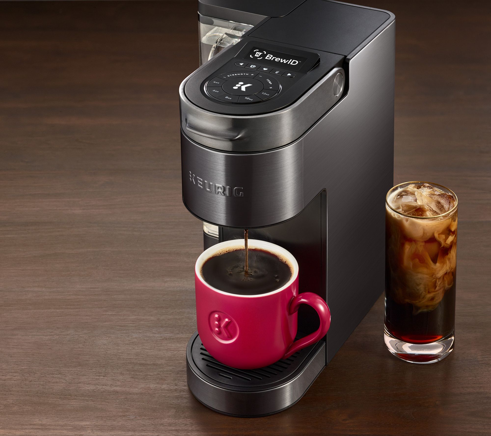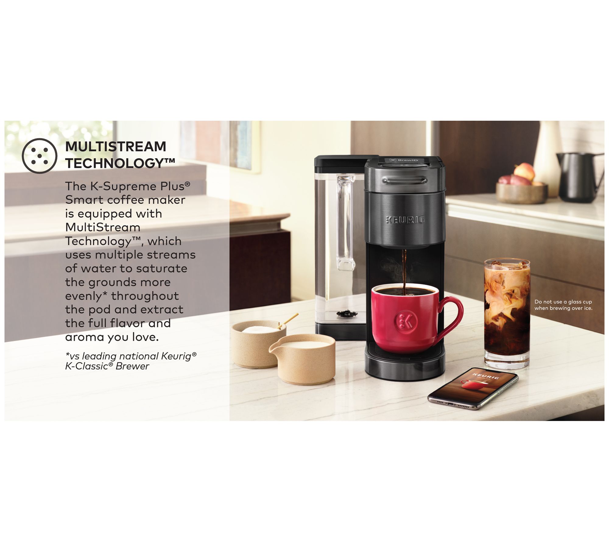 Includes K-Supreme Plus Smart Brewer, multi stream My K-cup, and 48 K-cups: 12-count box each of Brew Over Ice Vanilla Caramel, Caribou Coffee Daybreak Blend, Krispy Kreme Classic, and Folgers Black Silk