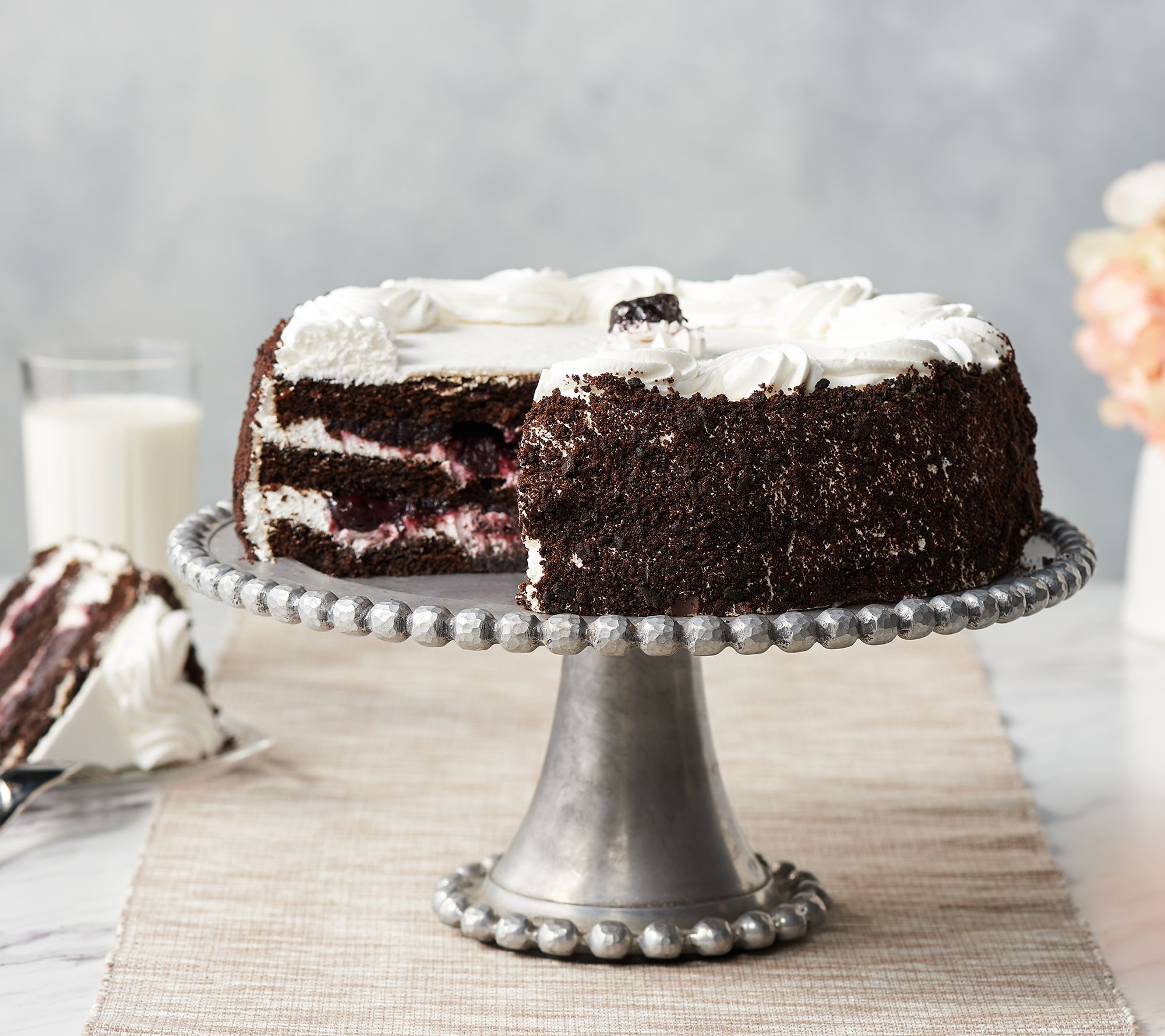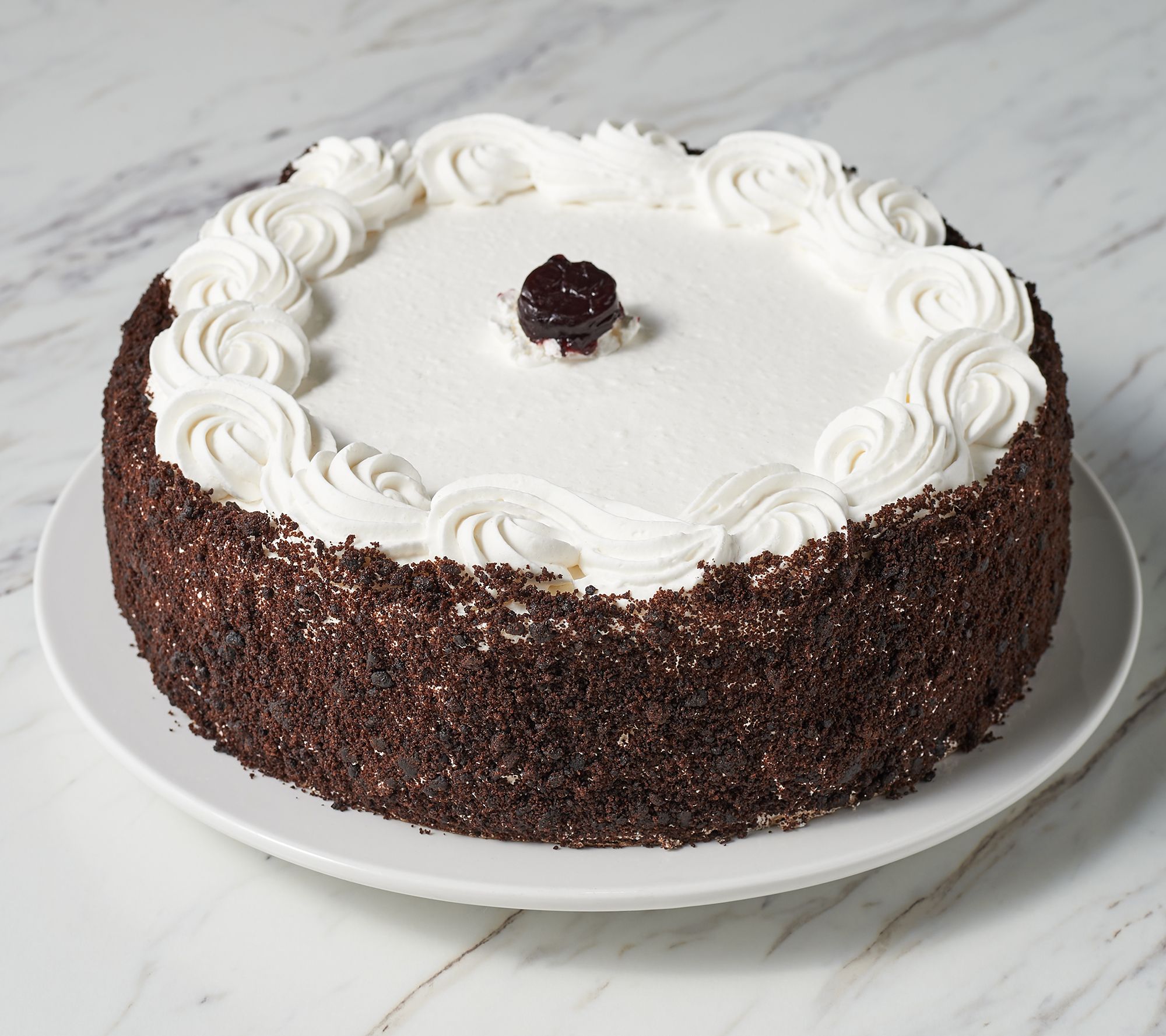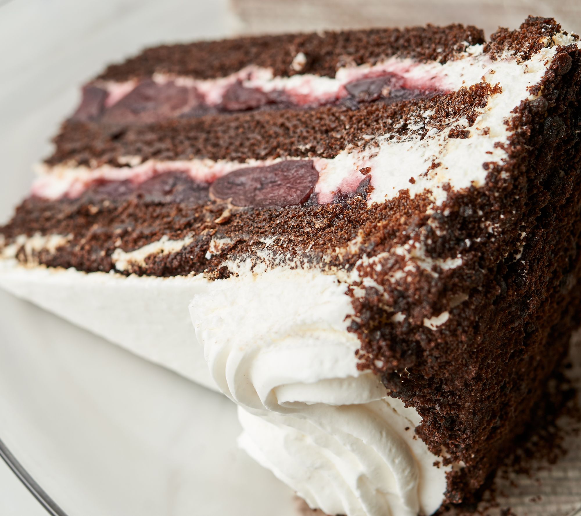 Three layers of rich dark chocolate cake filled with whipped cream and black cherry filling, covered with whipped cream and chocolate cake crumbs, and finished with hand-decorated piping on top