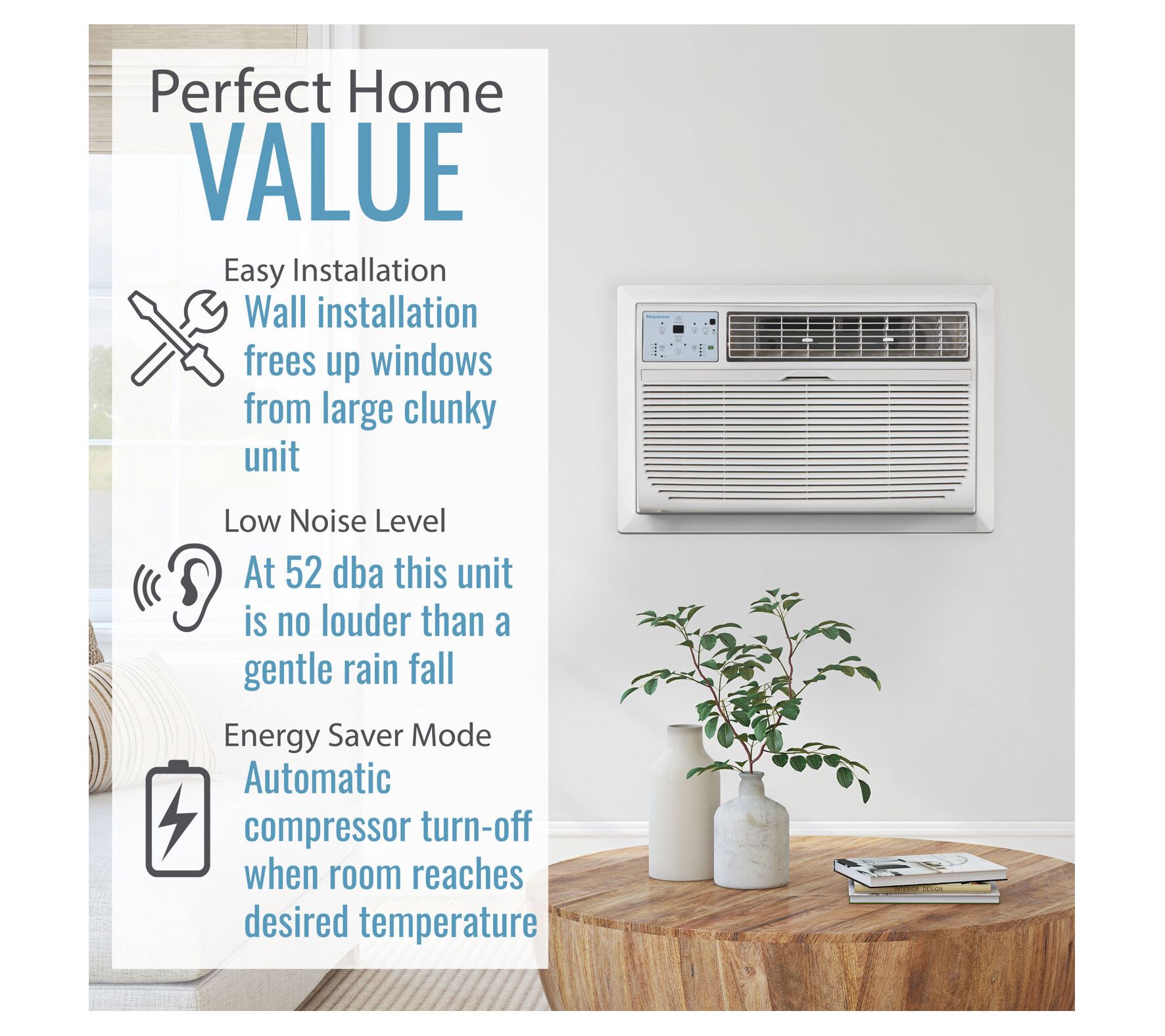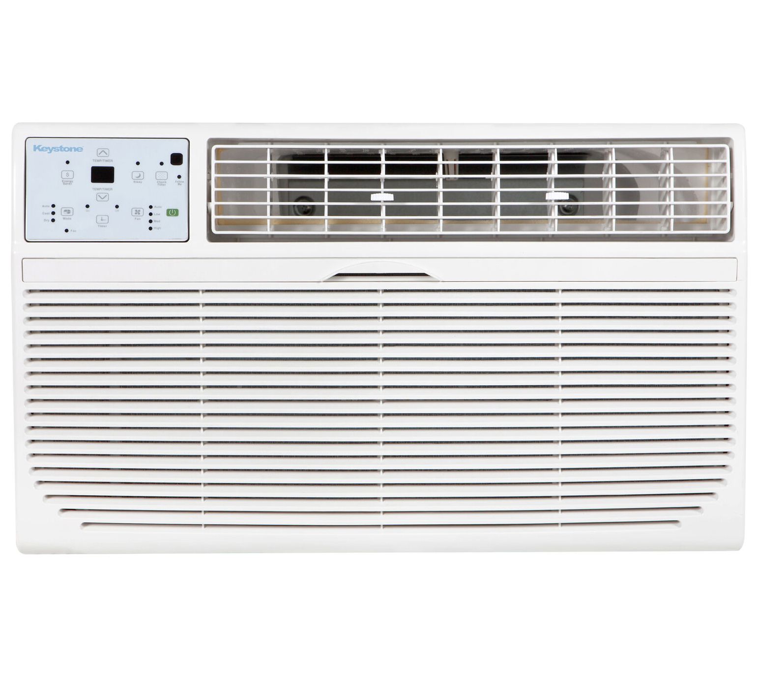 Keep your space comfortably cool with this through-the-wall 8,000 BTU air conditioner. This unit comes with a universal interior trim kit for easy installation in existing wall sleeves and features electronic controls with an LED display for simple operation. Enjoy the convenience of a temperature-sensing LCD remote control, adjustable air flow, and multiple cooling and fan speeds. Energy-saving modes and a programmable timer offer both efficiency and convenience. From Keystone.