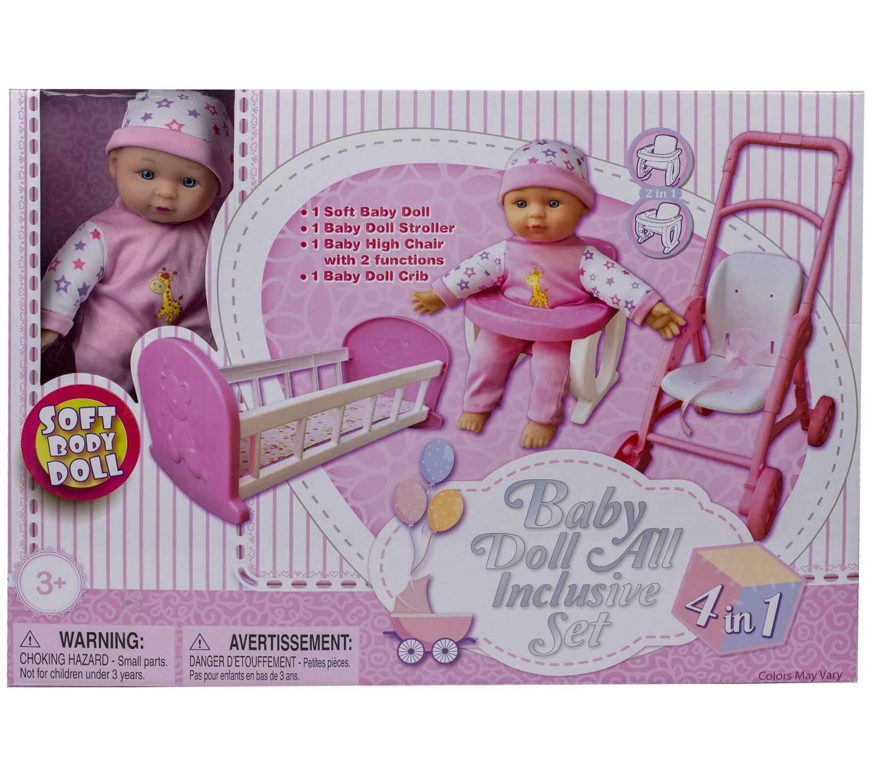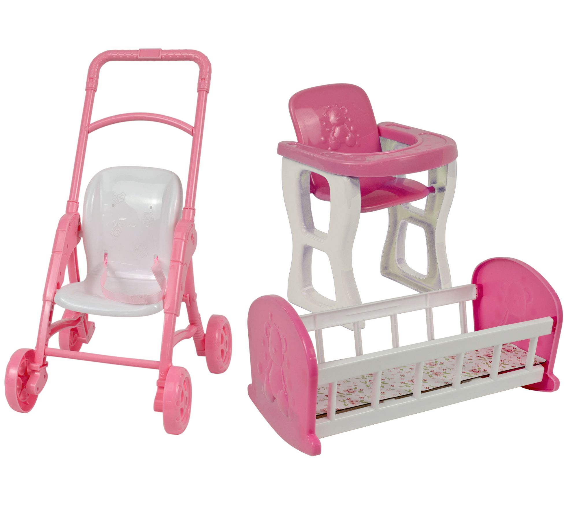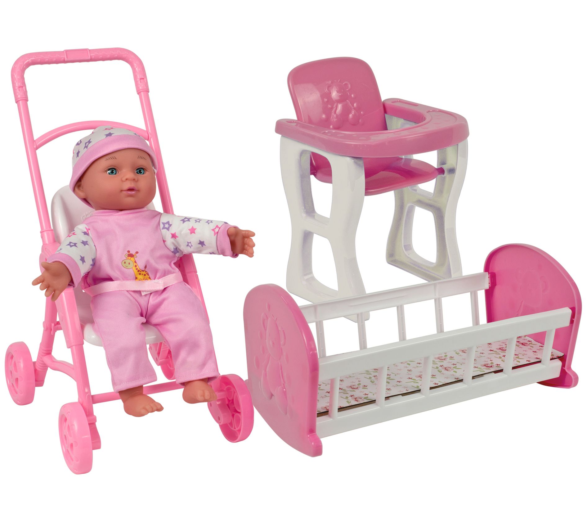 • Includes doll, crib, highchair, and stroller