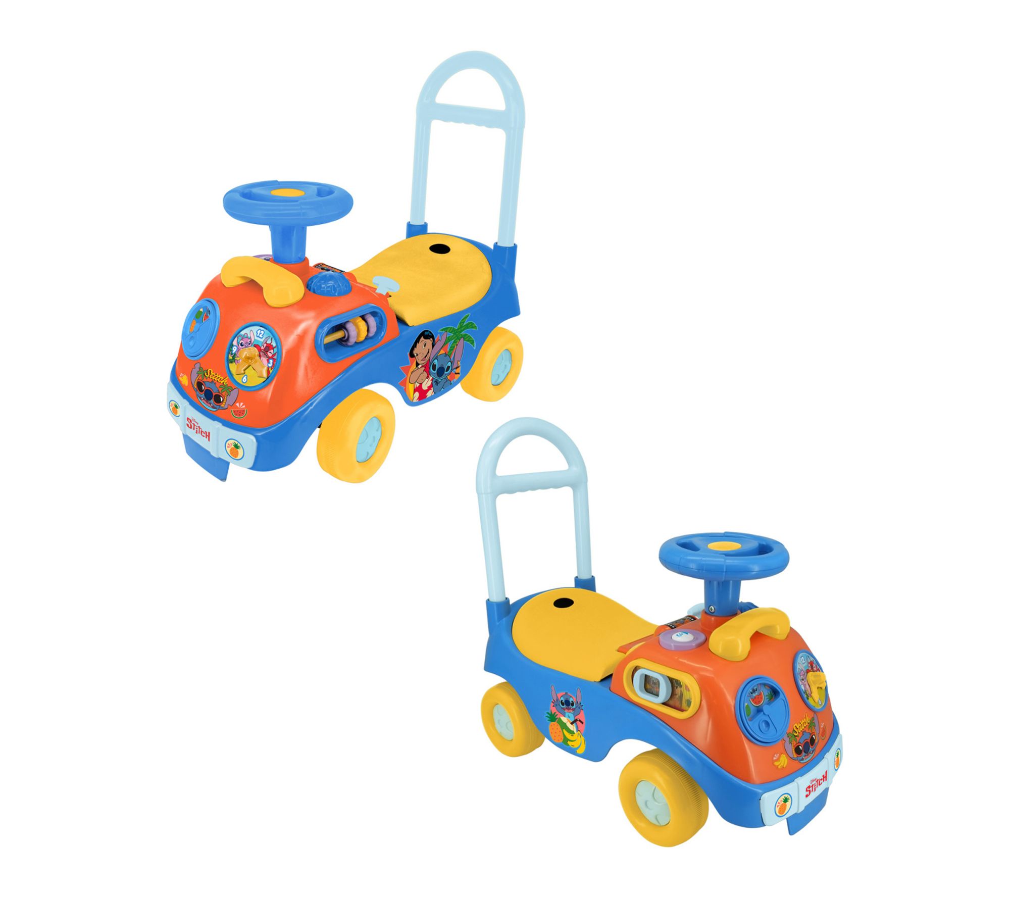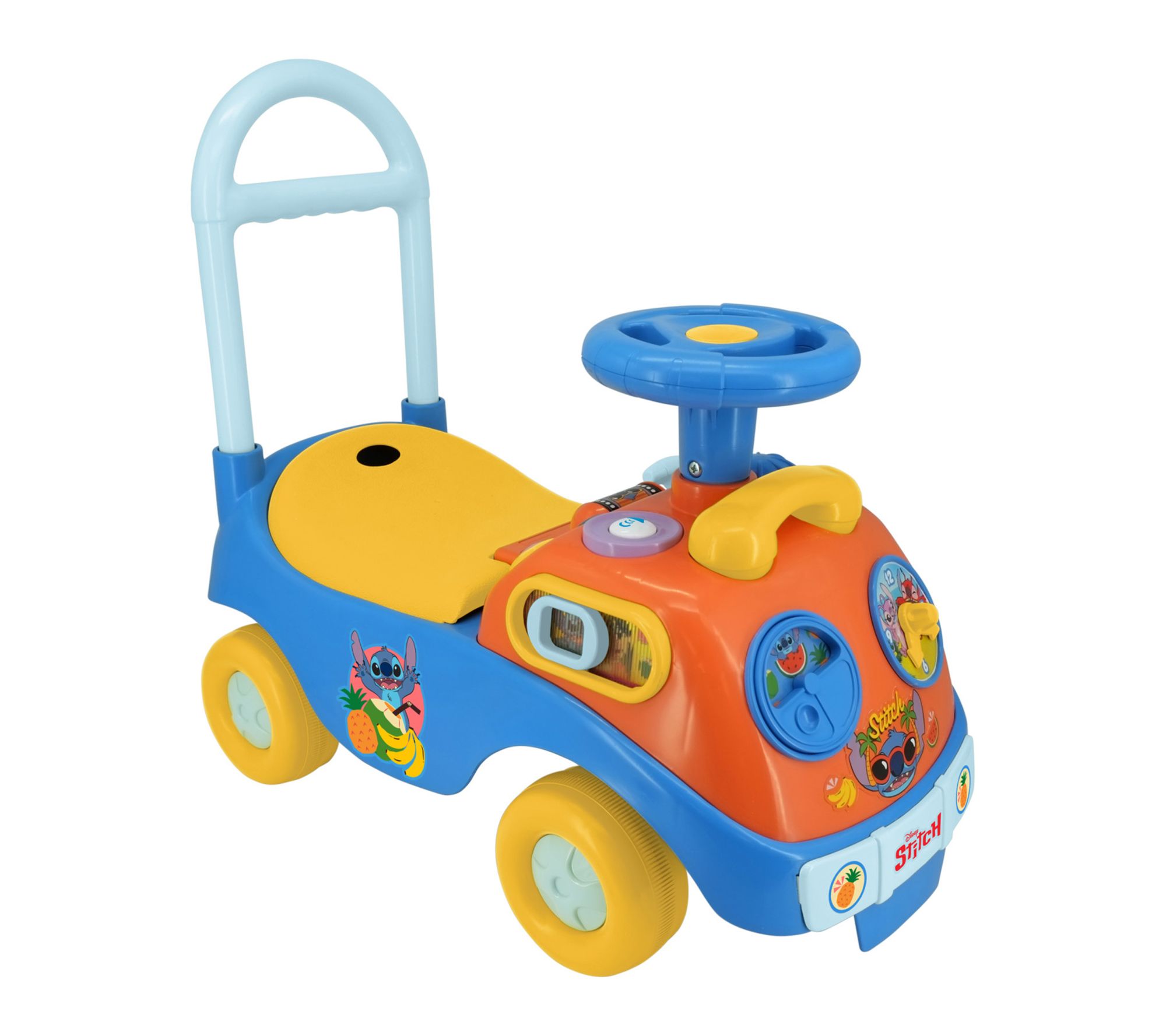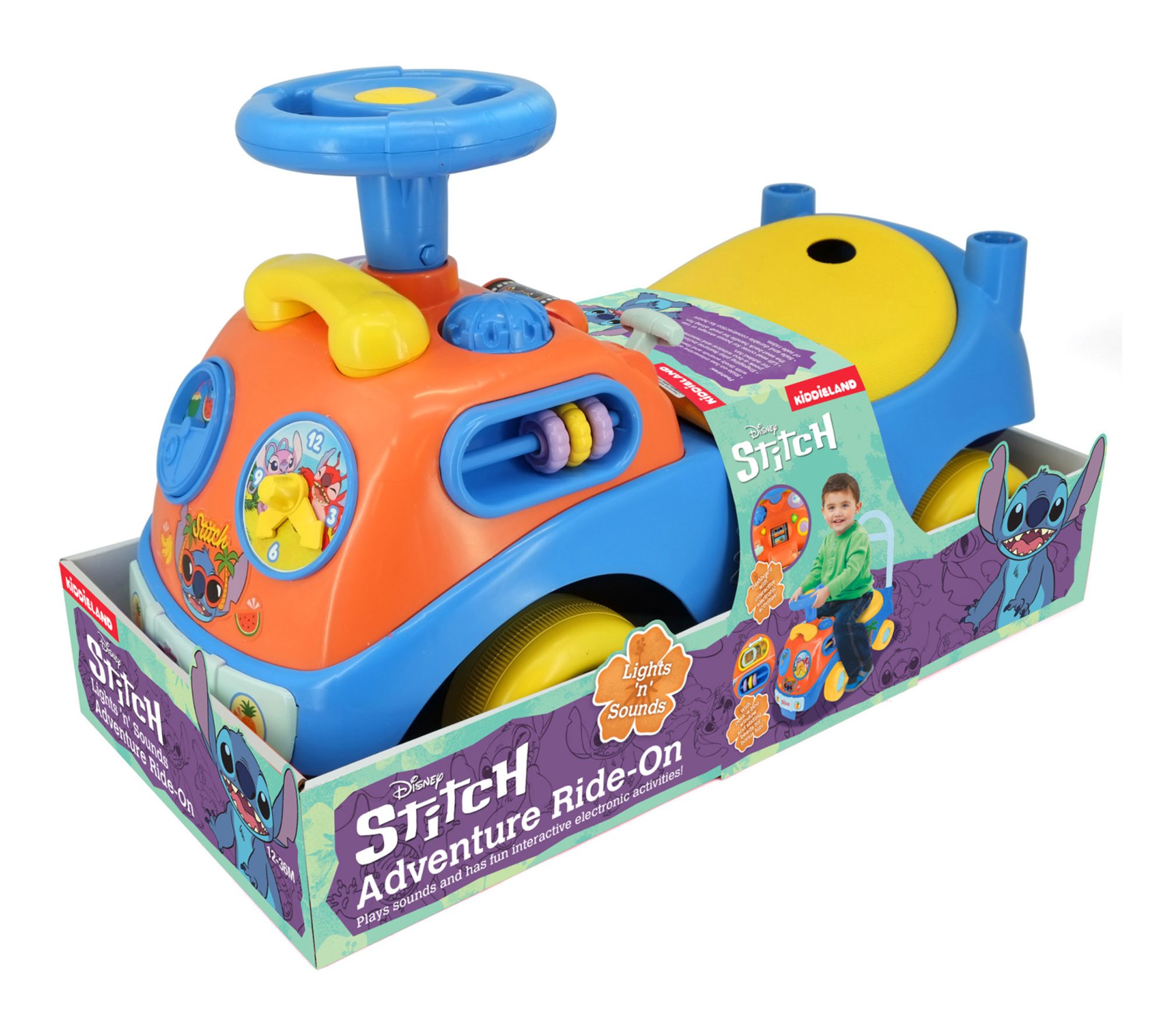 Every ride turns into an exciting adventure with this Stitch Lights N' Sounds Adventure Ride-On. Little ones can play, ride, and explore alongside Disney's Stitch as they enjoy flashing lights, cheerful sounds, and interactive dashboard activities for hands-on fun. A hidden storage compartment keeps favorite toys secure while the sturdy seat-back handle makes push-along play easy for developing walkers. From Kiddieland.