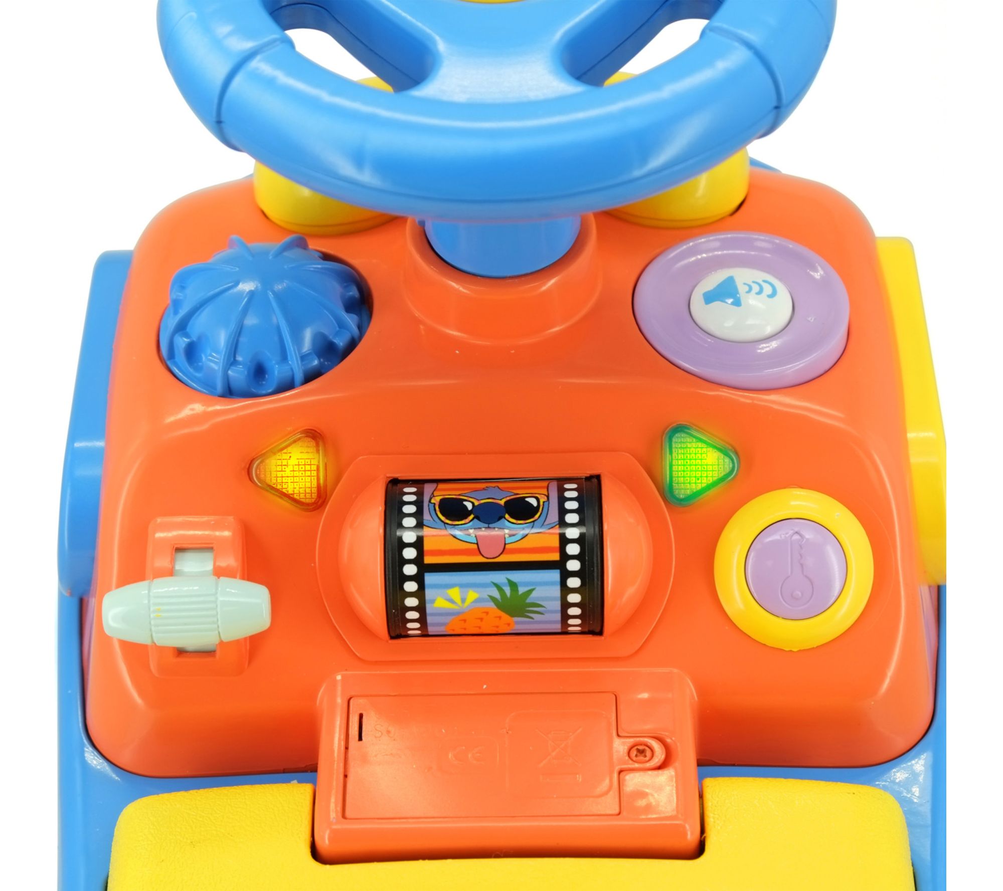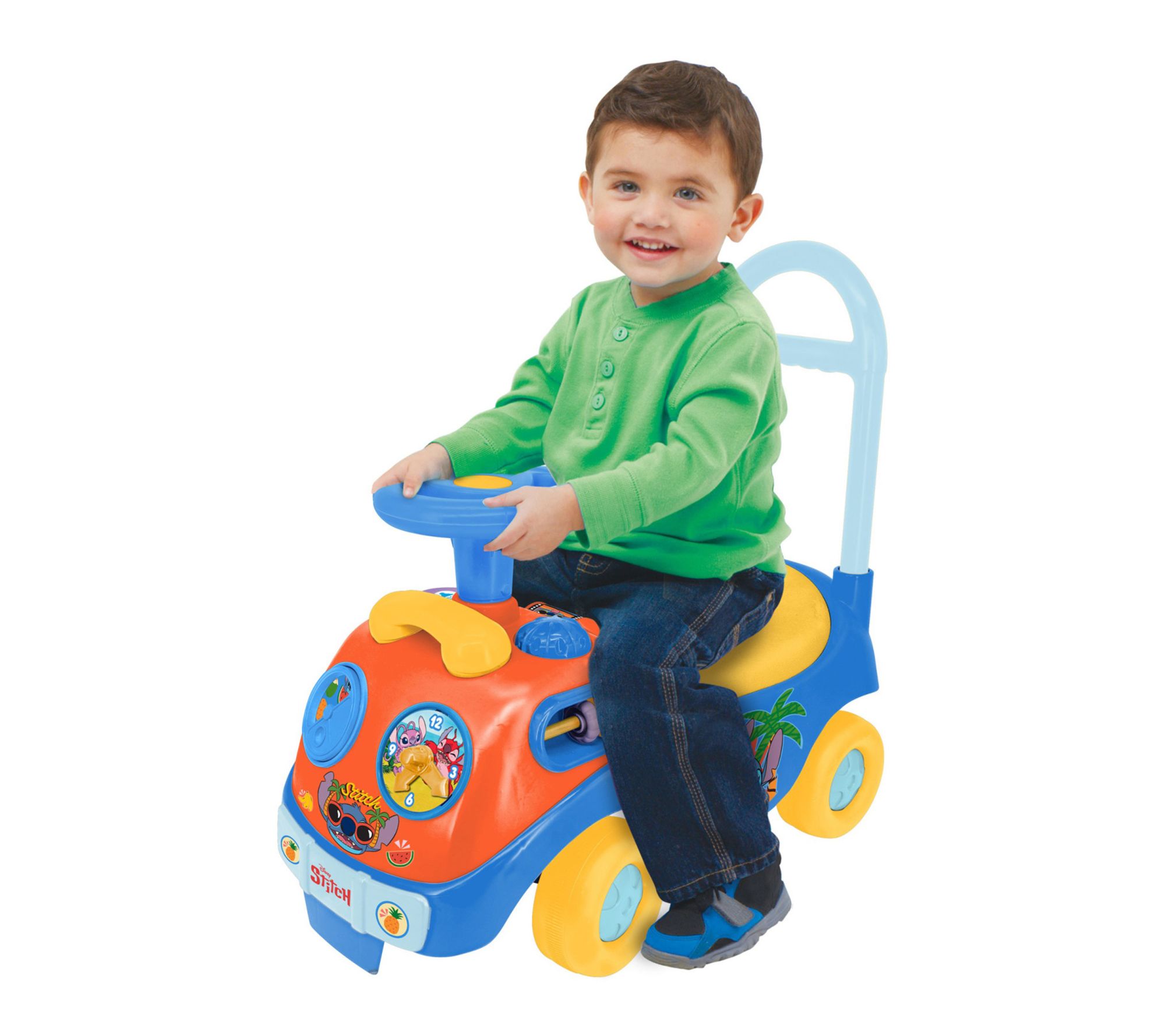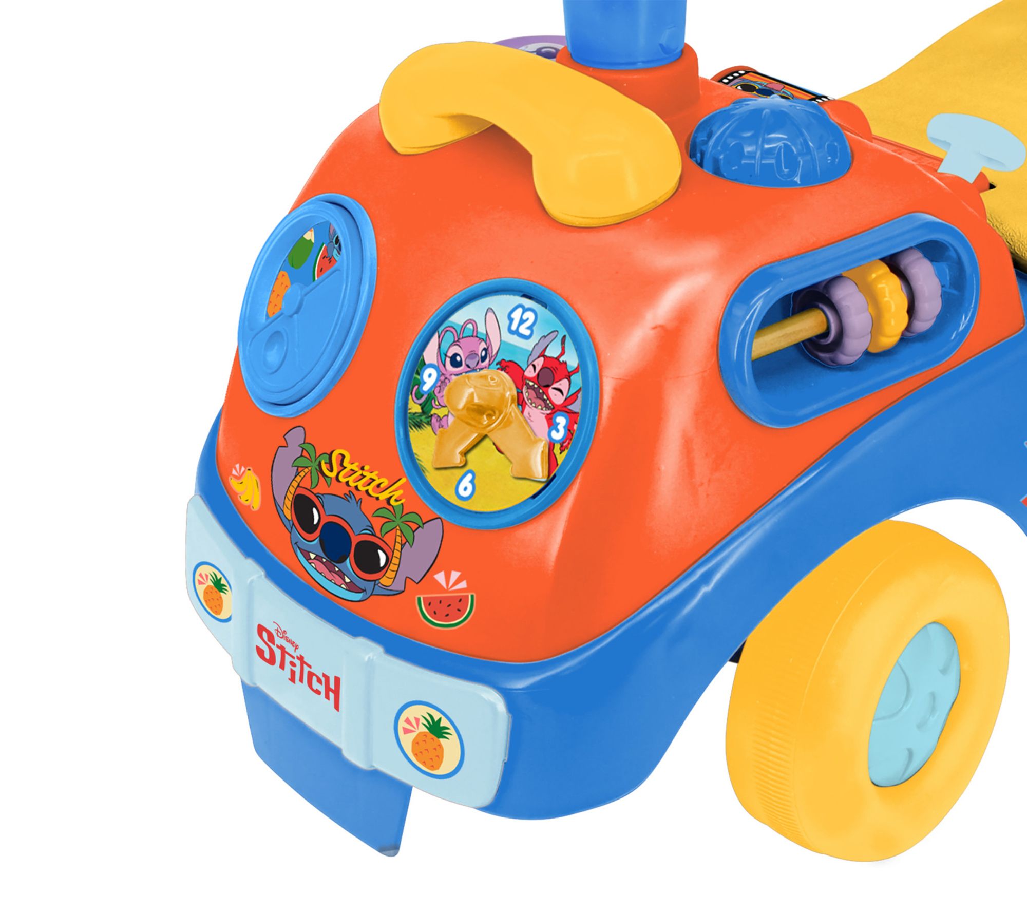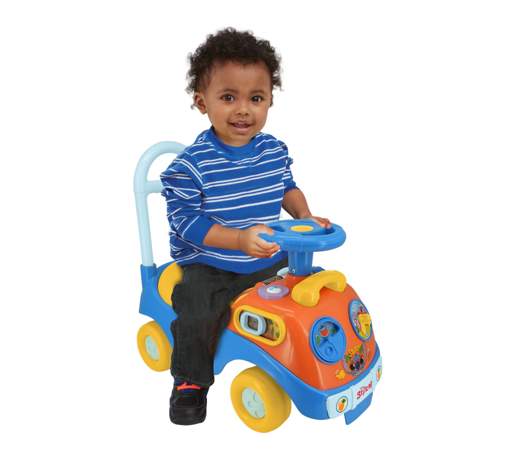 Every ride turns into an exciting adventure with this Stitch Lights N' Sounds Adventure Ride-On. Little ones can play, ride, and explore alongside Disney's Stitch as they enjoy flashing lights, cheerful sounds, and interactive dashboard activities for hands-on fun. A hidden storage compartment keeps favorite toys secure while the sturdy seat-back handle makes push-along play easy for developing walkers. From Kiddieland.