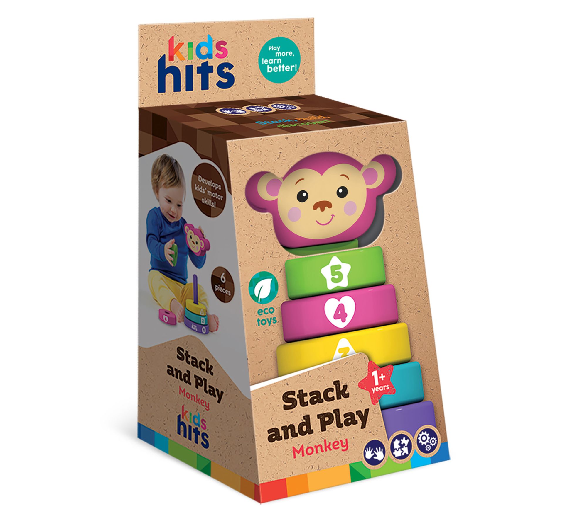 • Includes one wooden Stack and Play, five stacking squares, one placeholder