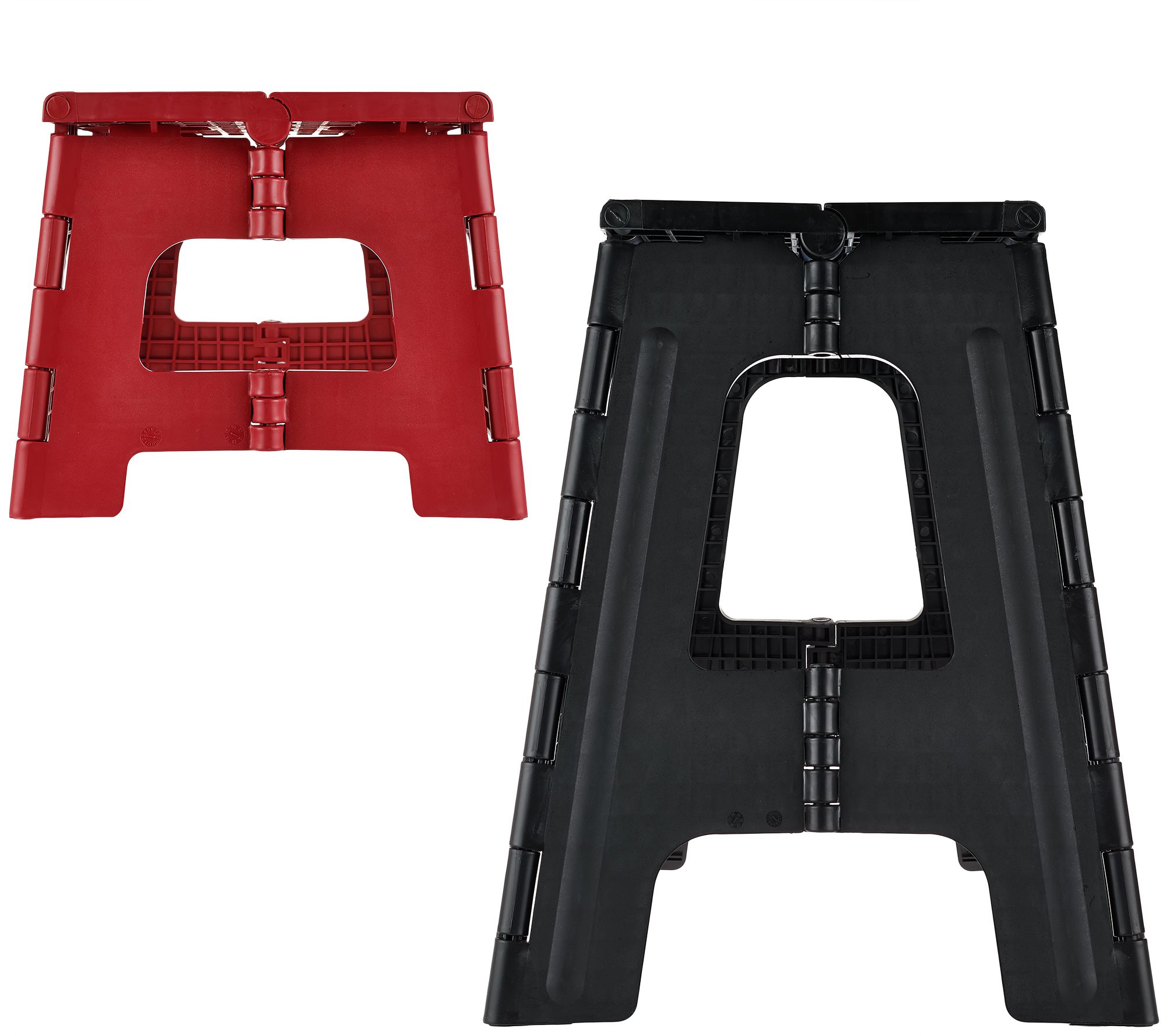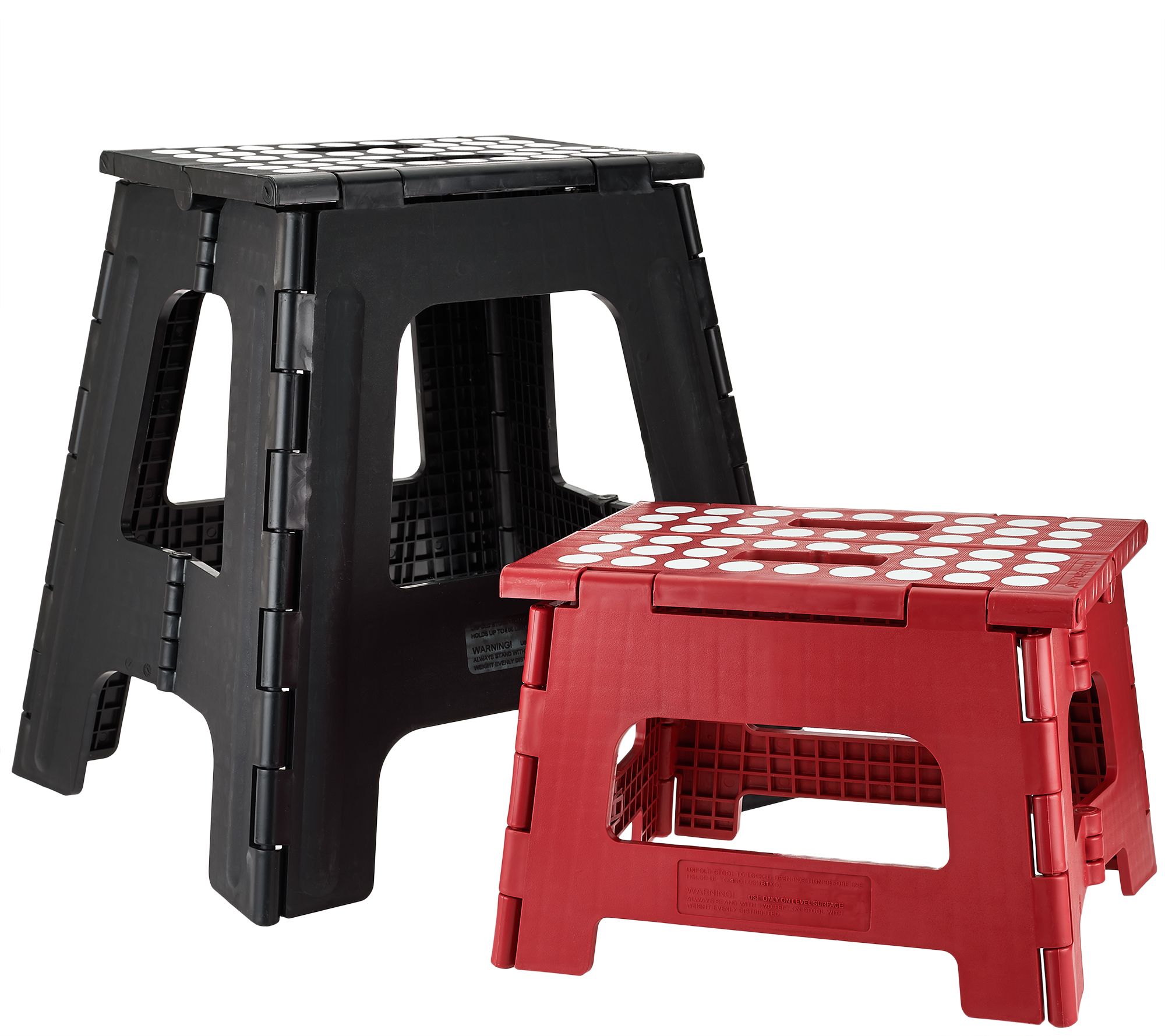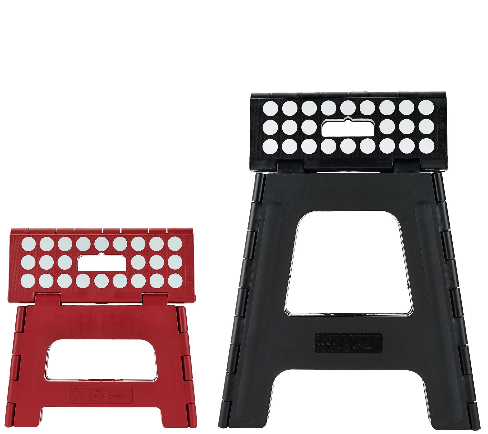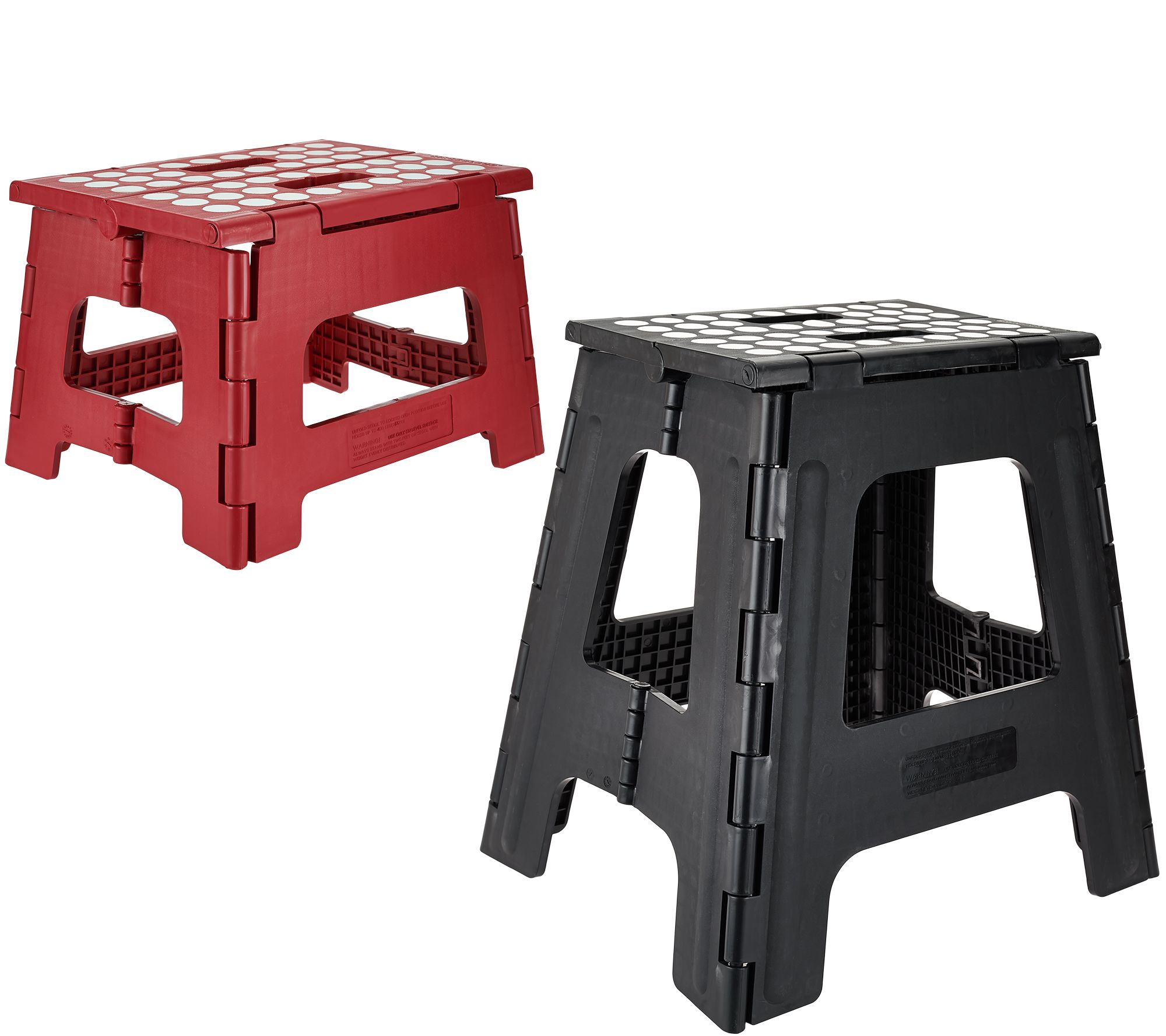 Measurements: Tall stool open 1/2"W x 15-1/2"H x 12-1/2"D, closed 15-1/2"W x 19-3/4"H x 1-3/4"D; Small stool open 11-3/4"W x 8"H x 9-3/4"D; closed 11-3/4"W x 12-1/4"H x 1-1/4"D