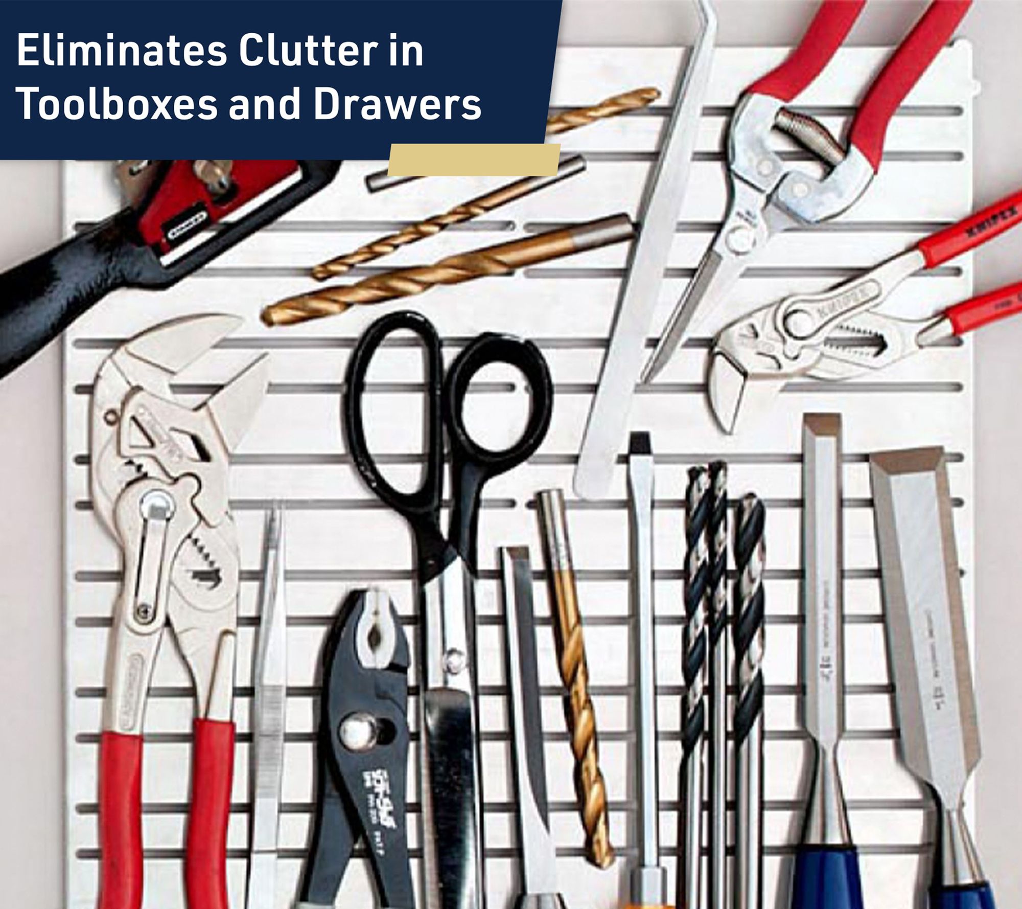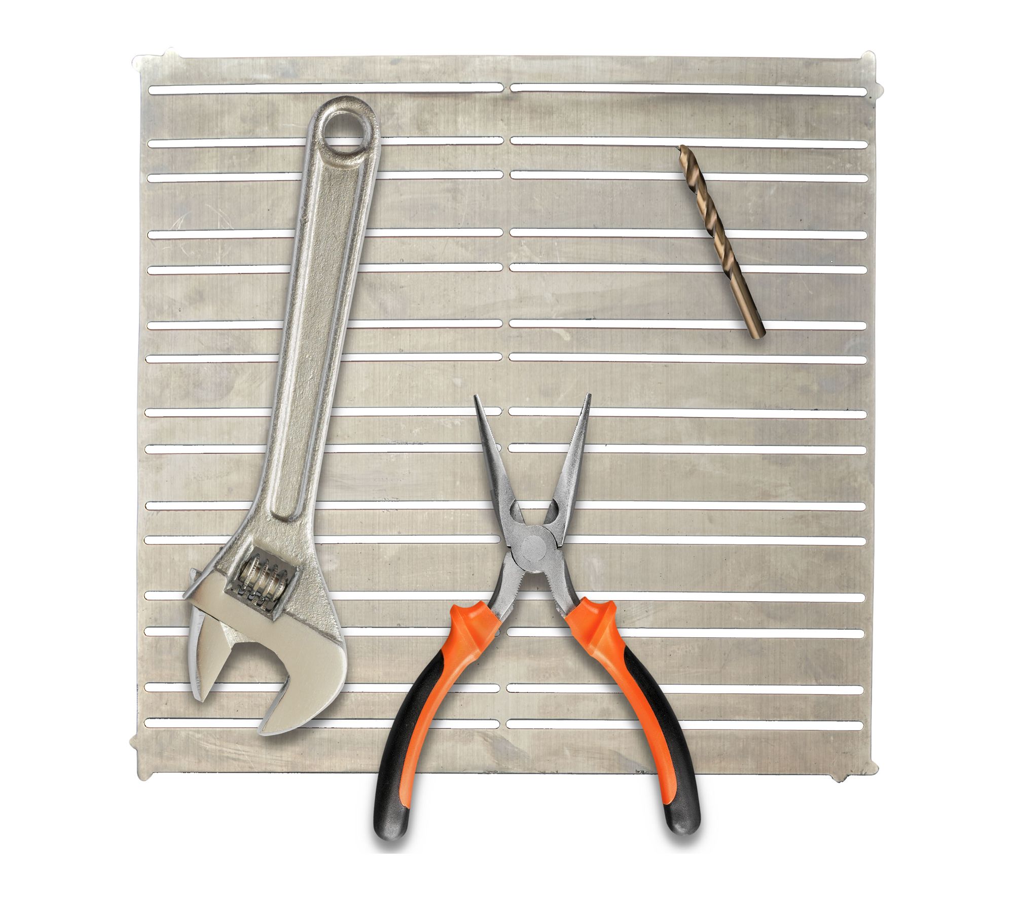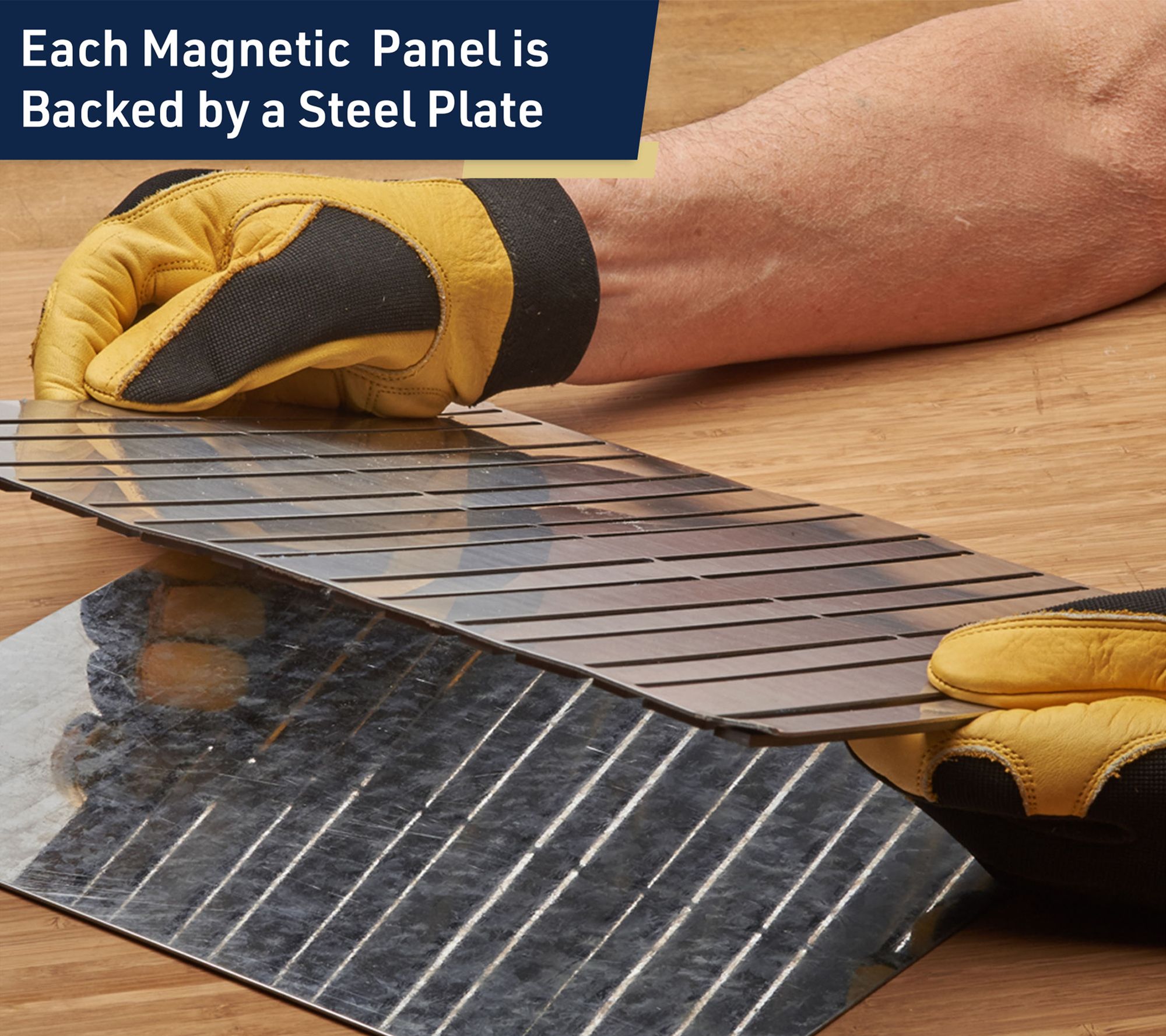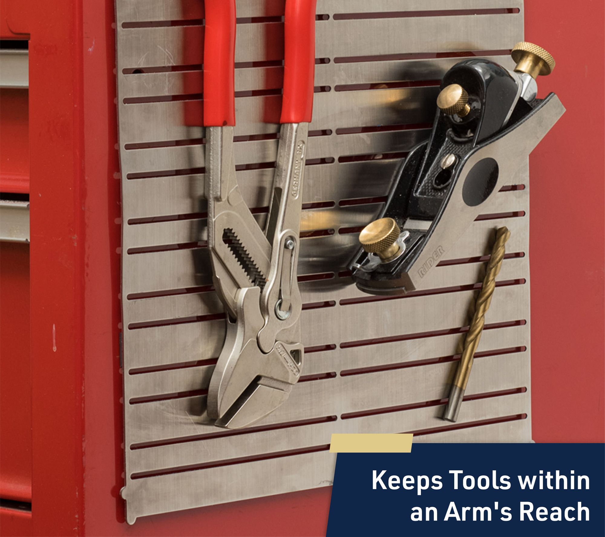 • Sheet steel panel with strongly magnetized surface holds most steel tools and hardware