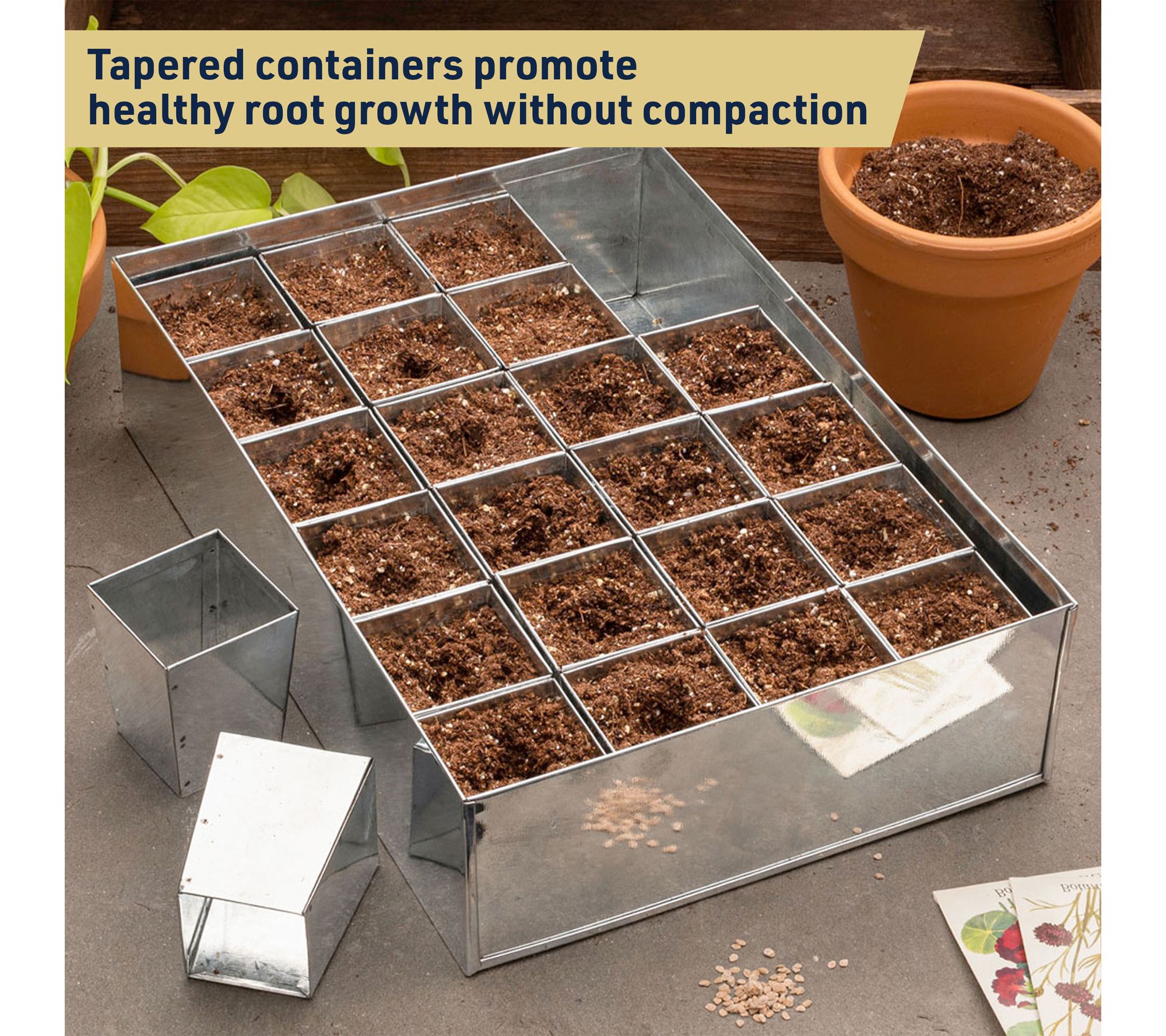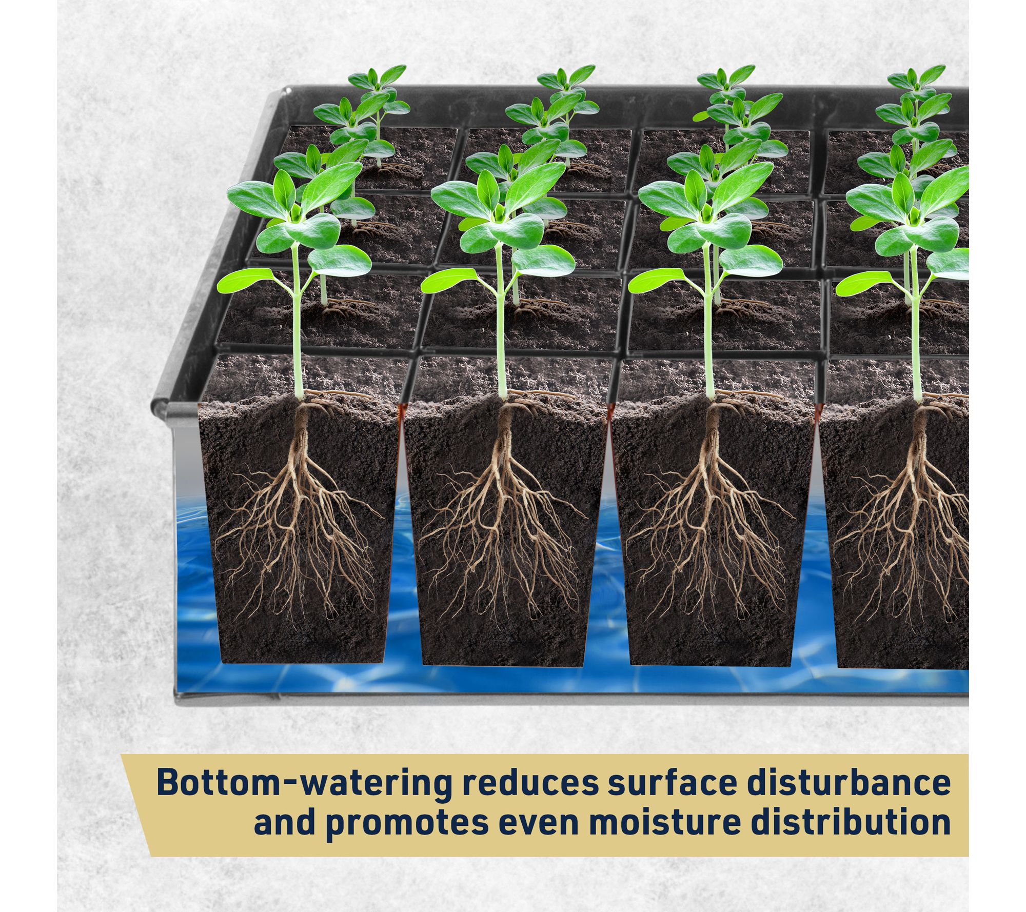 • Open-bottom pots allow for bottom watering and promote healthy seedlings
