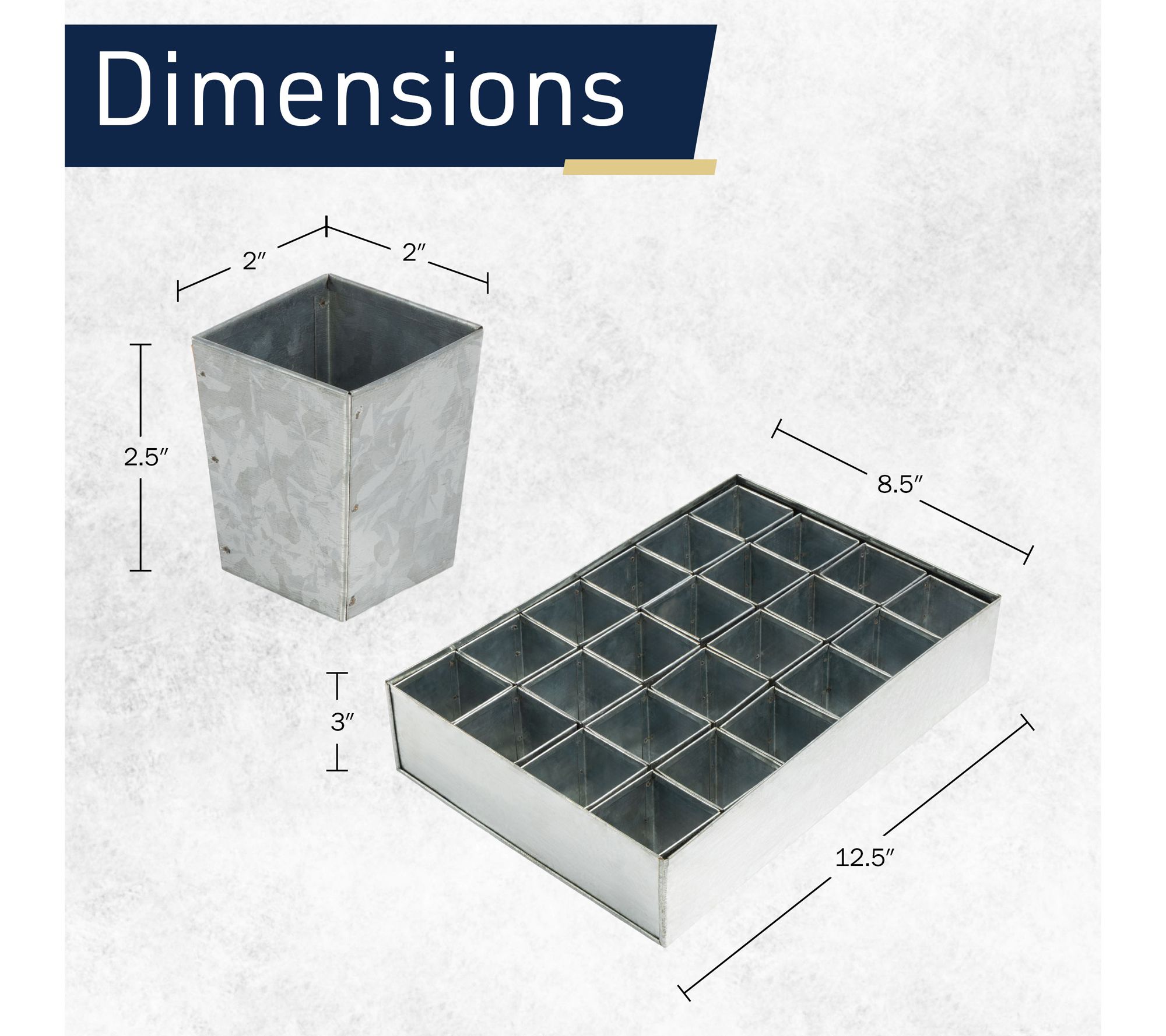 • Product dimensions: tray 12.5" L x 8.5" W x 3" H; individual insert 2" L x 2" W x 2.5" H