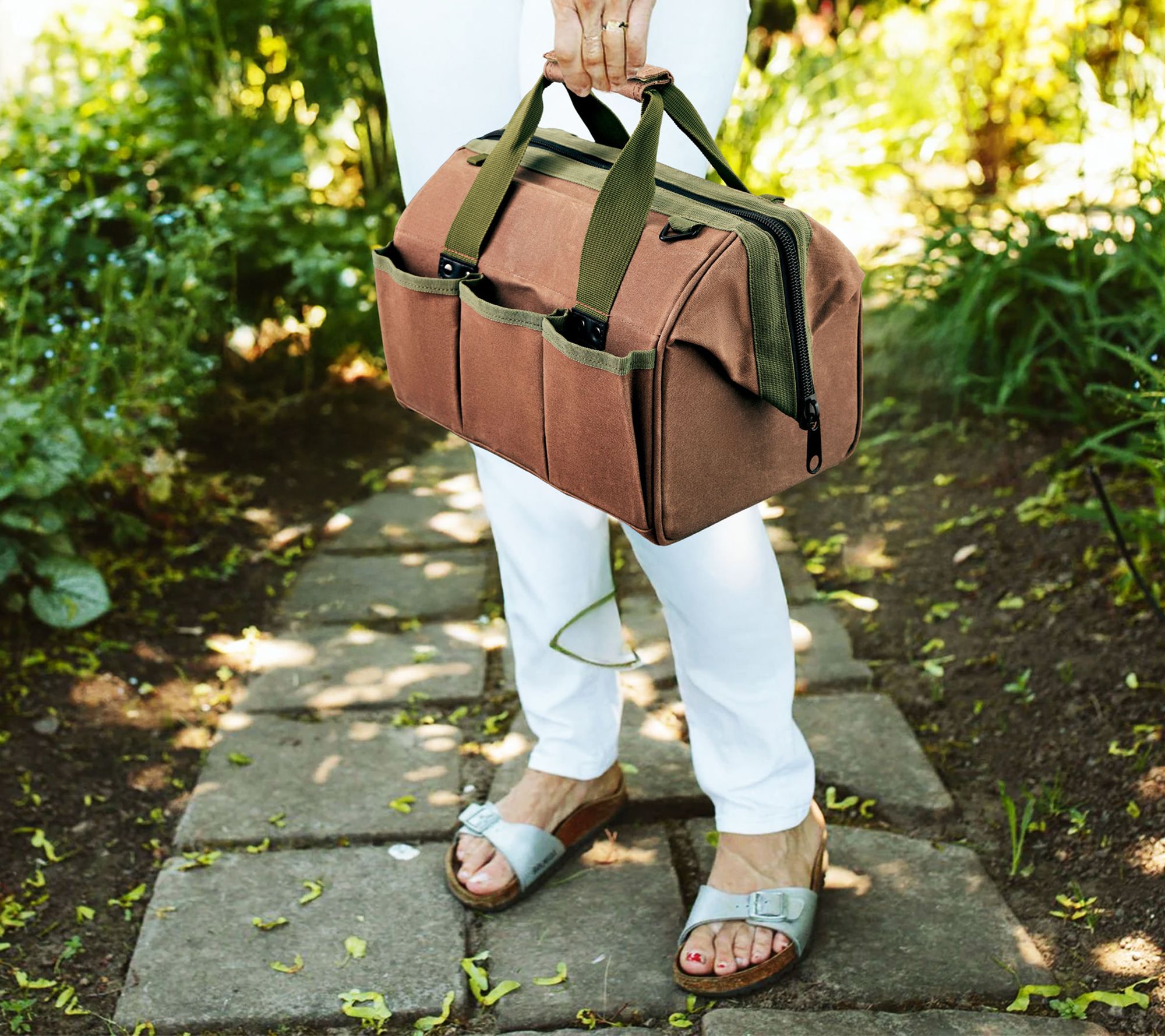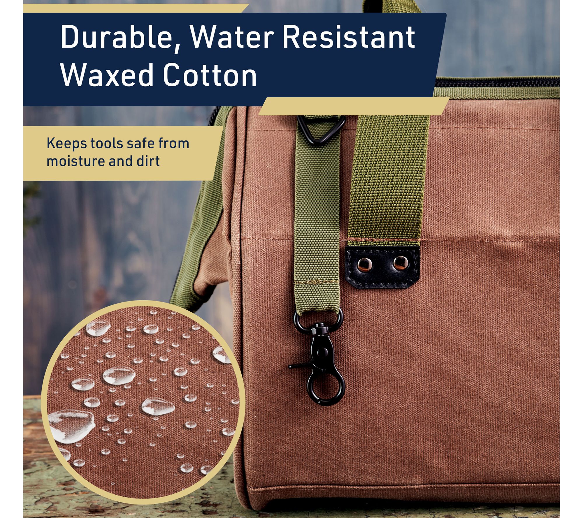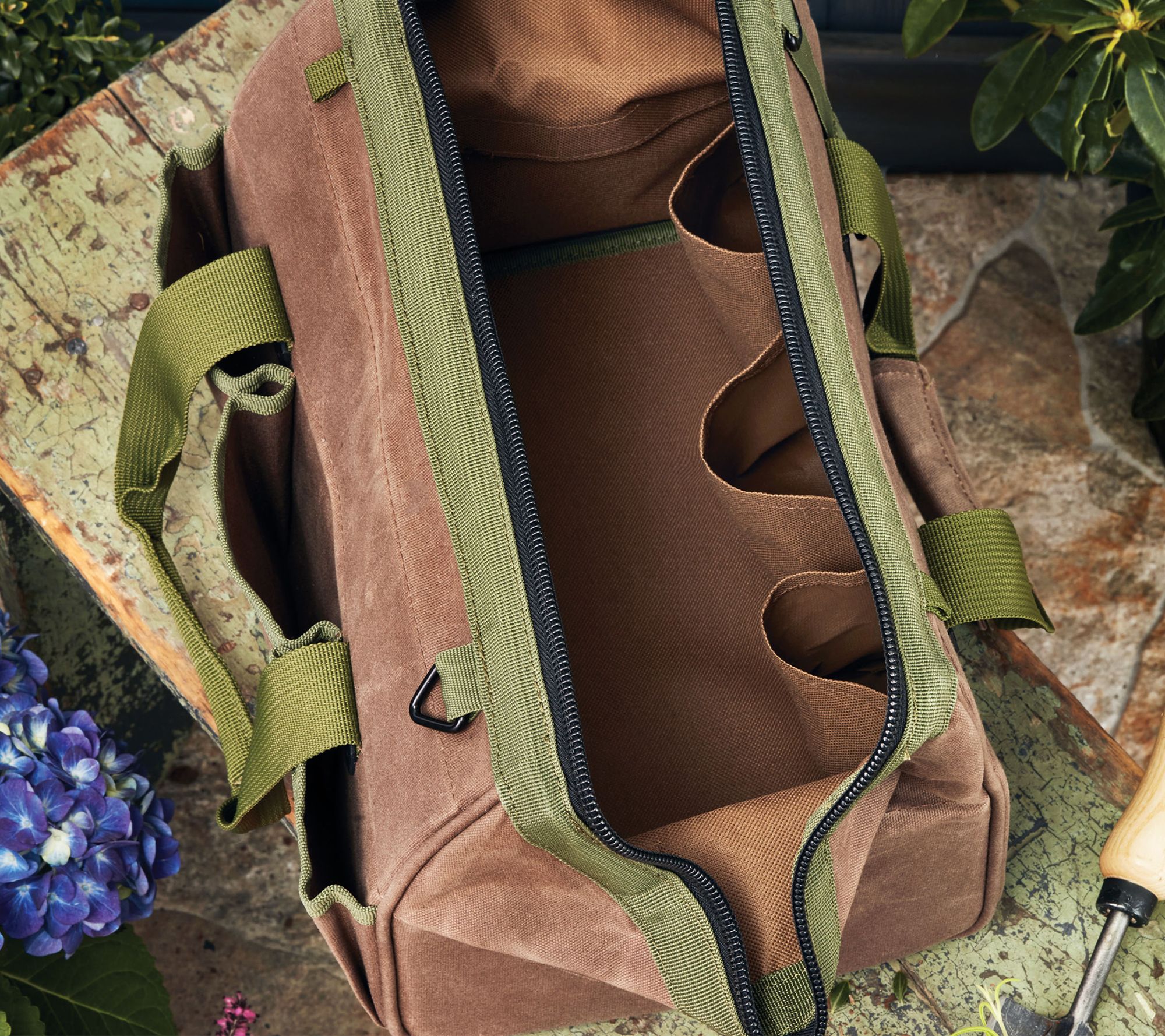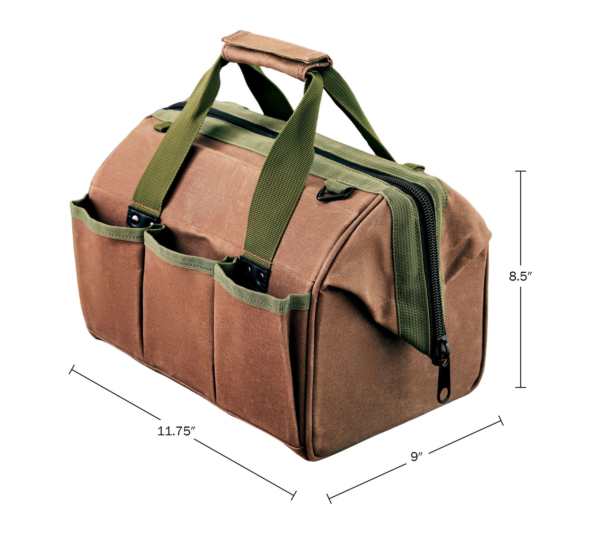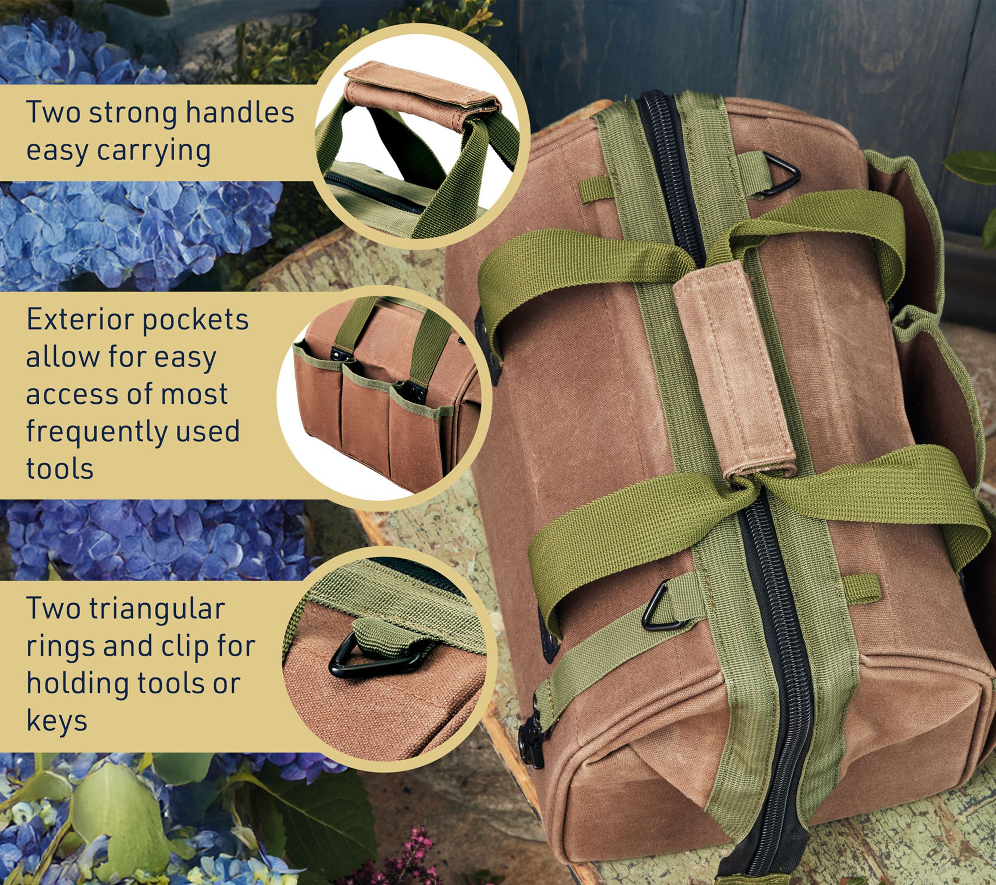 Bring order to your workspace or garden with this sturdy waxed canvas tool bag. Offering spacious compartments, secure pockets, and easy-access rings for your favorite tools or keys, this tote ensures everything you need is always within reach. Whether you're tackling projects in the garage or harvesting in the yard, its classic doctor's bag silhouette makes organization simple and stylish. From Kings County Tools.