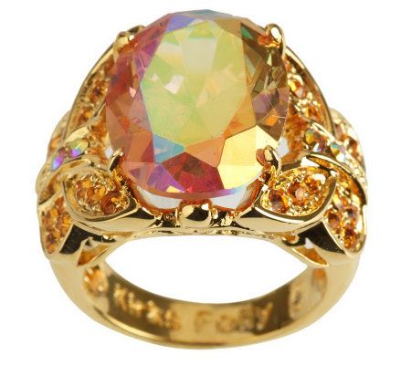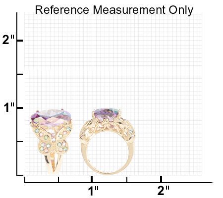 Kissed with aurora borealis crystal-encrusted butterflies, this ring boasts a large, oval, faceted aurora borealis crystal at the top. The butterflies accent each side, leading to the polished, split shank. From Kirks Folly.
